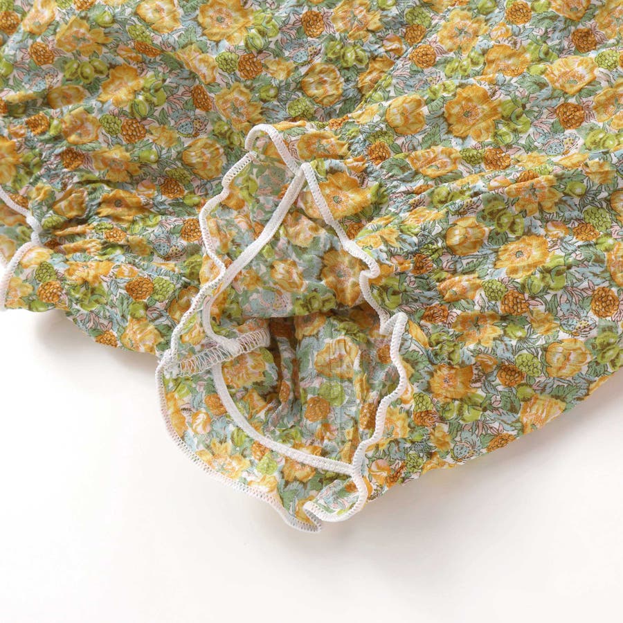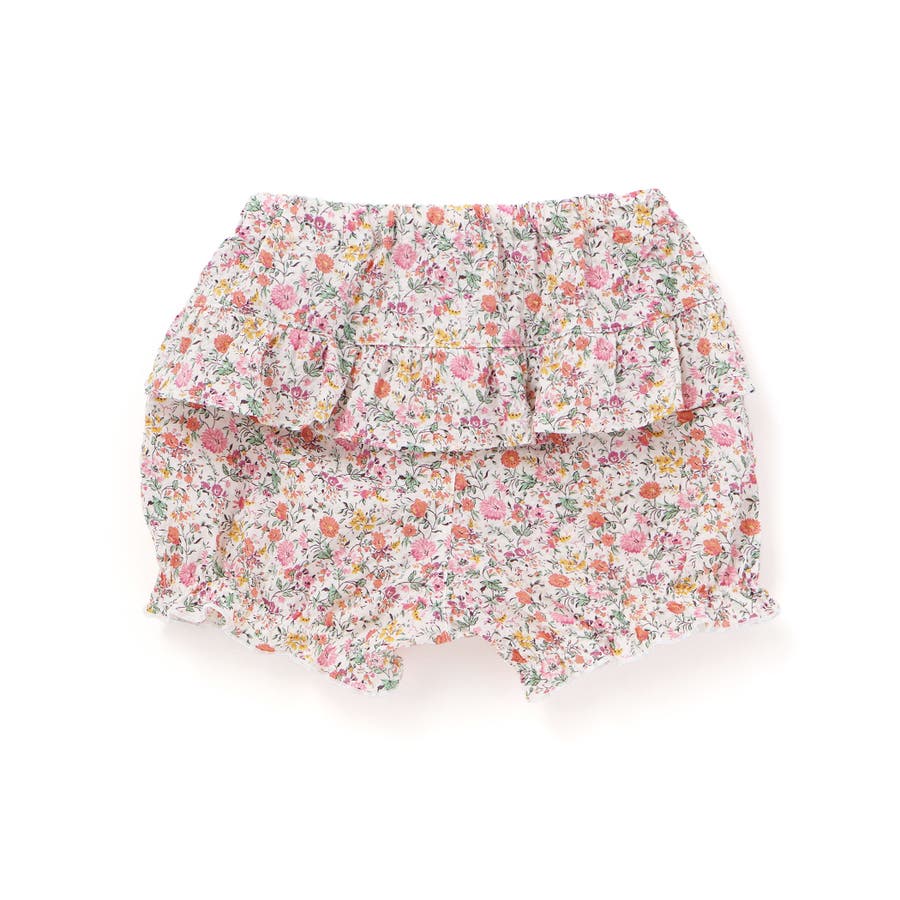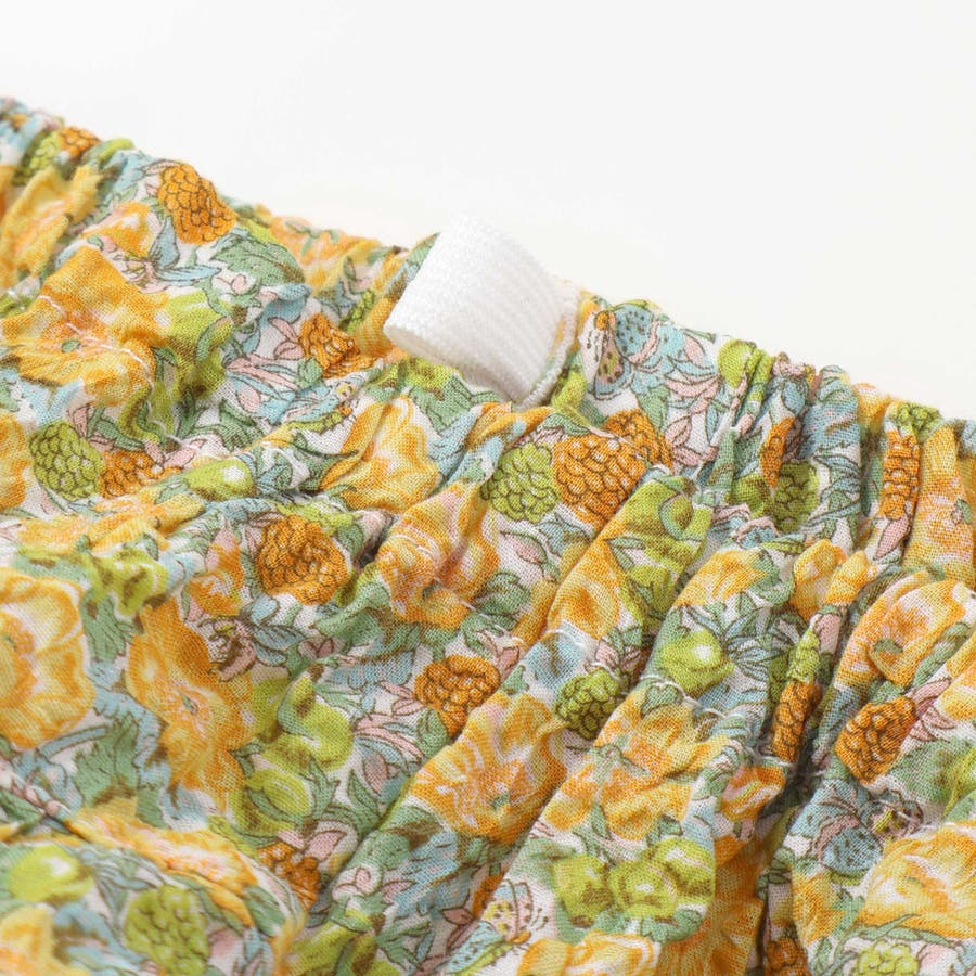 フリルとブルマには上品なリバティプリントを引き立てる 薄手で柔らかなミラクルウェーブローン素材を使用しています。