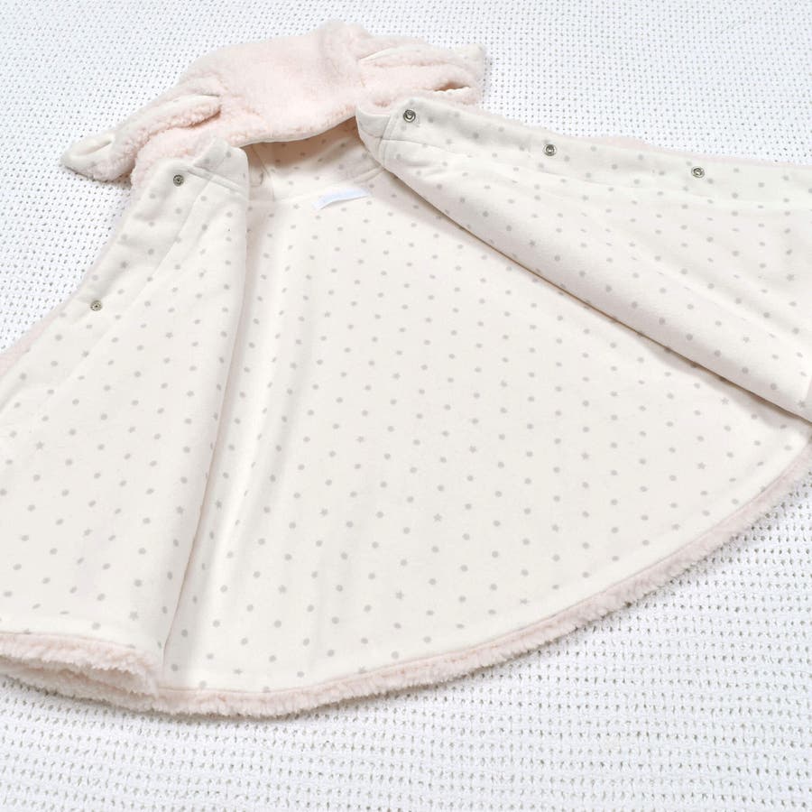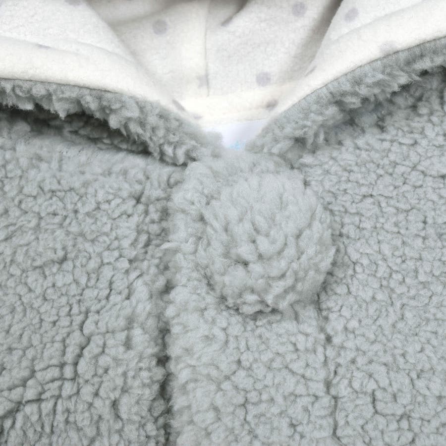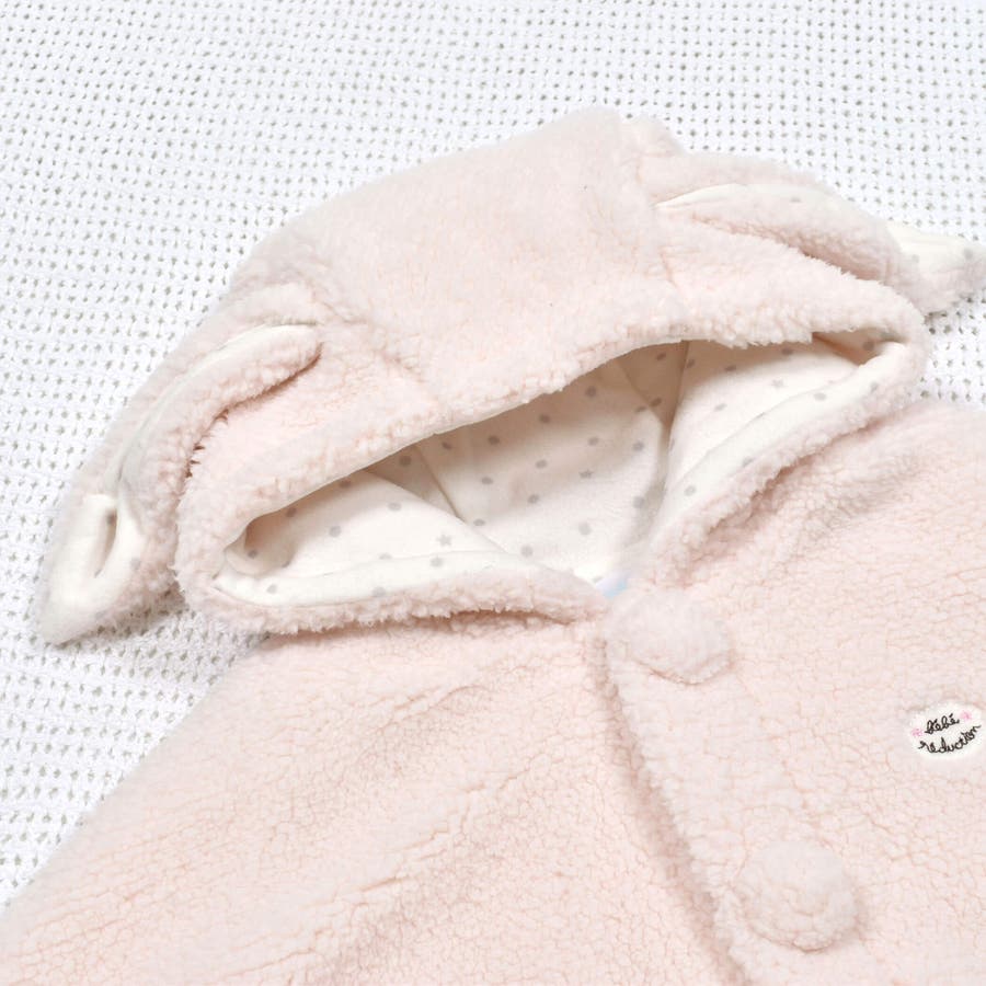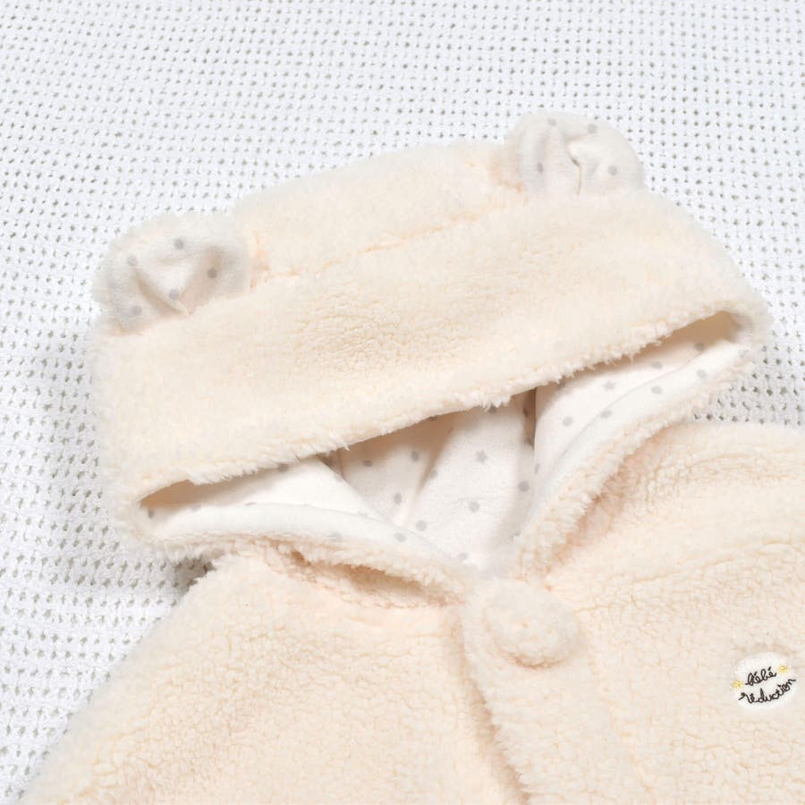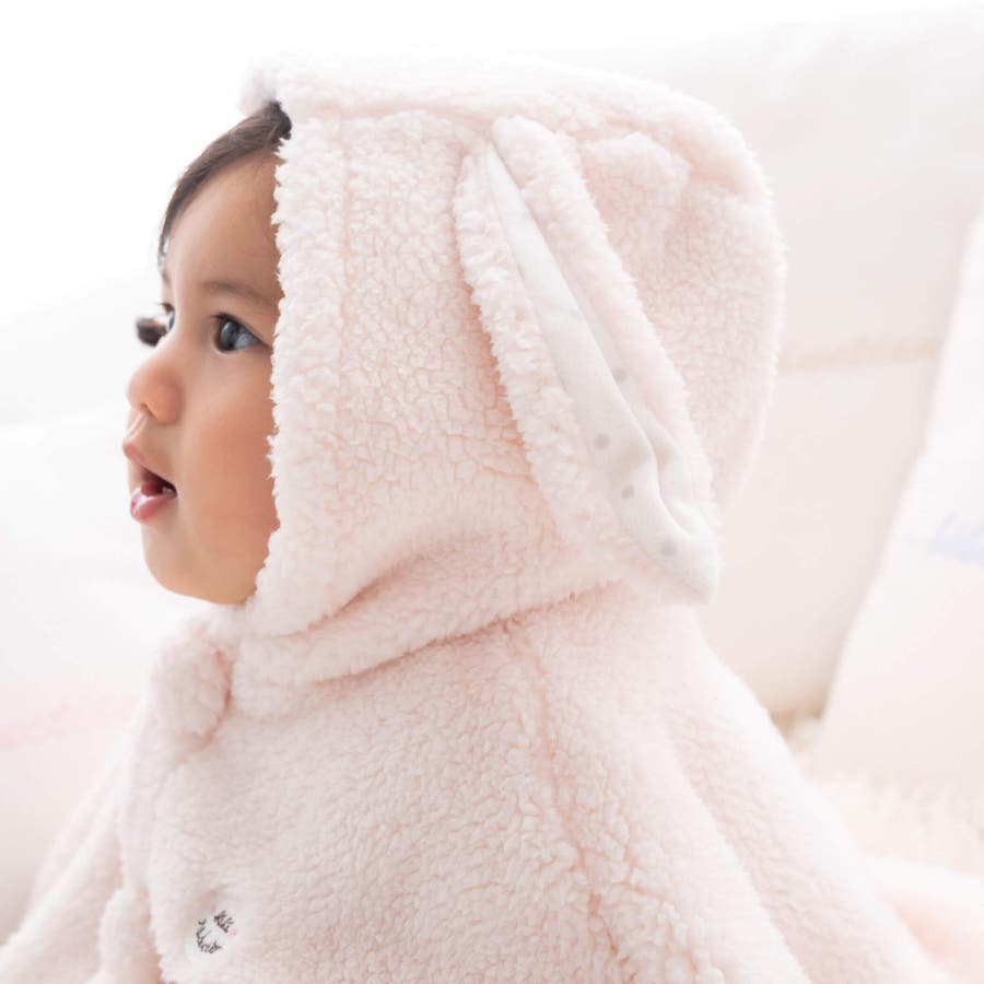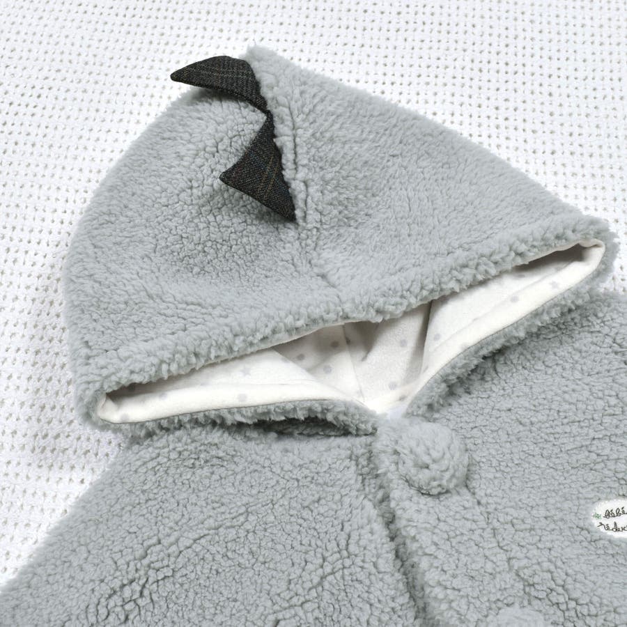 耳が立体になったフードはライトピンク(ピンク)はうさぎさん、アイボリー(オフホワイト)はクマさん、グリーングレー(グリーン)は恐竜になっています。
