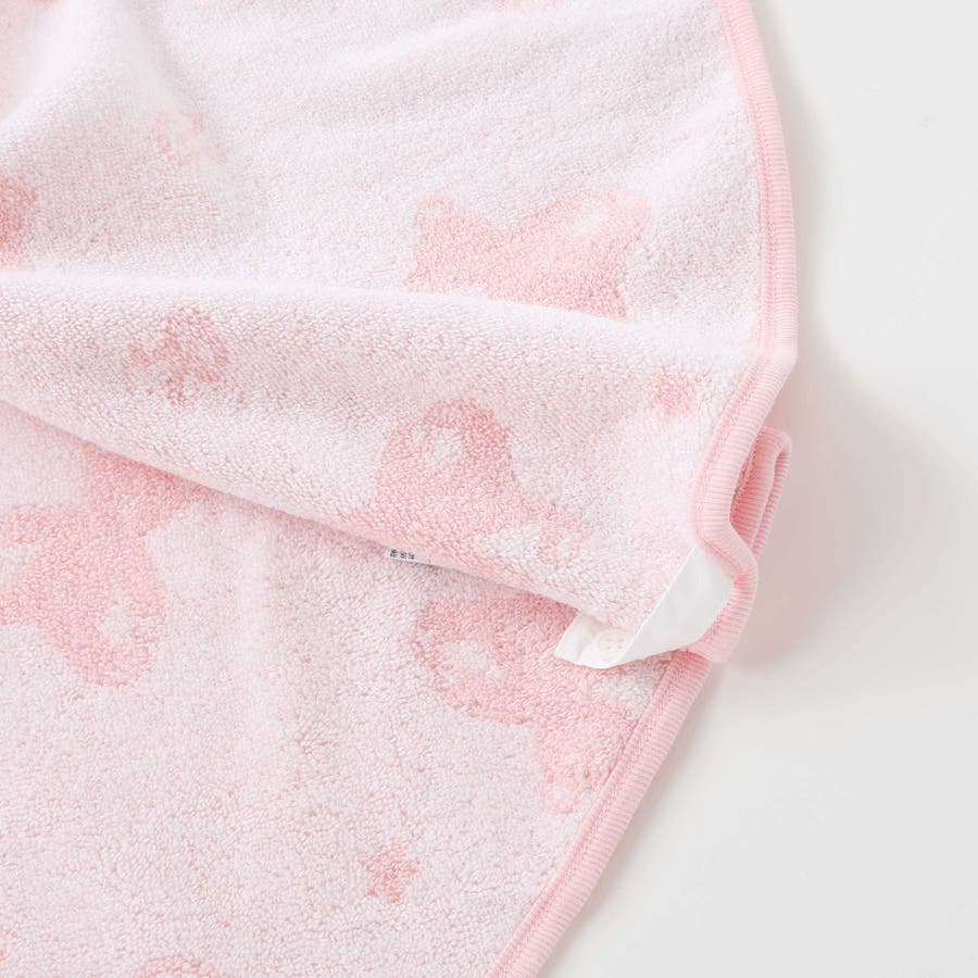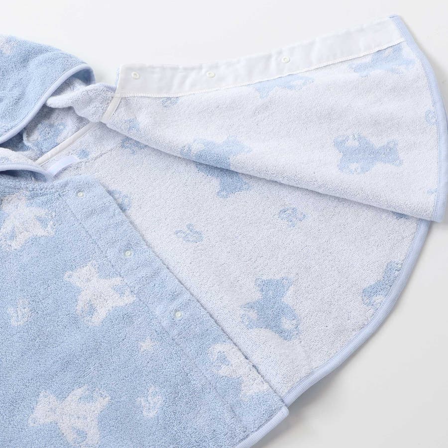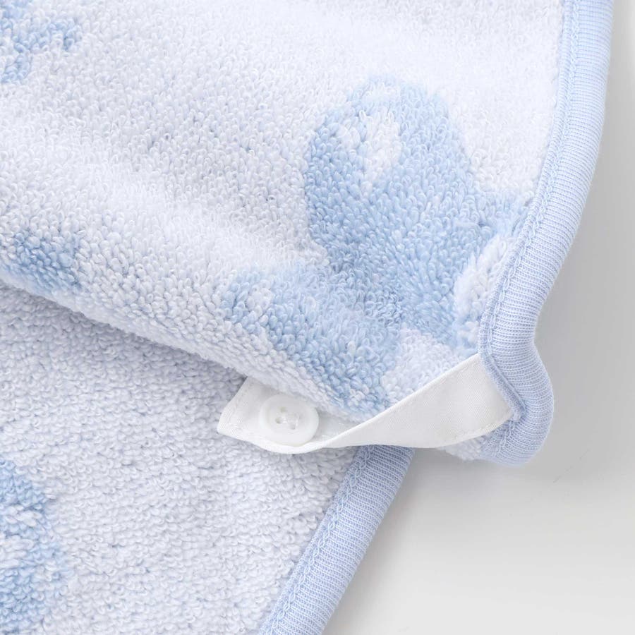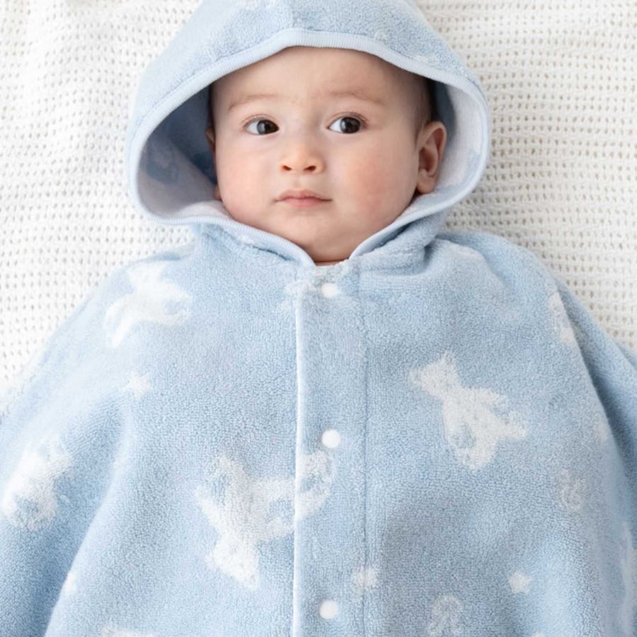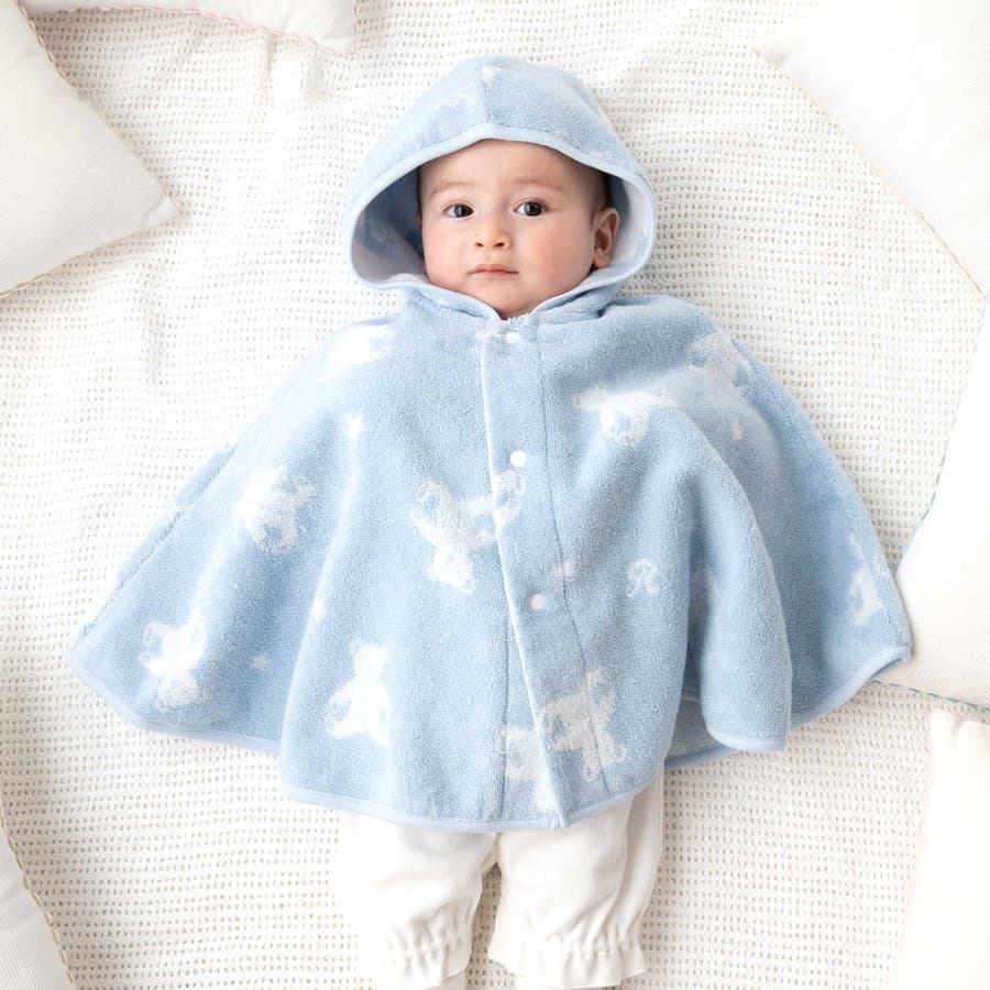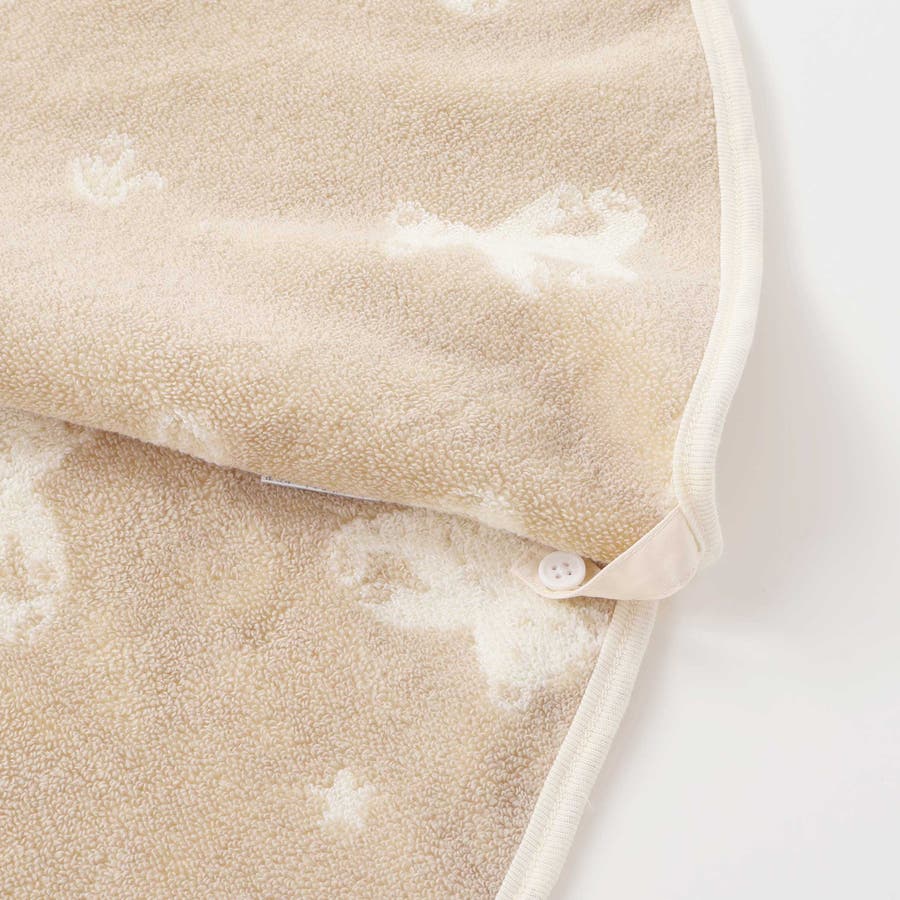 前はホックで着脱できるので、ねんね時には膝掛けやおくるみとして、 首がすわったら、ケープとしてご着用いただけます。