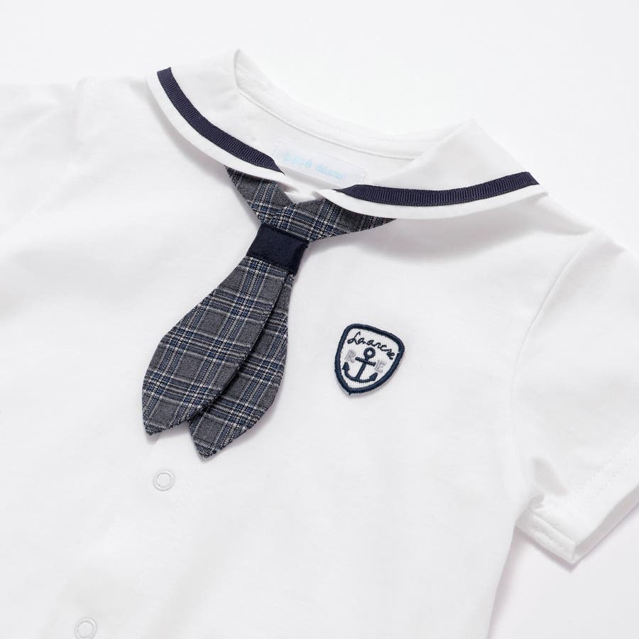 スナップで取り外しできるネクタイとイカリの刺しゅうのワッペンが上品な印象。