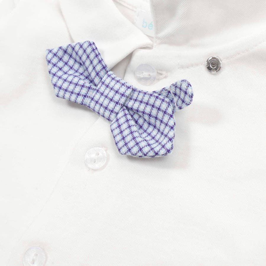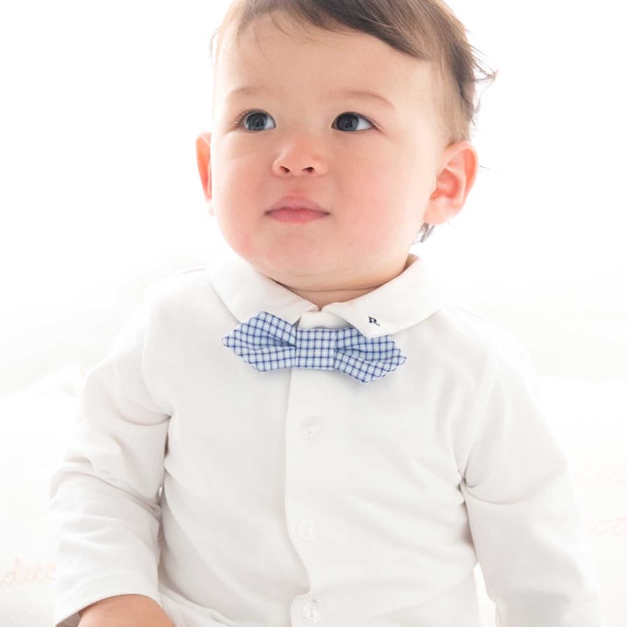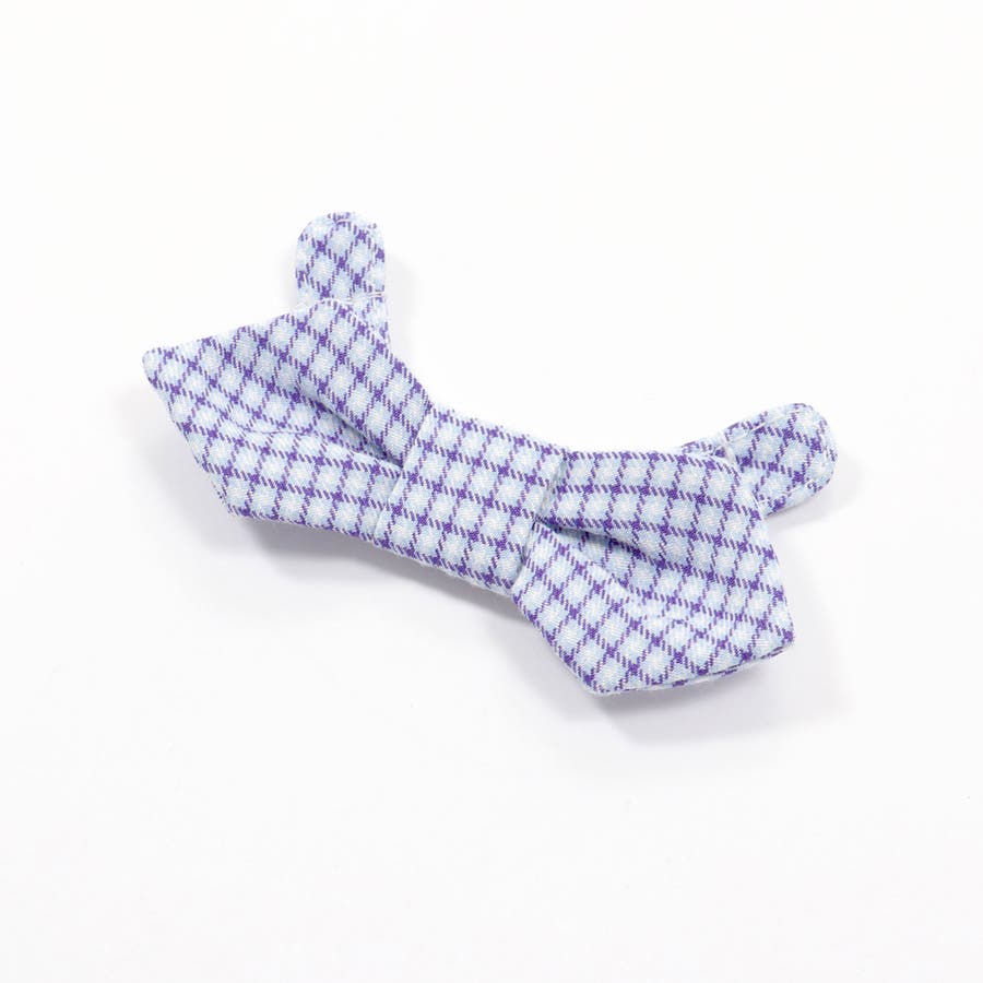 蝶ネクタイにブルー系のチェック柄を使用することで、可愛らしさとユニークな印象を与えています。