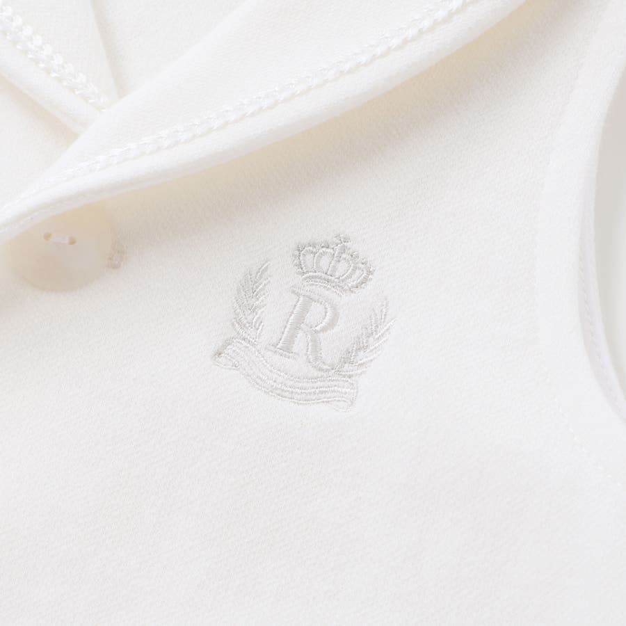 シンプルな中にも胸元のエンブレム風の刺しゅうなど、さりげないアクセントをプラス。
