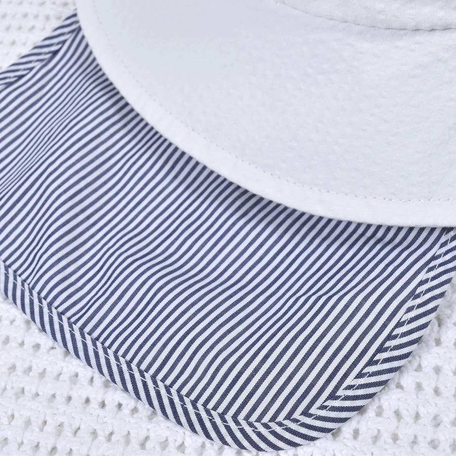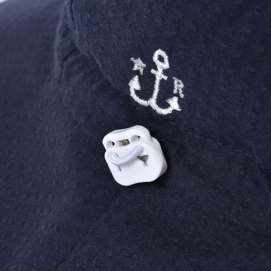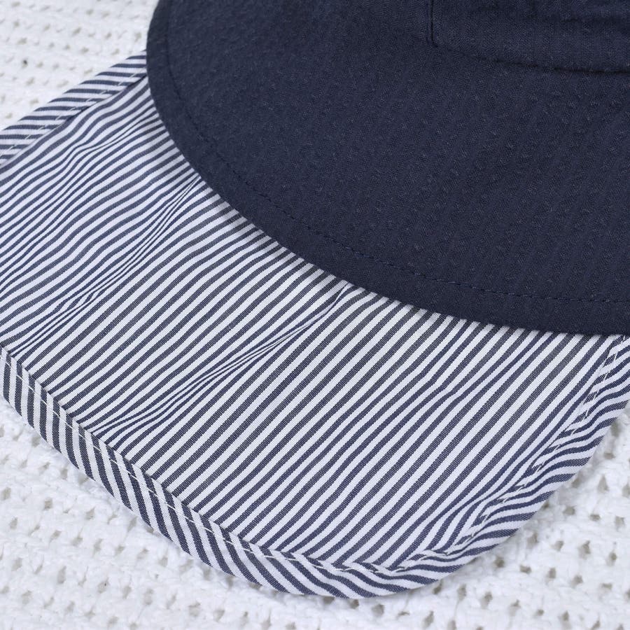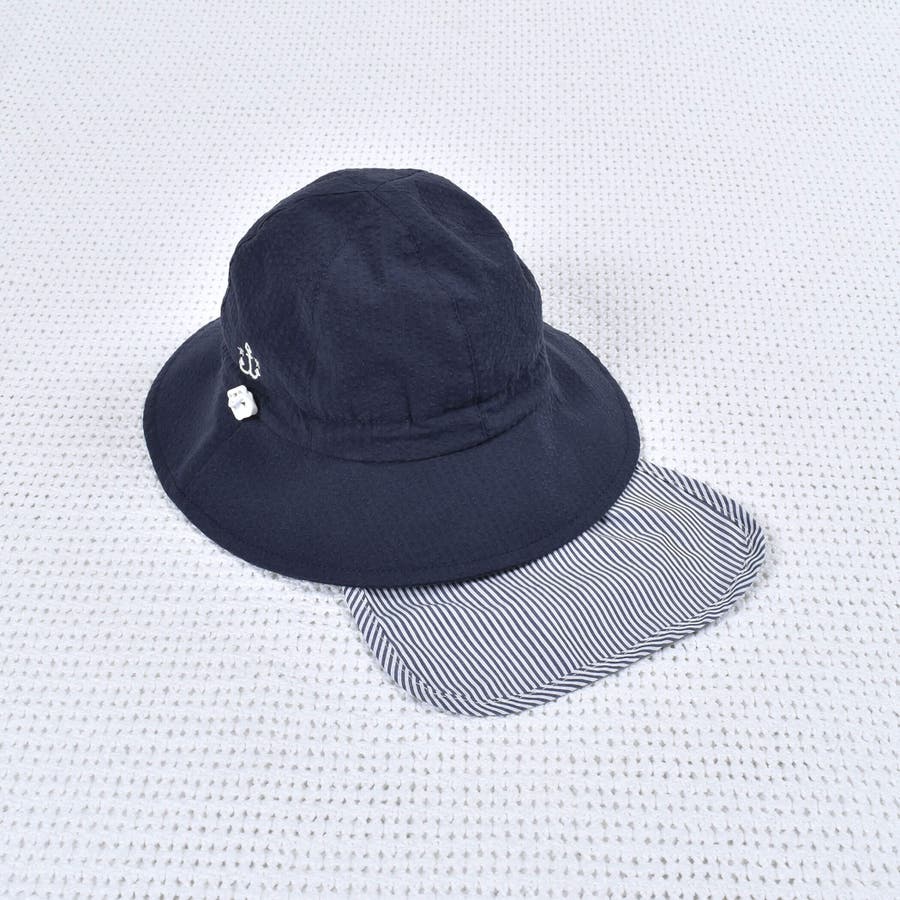 後ろにはボタンで取り外しが可能なストライプの日よけと調節可能なストッパー、あごゴム紐が付いているので風の強い日にも飛ばされる心配もなく安心です。