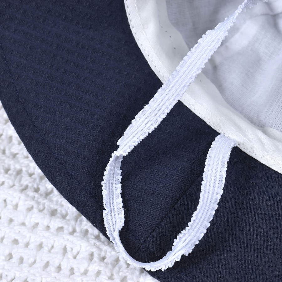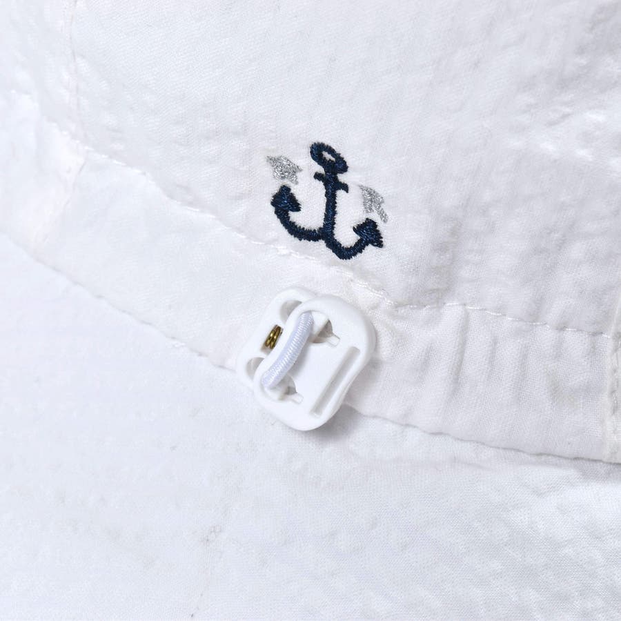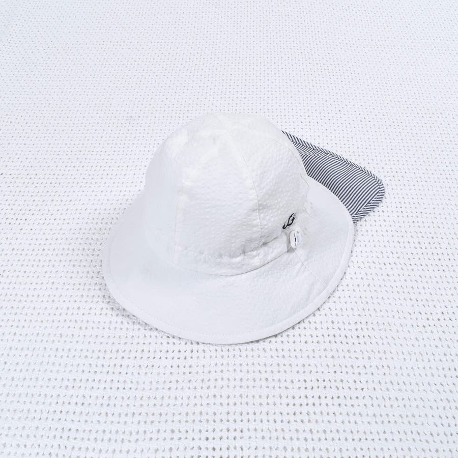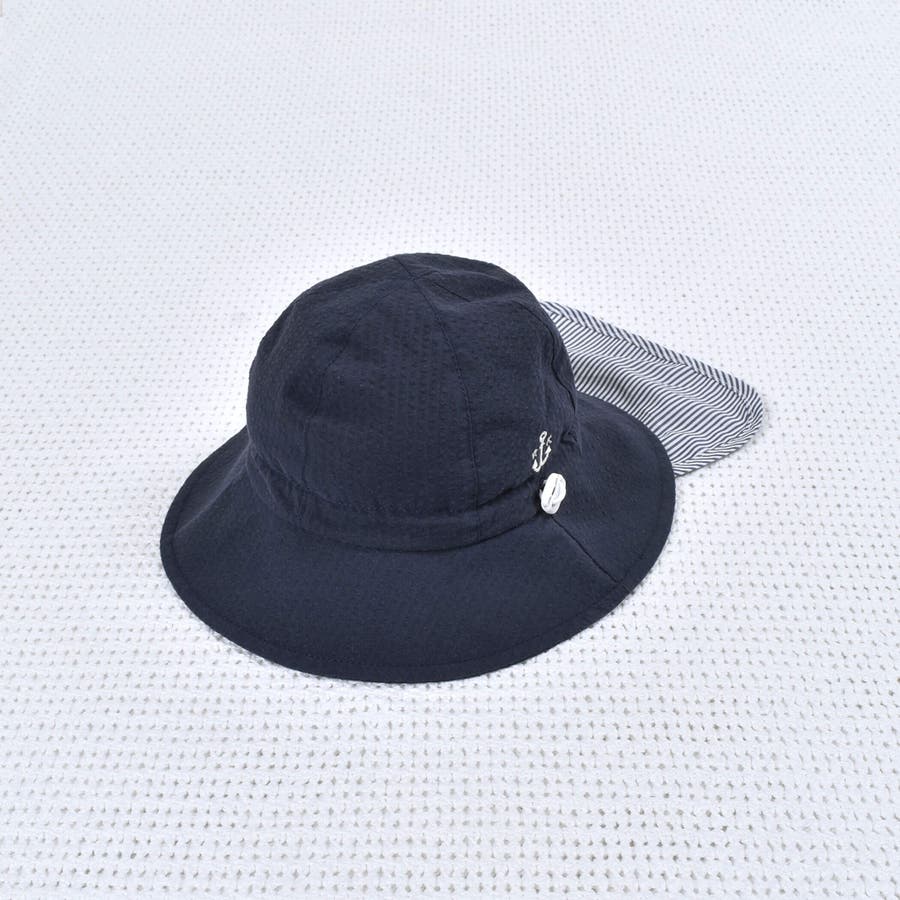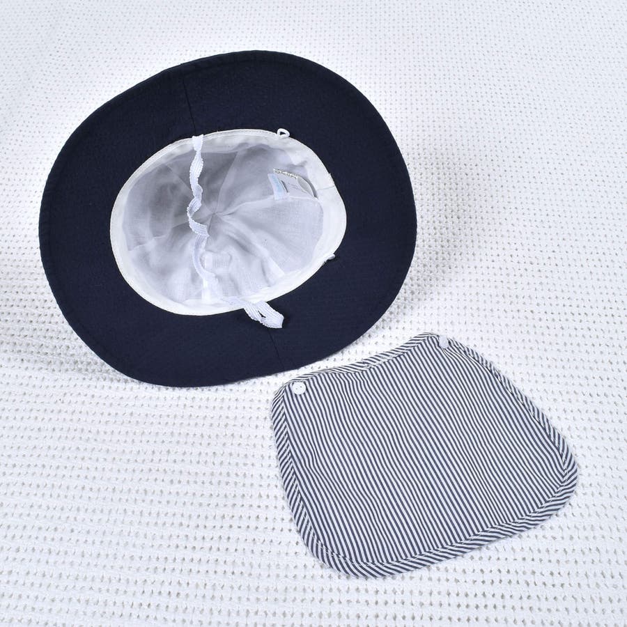 後ろにはボタンで取り外しが可能なストライプの日よけと調節可能なストッパー、あごゴム紐が付いているので風の強い日にも飛ばされる心配もなく安心です。