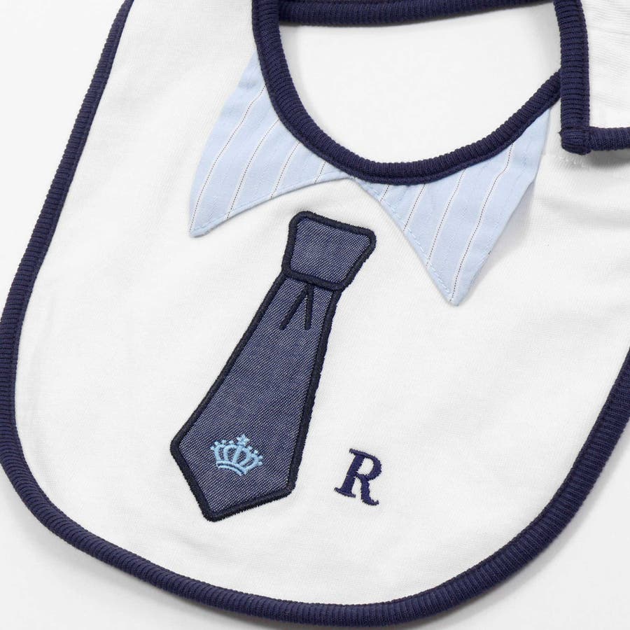 天竺素材の上品なストライプ柄の襟と刺しゅうのエンブレム、ボーダーのネクタイのパッチワークもポイント。