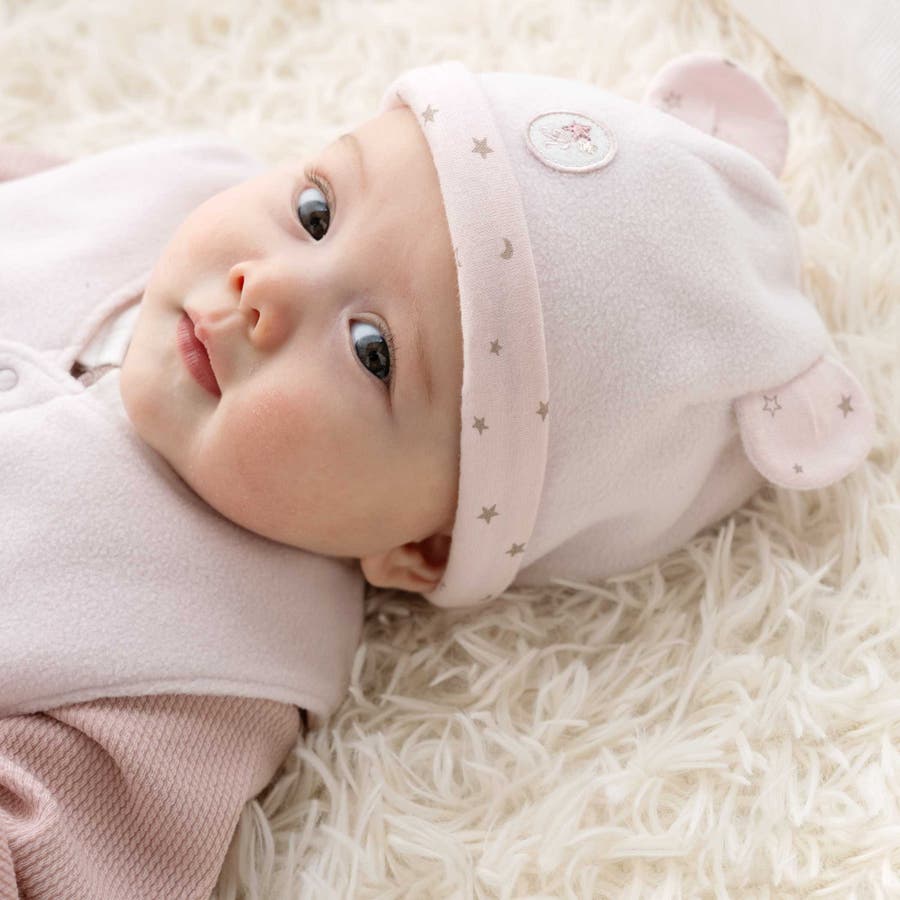 クマさんの耳がとってもキュートなベビー用フリースの男女兼用ニットキャップ。