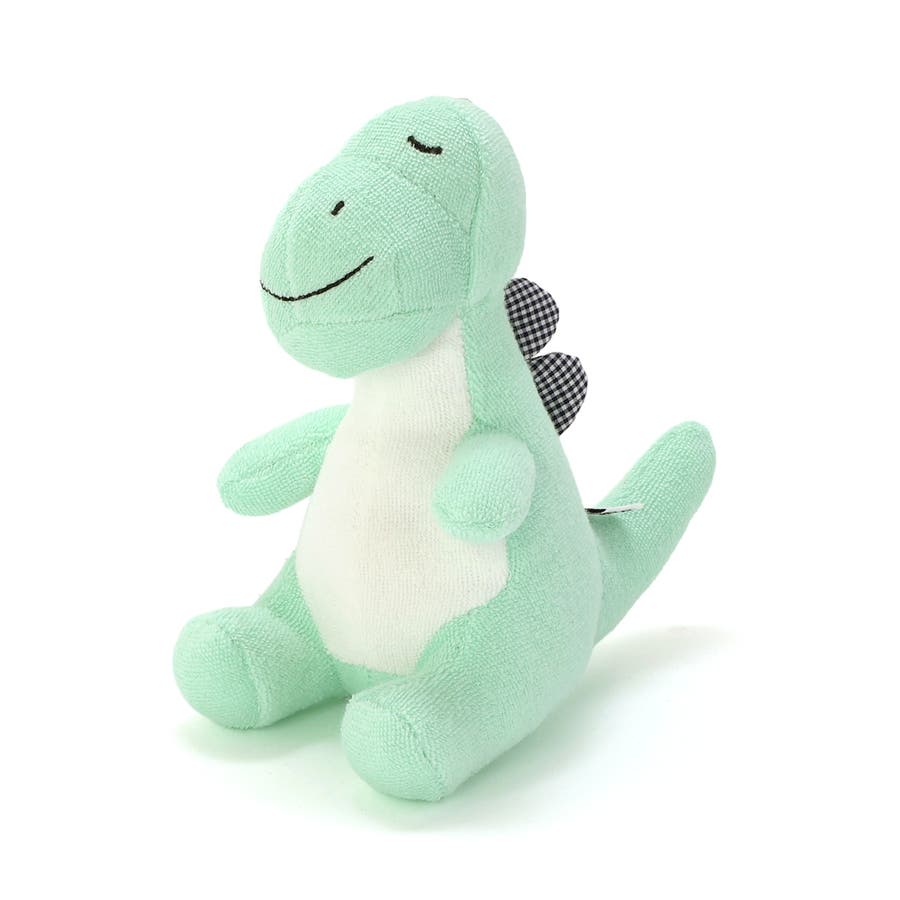 ギンガムチェックの背びれが可愛い、恐竜モチーフの男の子用ガラガラ。