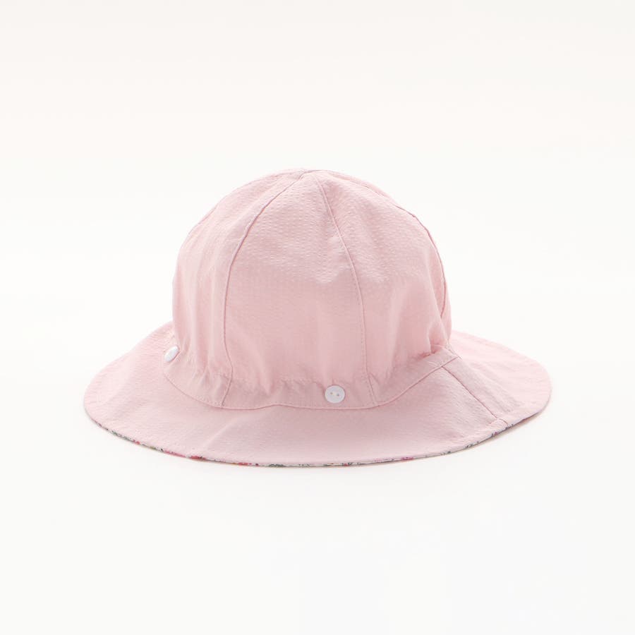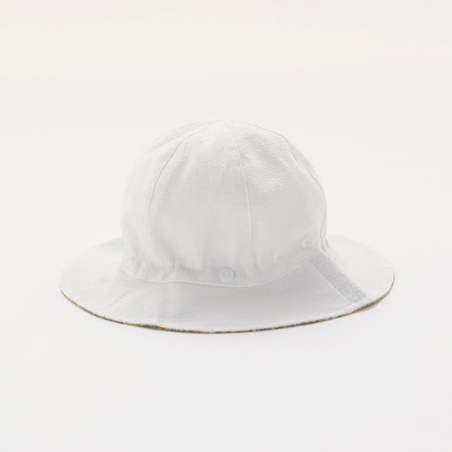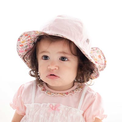 リバティプリントの可愛い花柄を部分使いした日よけ付きの女の子用ハットです。