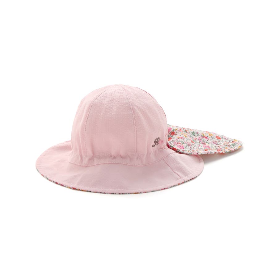 ハット後ろ側に配した、大きな可愛いリボンはボタンで取り外し可能で、真ん中のホックを外してリボンを広げてると首元が隠れる日よけにもなります。