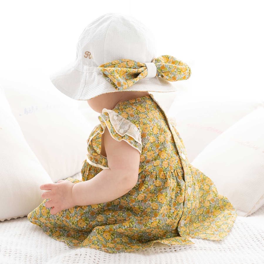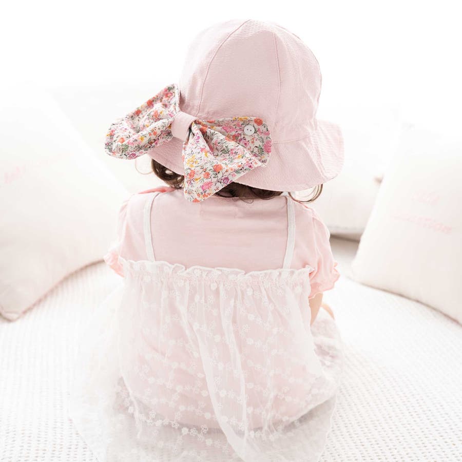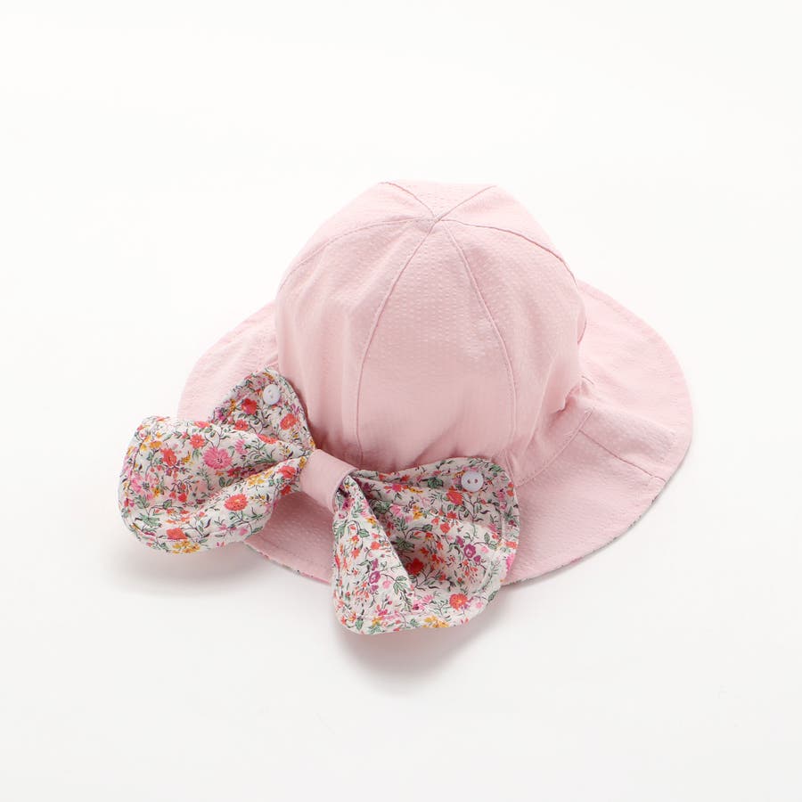 つば裏と後ろのリボン部分にリバティプリントを使用し、ピンクとイエローの2色展開です。