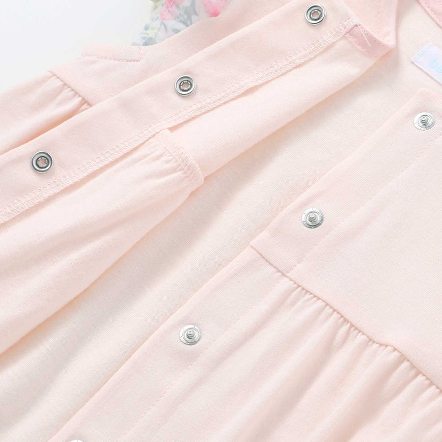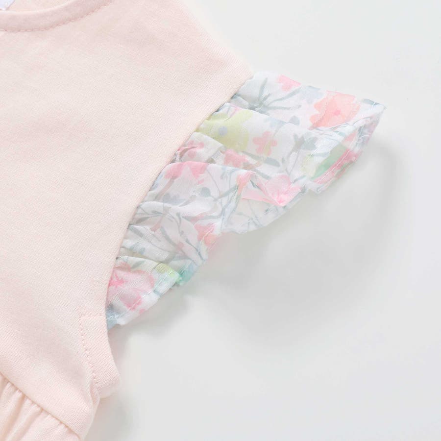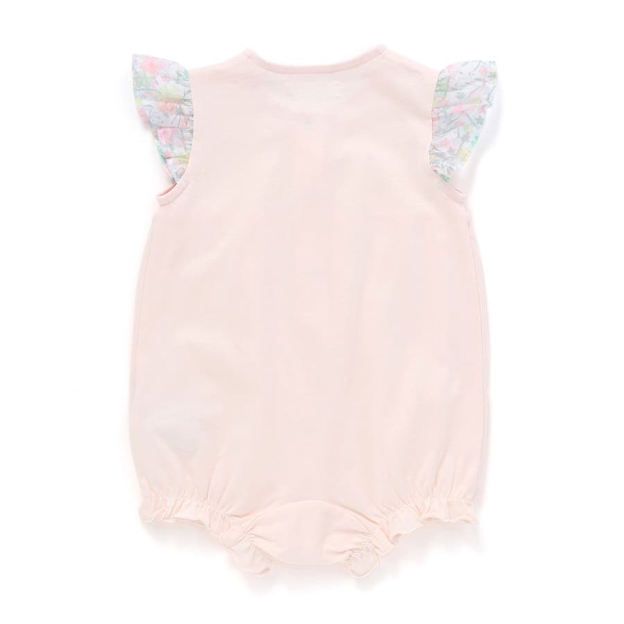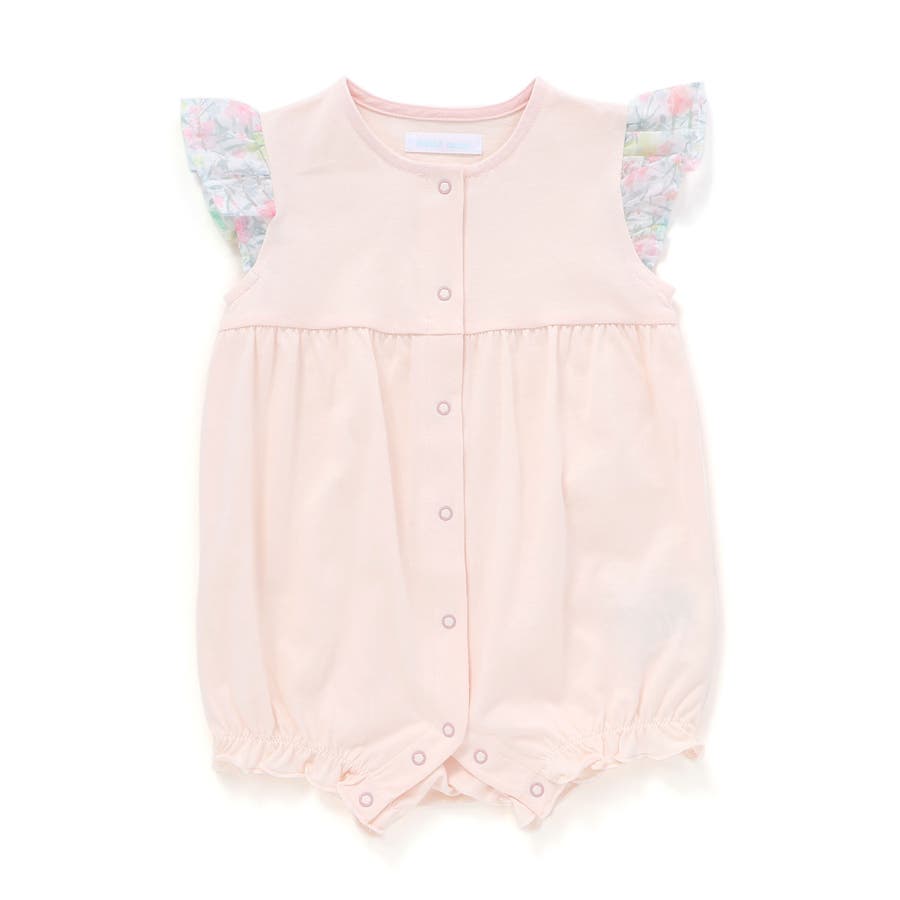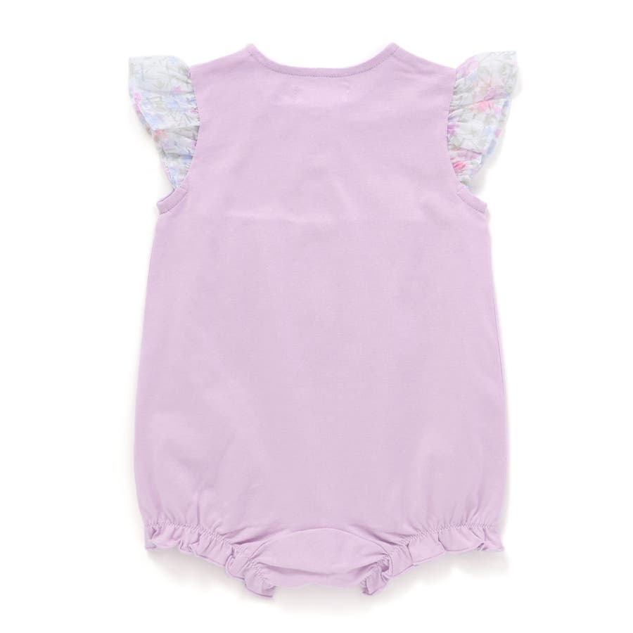 カバーオールは天竺素材でお袖のフリルがオーガンジー花プリントでチュニックのスカート部分と同じ素材感です。