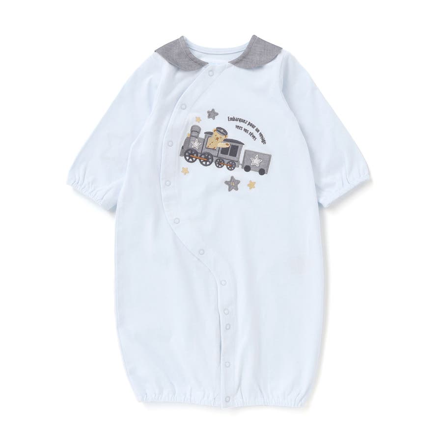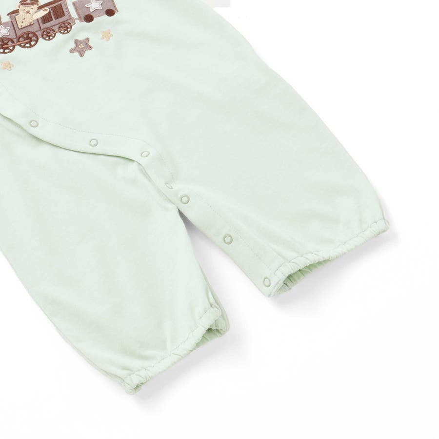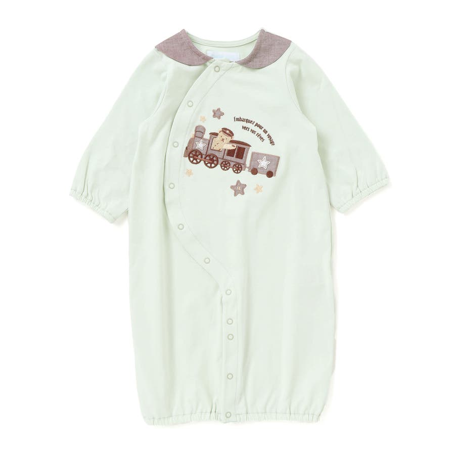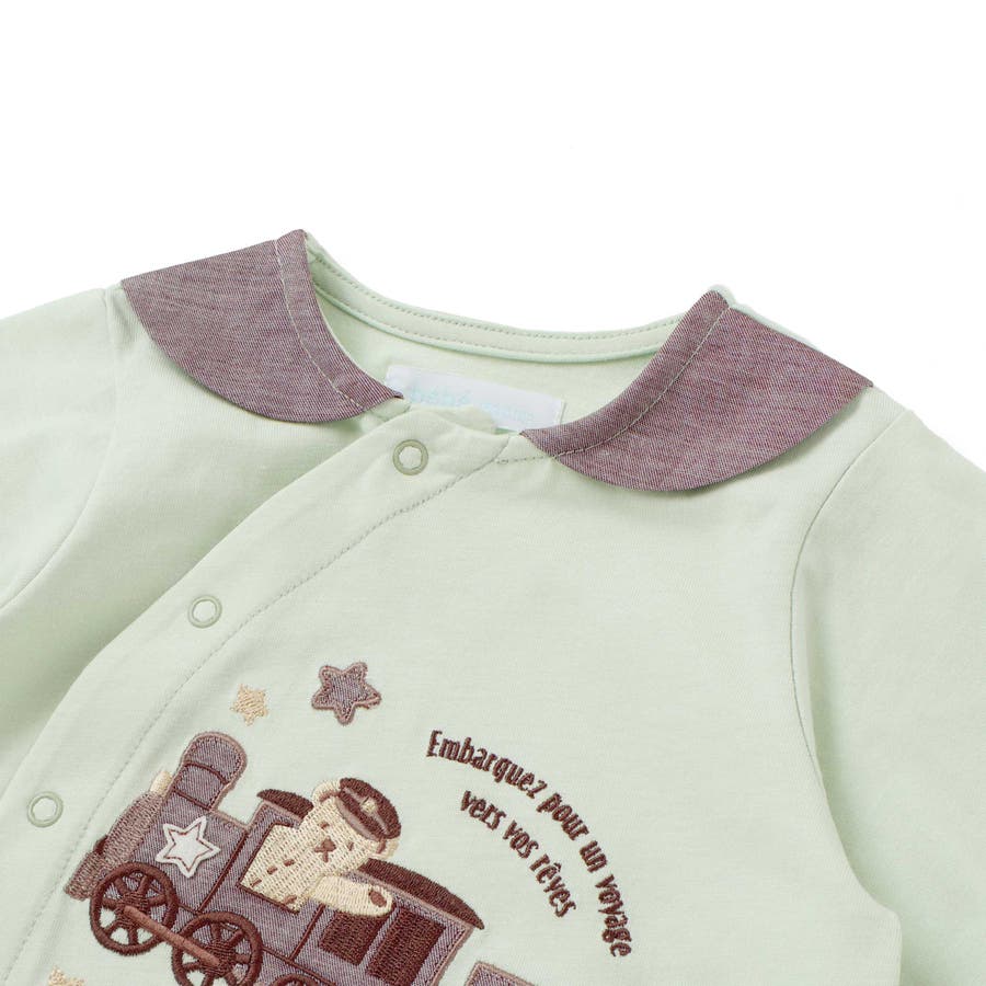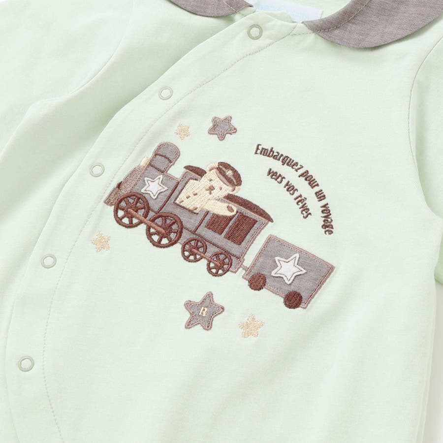 胸元の汽車パッチの細部には、ふんわりとやわらかなフェルト素材が使われており、異素材の組み合わせが楽しめます。