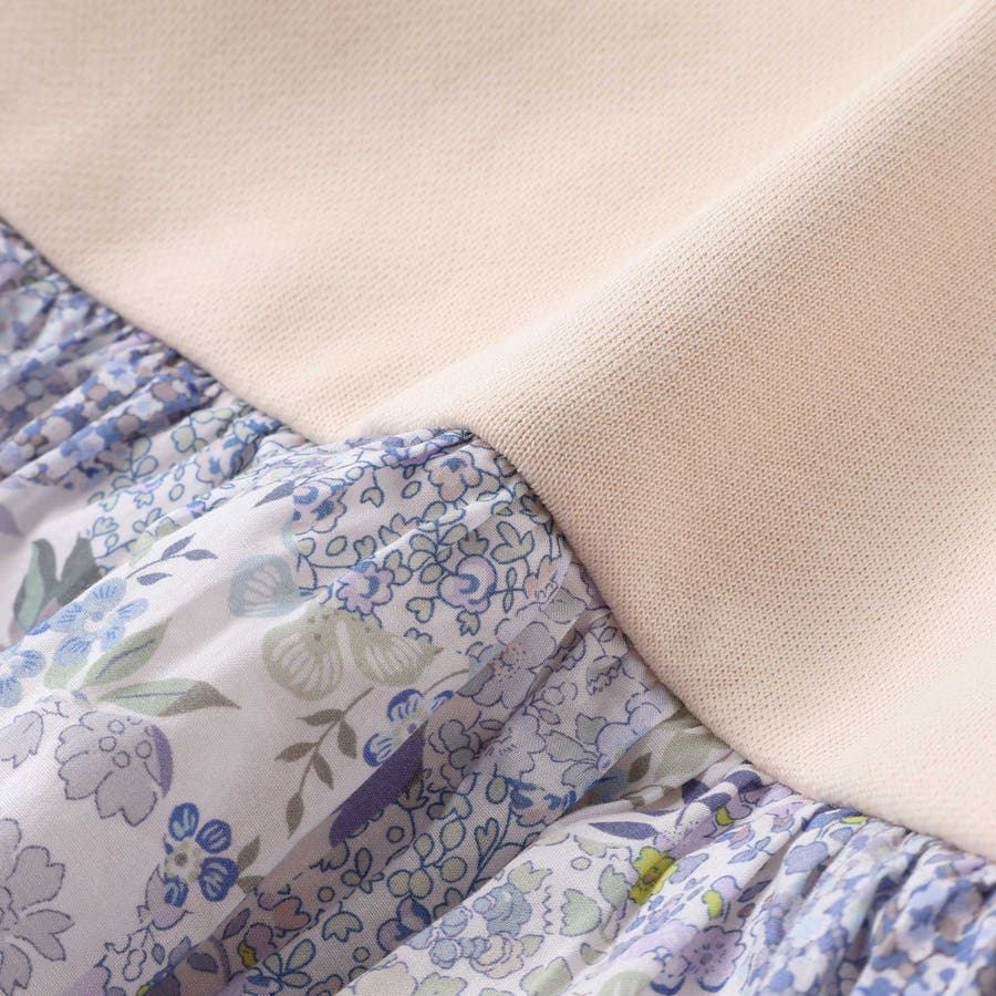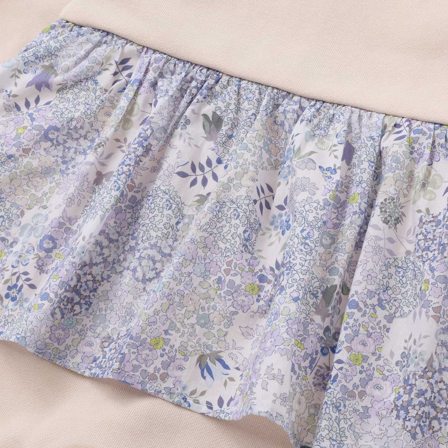 リバティプリントのエプロンを重ね着しているかのような、愛らしくも上品なデザインが魅力です。
