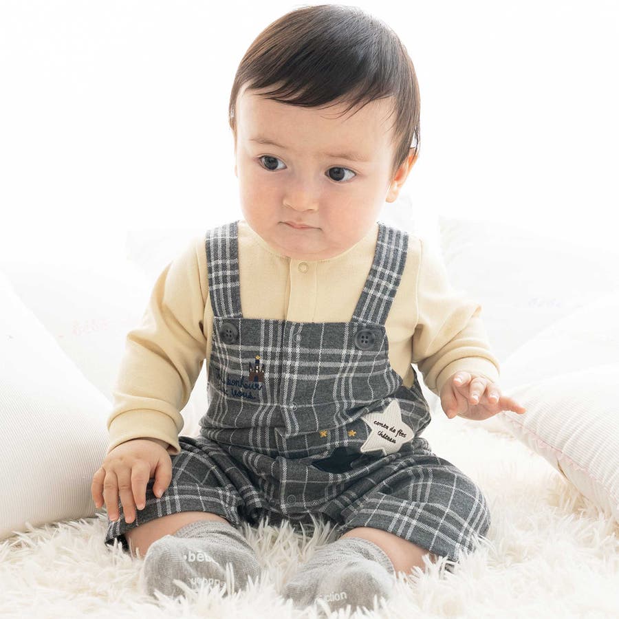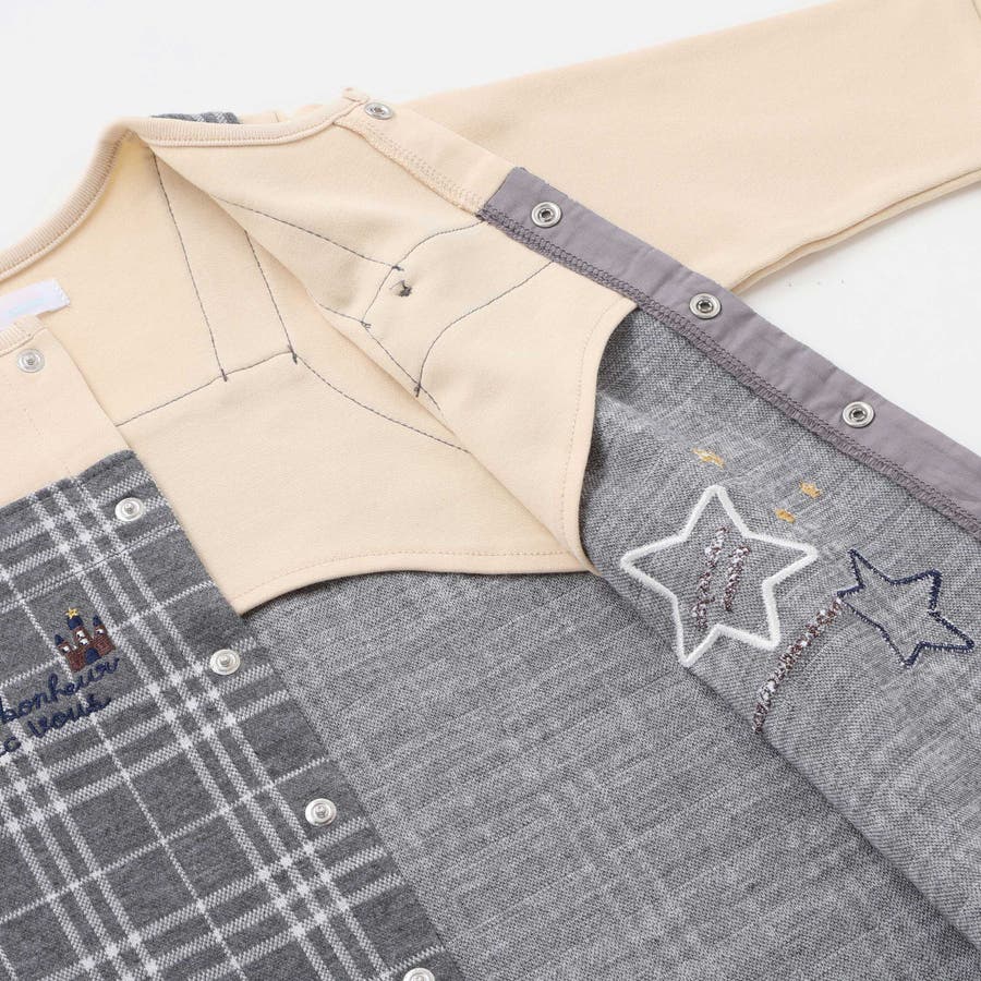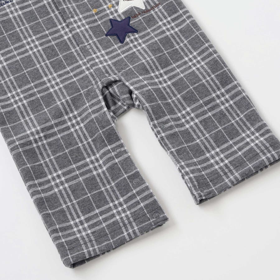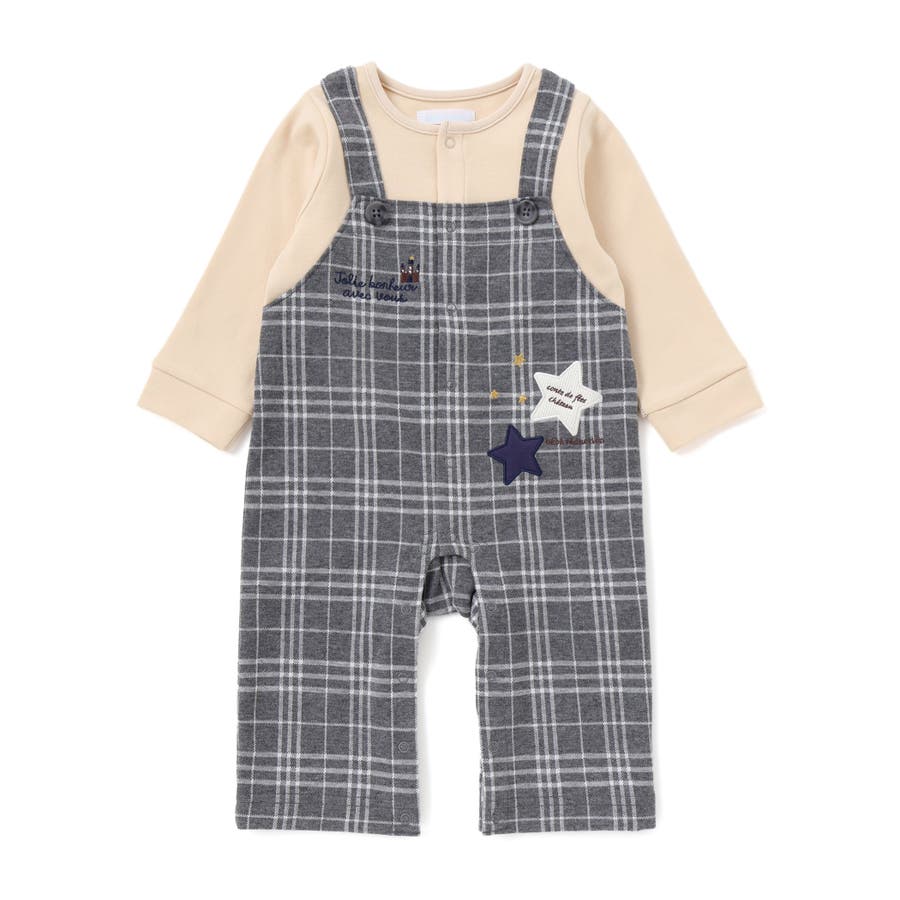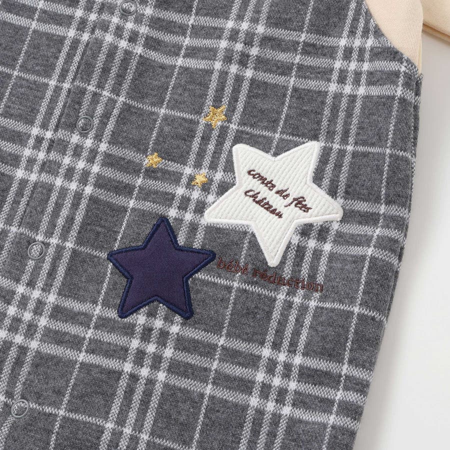 【お揃い】重ね着風チェック柄ジャガード星パッチワークカバーオール(70~80cm…