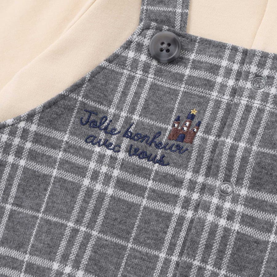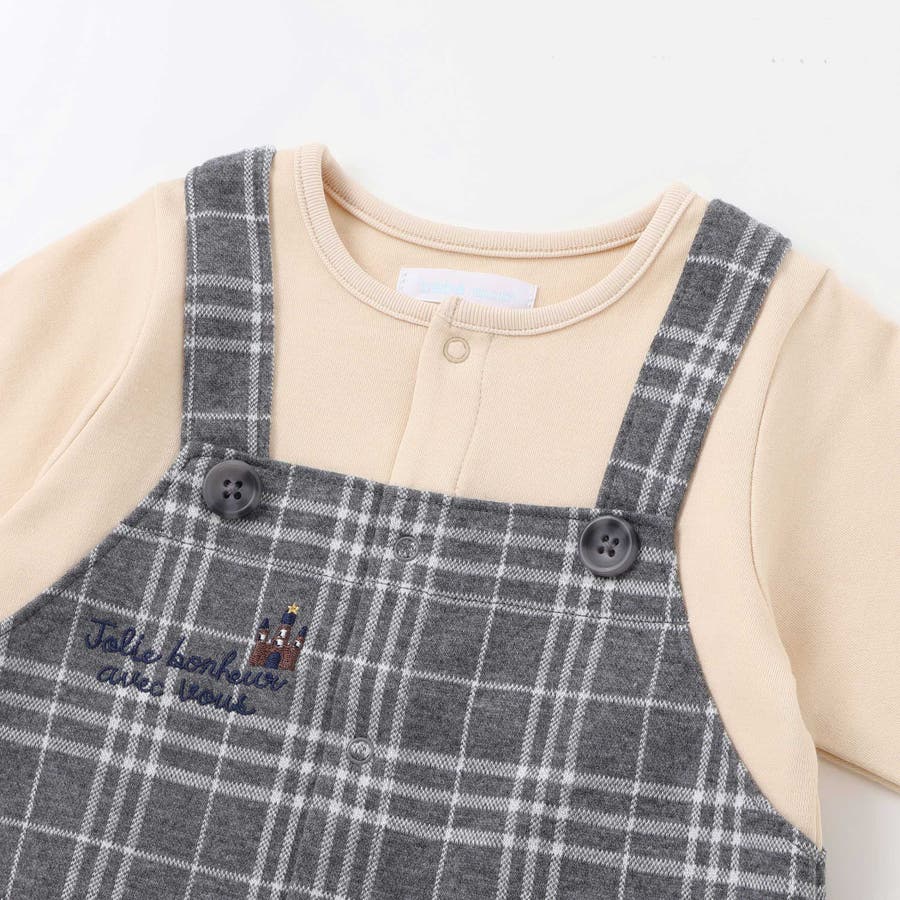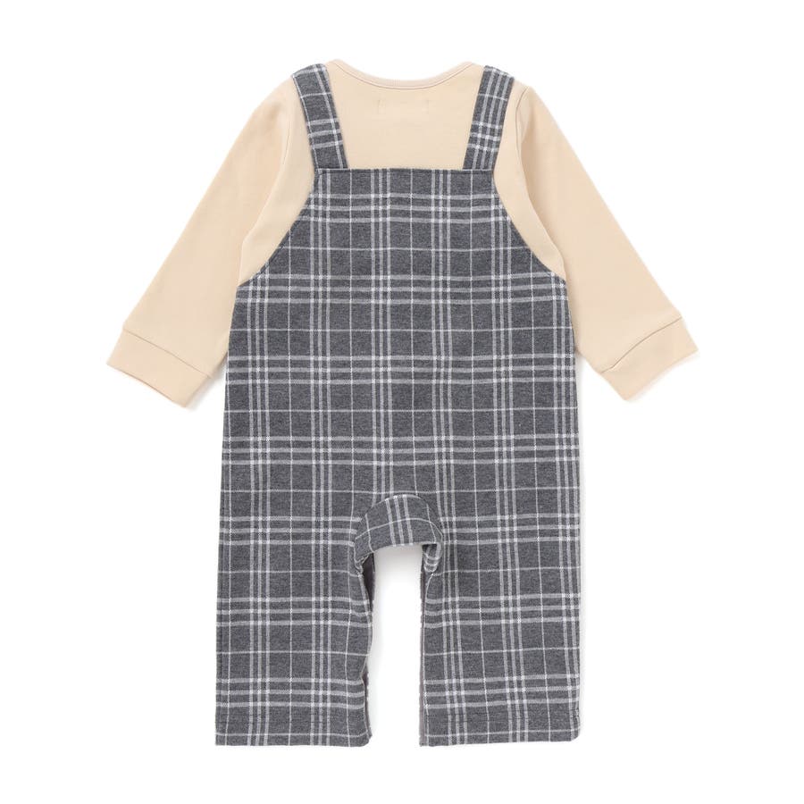 チェックジャガードのロンパースとスムース素材のTシャツを重ね着した様に見えるカバーオールです。