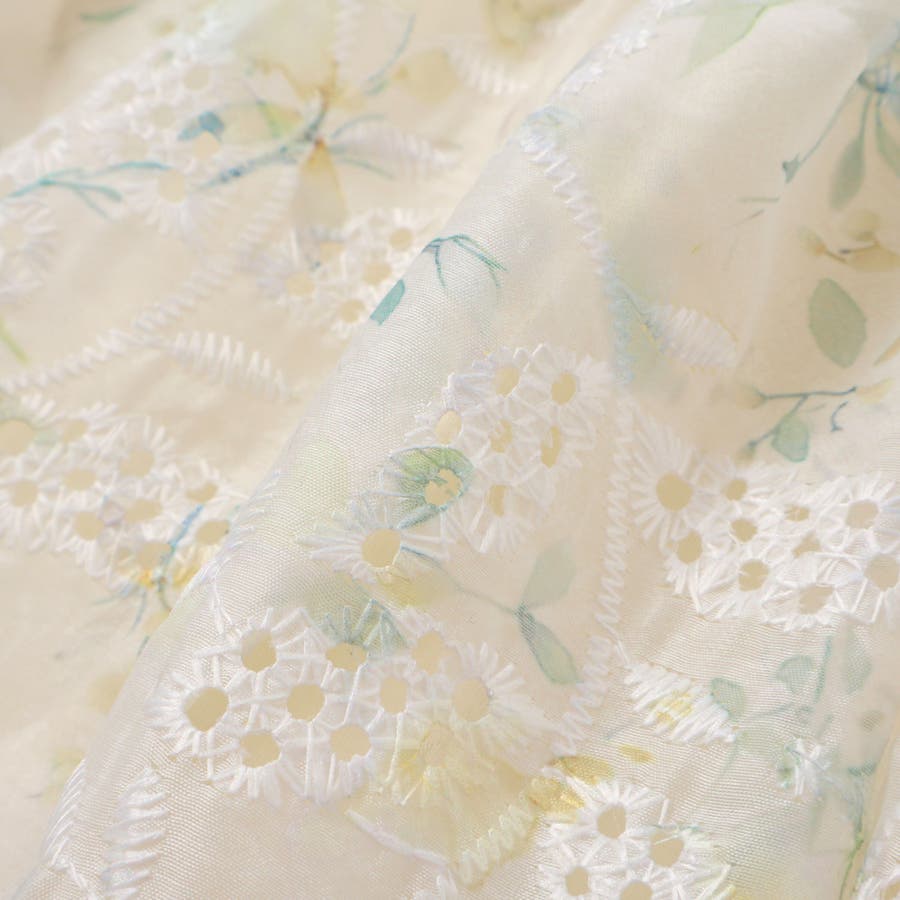 リーフ刺しゅう入りのオーガンジーに花柄プリントが華やかで、特別な日の装いを一層引き立てます。