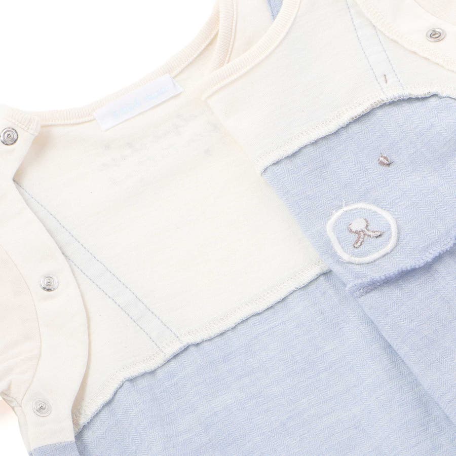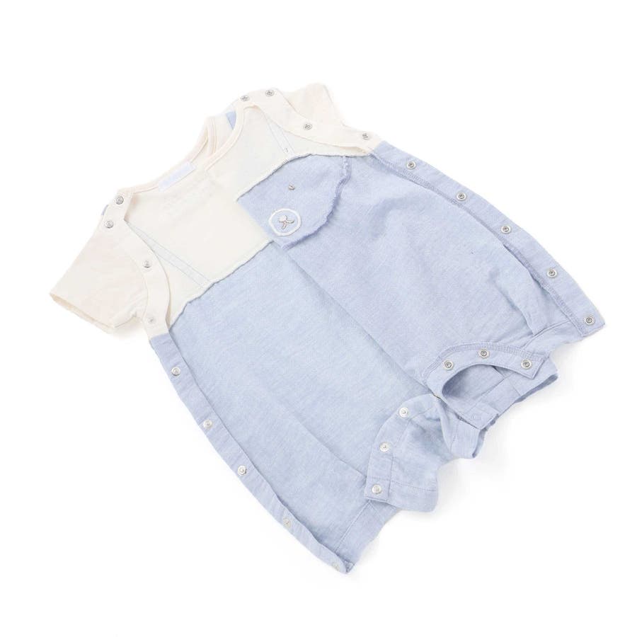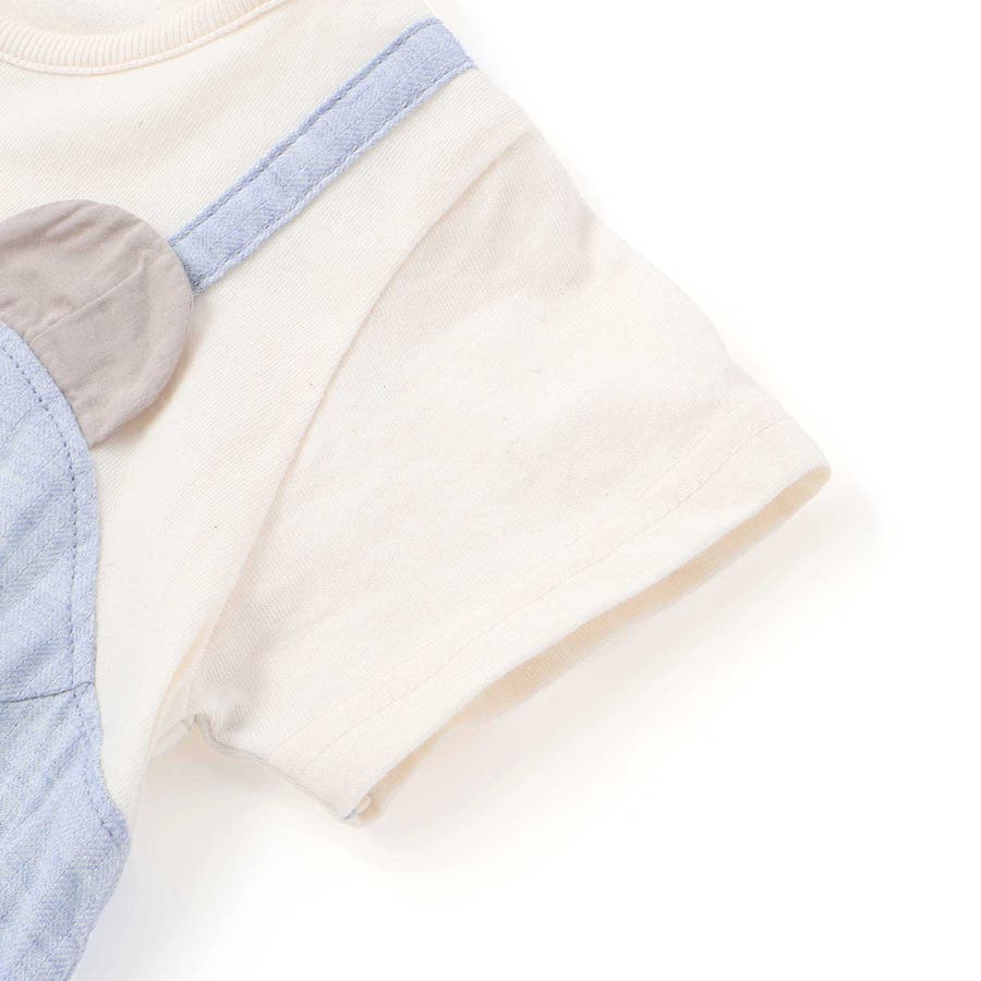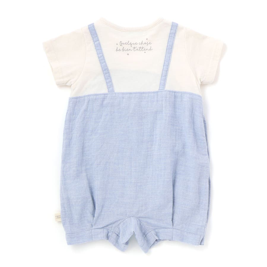 アイボリーのTシャツにブルーのオーバーオールを重ね着したようなレイヤード風の男の子用カバーオールです。