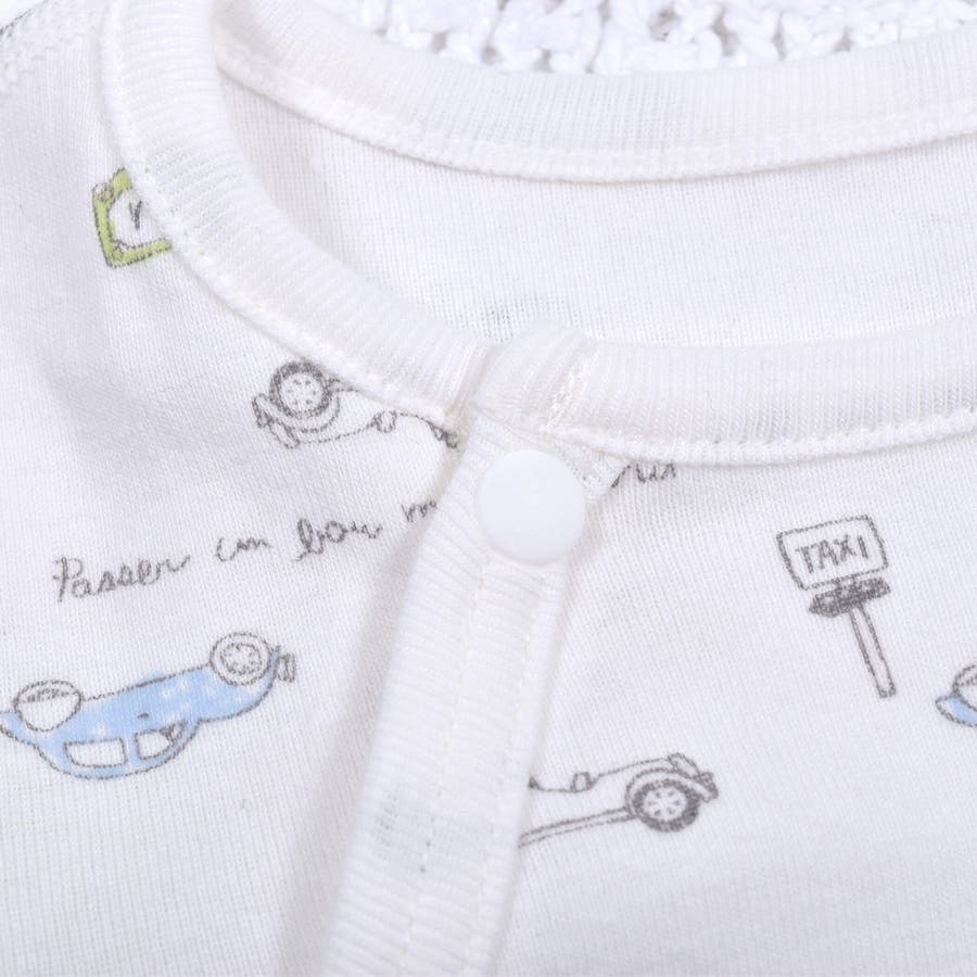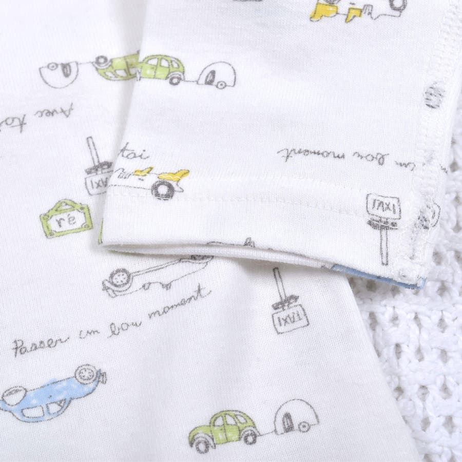 胸にクマさんのプリントがポイントに入ったホワイト、女の子らしい繊細な花柄のピンク系、男の子らしい車柄のブルー系、男の子にも女の子にもピッタリなルダクティオンのクマさんの総柄プリントのベージュ系4色展開です。