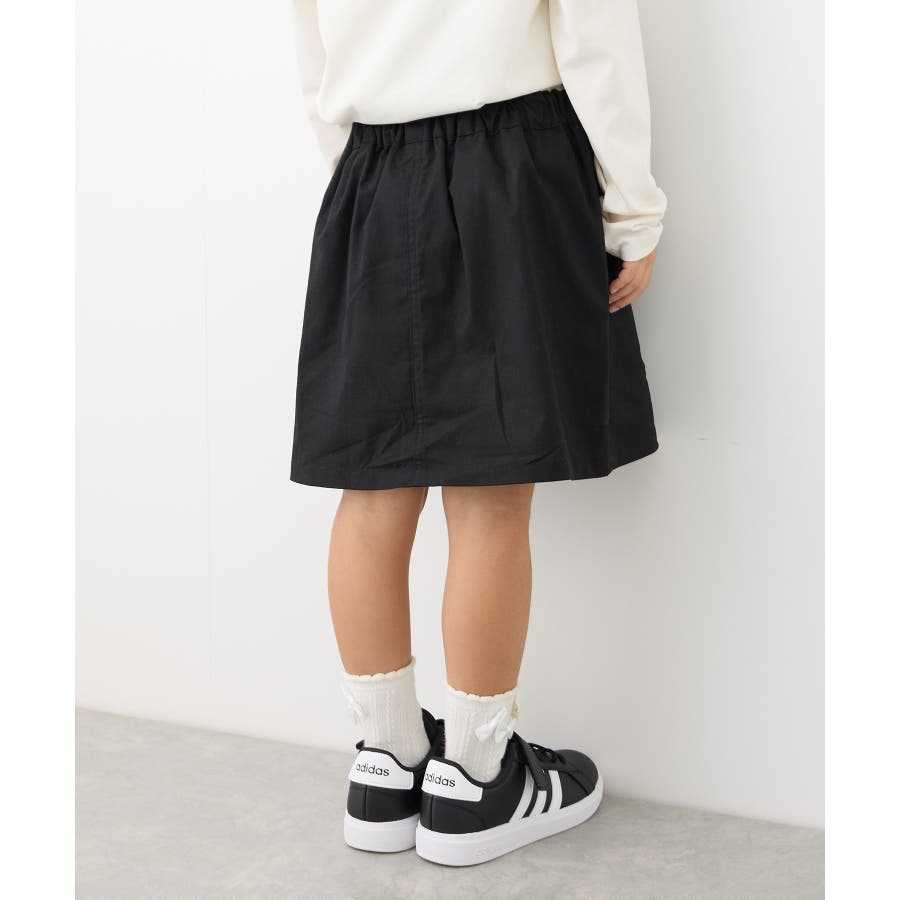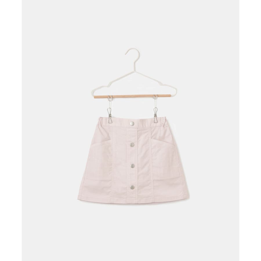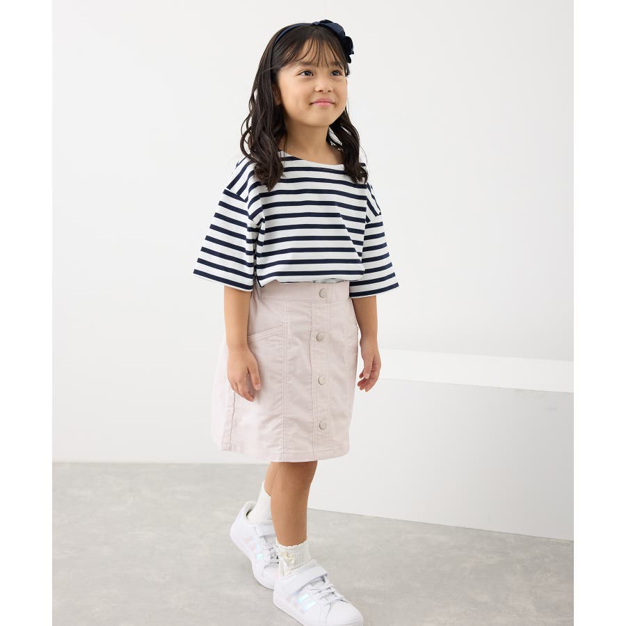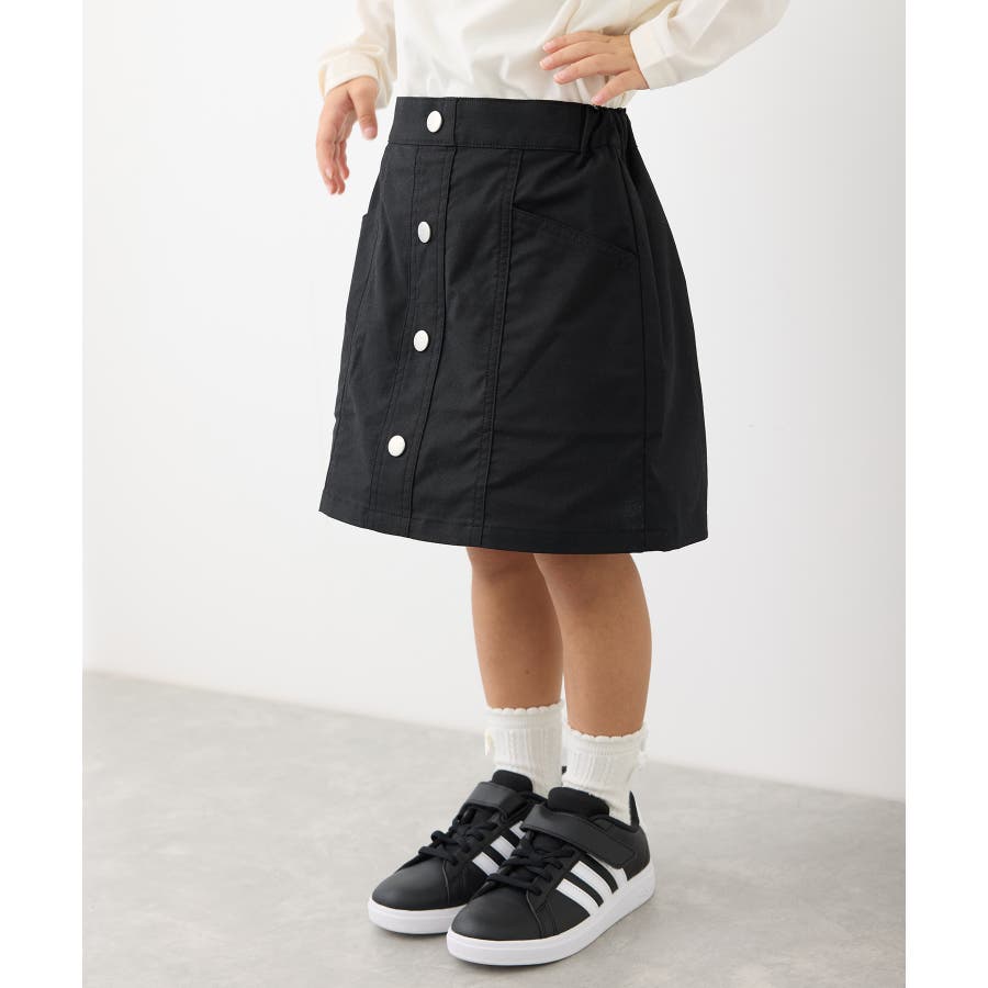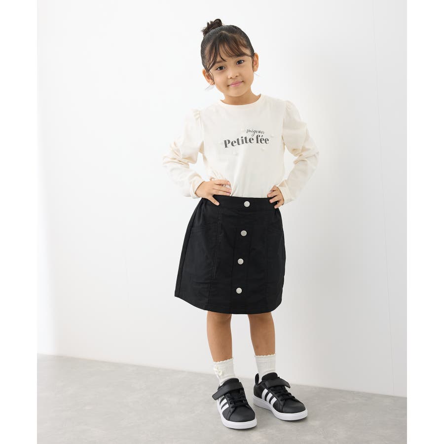 【デザイン・シルエット】 ・フロントボタンがポイントのミニスカート。 ・ウエストはギャザー使いで穿き心地もラクチン。 ・手の入れやすいサイドポケット付き。 ・アクティブに動くガールにぴったりのインパンツ付き。 【カラー】 ・ブラック、ライトピンクのはっきりとした2色で展開。 【スタイリングポイント】 ・短め丈はハイソックスと好バランス。 ・スウェットシャツやフーディーで毎日の通学にぴったりのカジュアルコーデに。 ・スウィートなブラウス合わせならきちんとした印象で着こなせる。 ----------------------------- 裏地:インパンツ付き 透け感:なし 伸縮性:ややあり 生地感・厚さ:普通 ポケット:あり ウエスト:後ろゴム その他仕様:ボタンはフェイク 季節:春・夏・秋・冬 ----------------------------- ※撮影時の光、お使いのモニター環境によって色の見え方が違う場合がございます。 ※前回好評だったインパンツ付きフロント釦スカート(品番:GRC14010,GRC54010)と同型。 ※モデル身長:109cm 着用サイズ:120