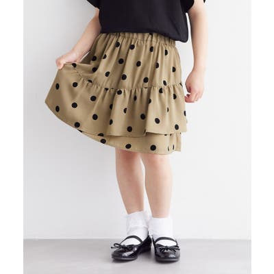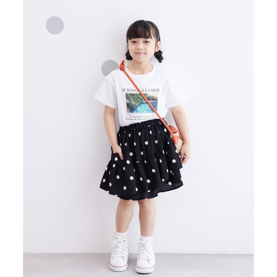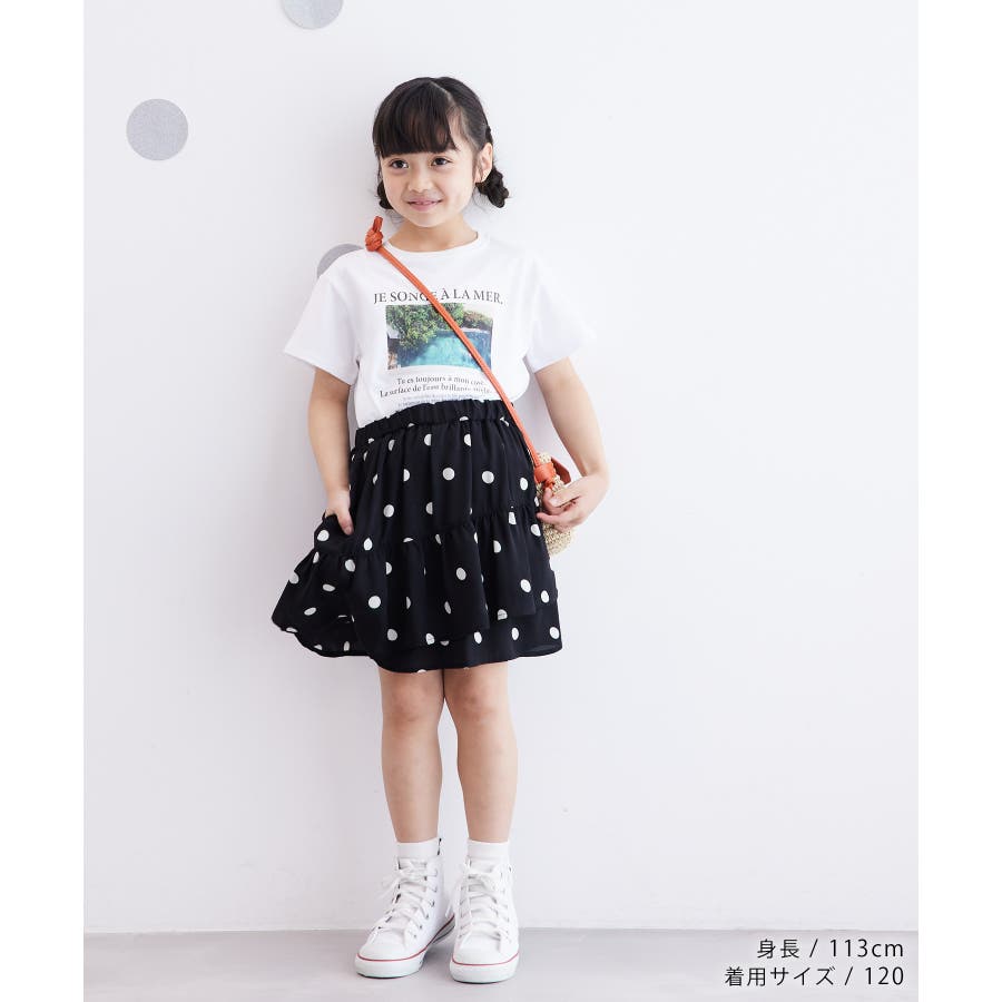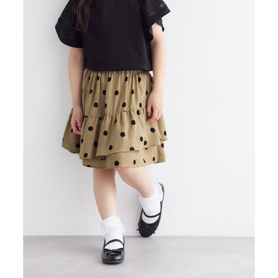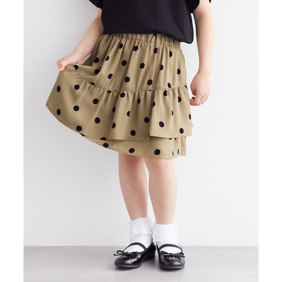 【素材感】 ・着心地の良いなめらかな肌触り。 【デザイン・シルエット】 ・レトロシックなドット柄のティアードスカート。 ・アシンメトリーなフレアが遊び心をプラス。 ・ギャザーウエストで着脱もしやすいデザイン。 ・親子でリンクコーディネートが楽しめる人気のシリーズ。 【カラー】 ・ブラック、ベージュのシックな2色展開。 【スタイリングポイント】 ・フレアスリーブのTシャツなど、愛らしいトップスと相性抜群。 ・着丈が気になる際には、レギンスを重ねてもOK。 ・同シリーズで大人のスカート(品番:GDC13180)、ワンピース(品番:GDE13180)も展開しているので、親子お揃いもおすすめ。 ----------------------------- 裏地:インナーパンツ付き 透け感:なし 伸縮性:なし 生地感・厚さ:やや薄手 ポケット:右のみあり ウエスト:ゴム 季節:春・夏 ----------------------------- ※撮影時の光、お使いのモニター環境によって色の見え方が違う場合がございます。 ※モデル身長:113cm 着用サイズ:120
