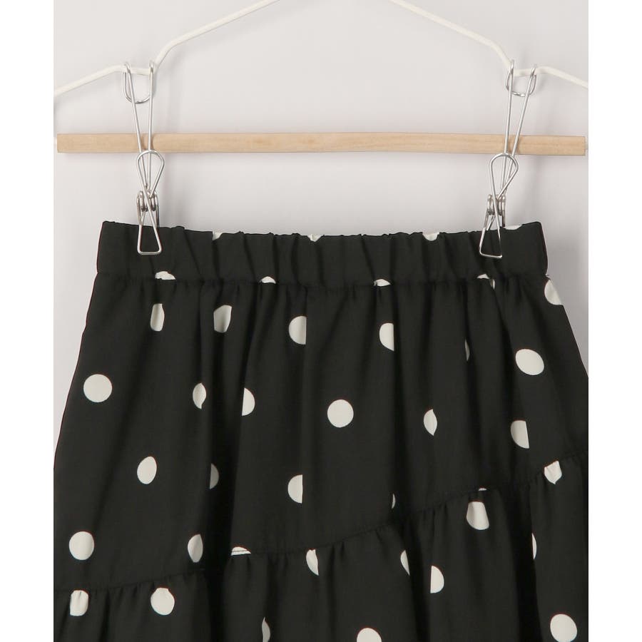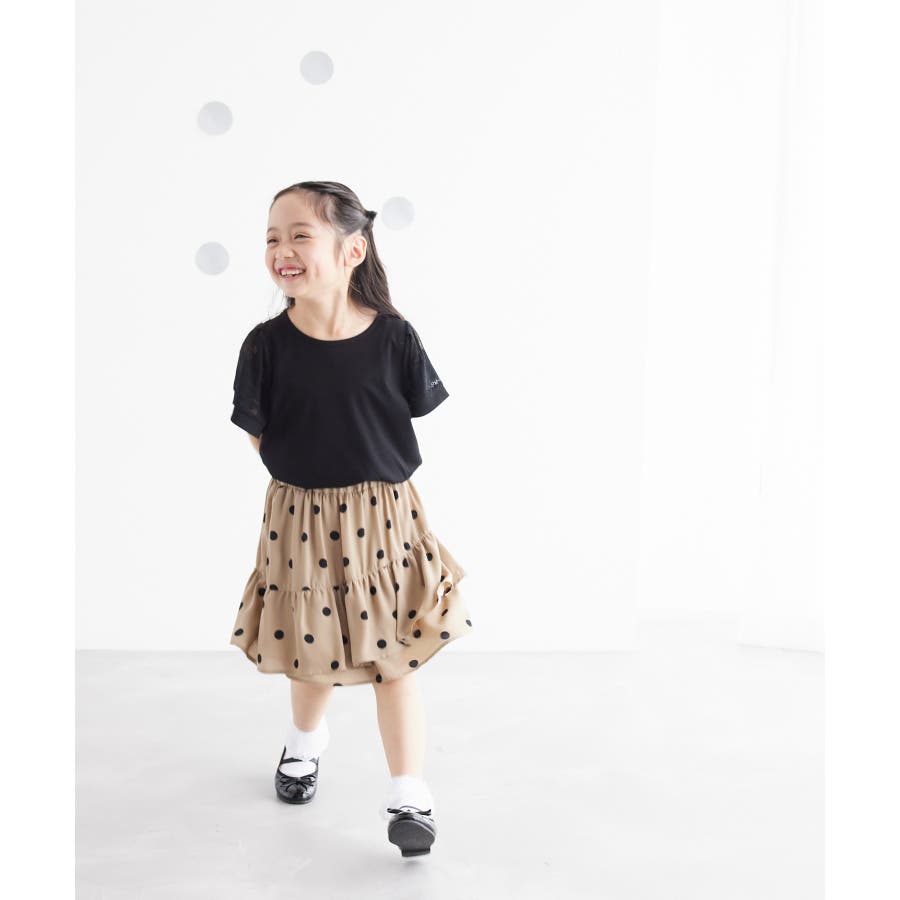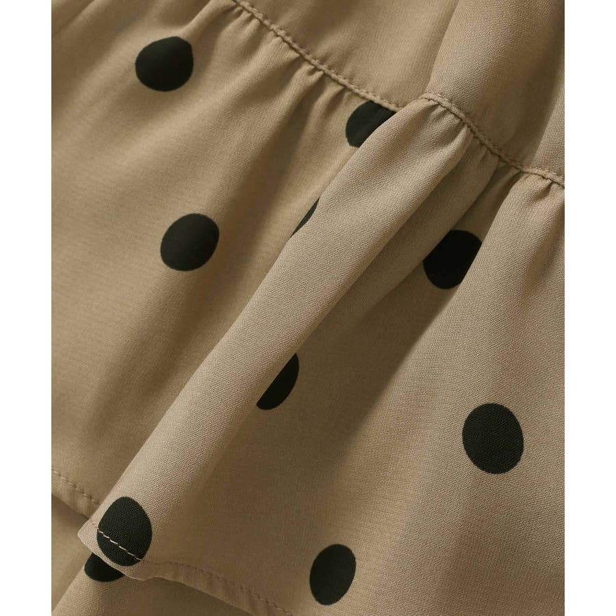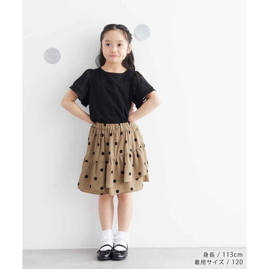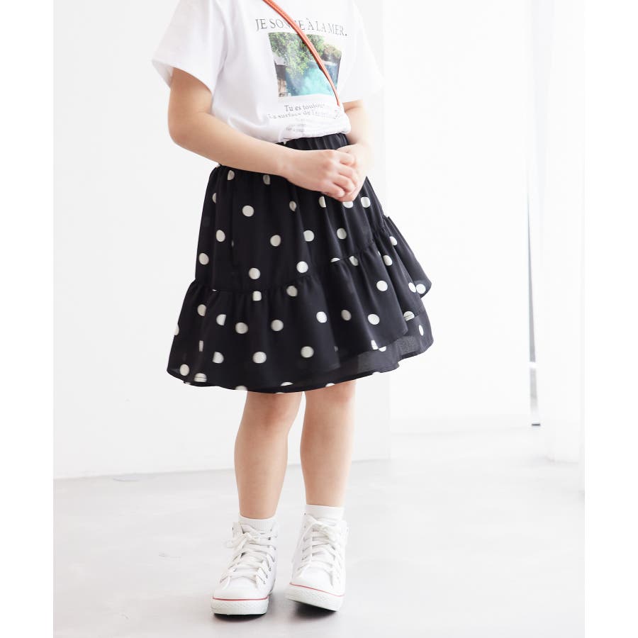 【素材感】 ・着心地の良いなめらかな肌触り。 【デザイン・シルエット】 ・レトロシックなドット柄のティアードスカート。 ・アシンメトリーなフレアが遊び心をプラス。 ・ギャザーウエストで着脱もしやすいデザイン。 ・親子でリンクコーディネートが楽しめる人気のシリーズ。 【カラー】 ・ブラック、ベージュのシックな2色展開。 【スタイリングポイント】 ・フレアスリーブのTシャツなど、愛らしいトップスと相性抜群。 ・着丈が気になる際には、レギンスを重ねてもOK。 ・同シリーズで大人のスカート(品番:GDC13180)、ワンピース(品番:GDE13180)も展開しているので、親子お揃いもおすすめ。 ----------------------------- 裏地:インナーパンツ付き 透け感:なし 伸縮性:なし 生地感・厚さ:やや薄手 ポケット:右のみあり ウエスト:ゴム 季節:春・夏 ----------------------------- ※撮影時の光、お使いのモニター環境によって色の見え方が違う場合がございます。 ※モデル身長:113cm 着用サイズ:120