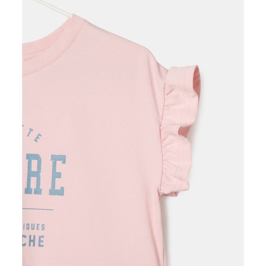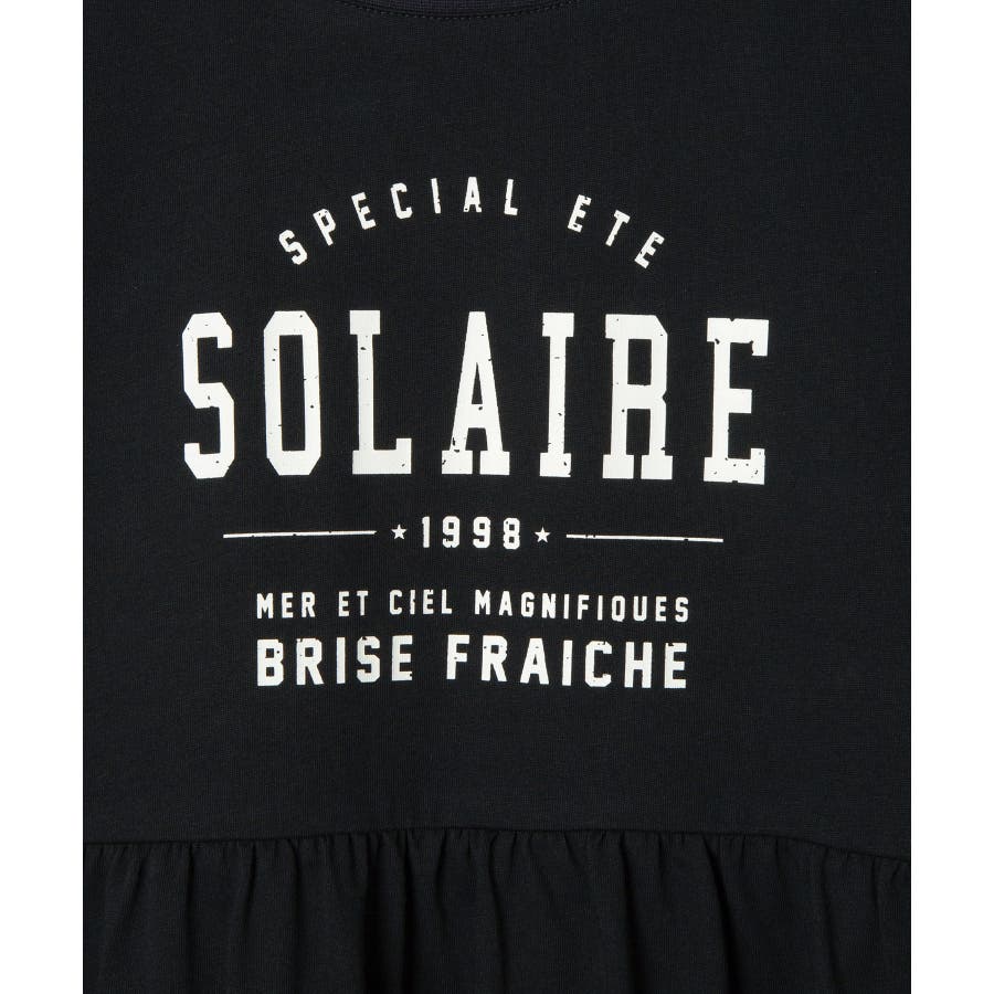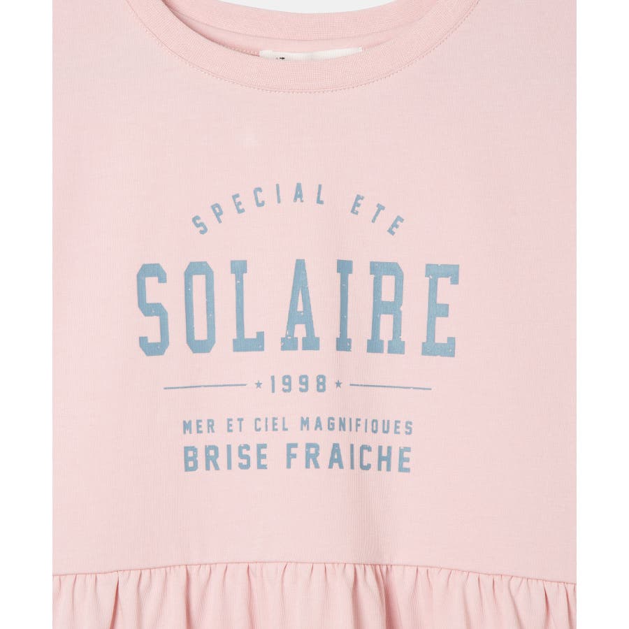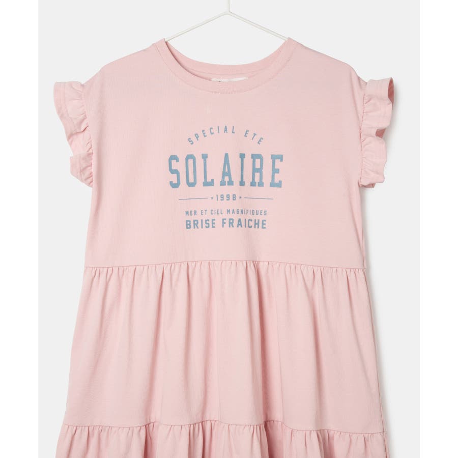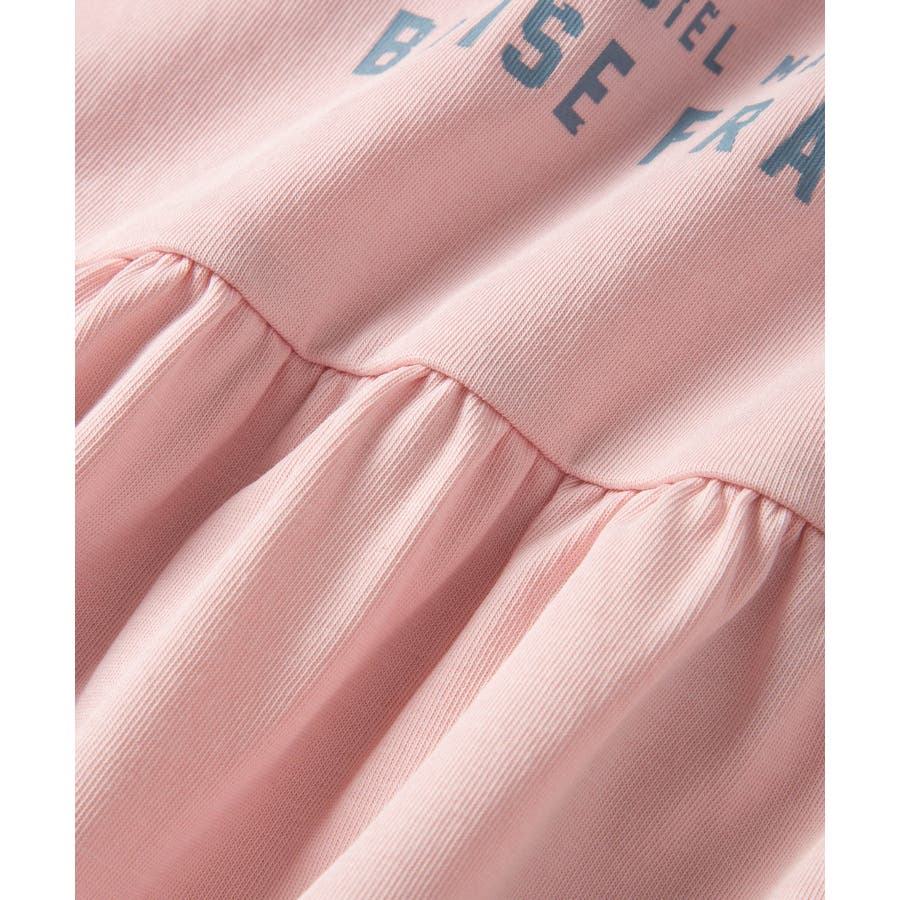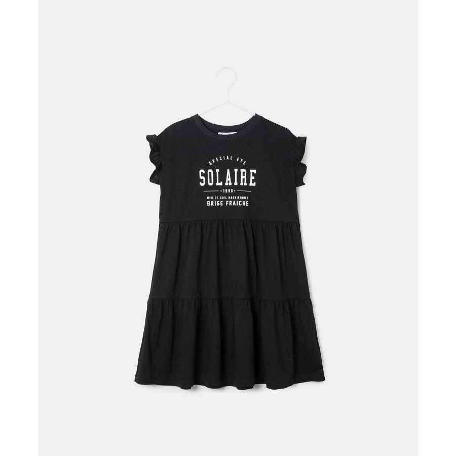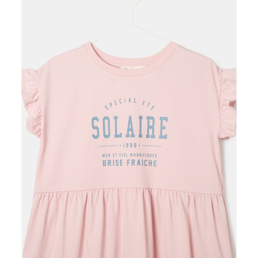 【素材感】 ・カットソー素材の楽ちんなワンピース。 ・接触冷感機能付きで夏でも着やすい素材。 【デザイン・シルエット】 ・フリルスリーブが可愛らしい、ティアードデザインのカットソーワンピース。 ・フロントのロゴプリントがスタイリッシュな一着。 ・シンプルに着られて取り扱いしやすく、普段使いに最適。 【カラー】 ・ブラック(01):ブラック×アイボリーロゴ ・ピンク(64):ピンク×ブルーグレーロゴ <ロゴの意味> Spe'cial e'te' (特別な夏) Solaire (太陽) Brise fraiche (爽やかな風) Mer et ciel magnifiques (きれいな海と空) L'humeur estivale (夏の気分) 【スタイリングポイント】 ・デニムジャケット、カーディガン、パーカなどを羽織って早いうちから取り入れても◎。 ・真夏はストローハットやグルカサンダルに合わせて颯爽と着こなして。 ----------------------------- 裏地:なし 透け感:なし 伸縮性:ややあり 生地感・厚さ:普通 ポケット:なし 季節:夏 ----------------------------- ※撮影時の光、お使いのモニター環境によって色の見え方が違う場合がございます。 ※モデル身長:120cm 着用サイズ:M