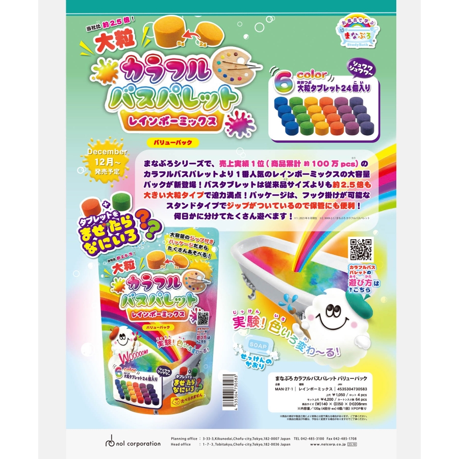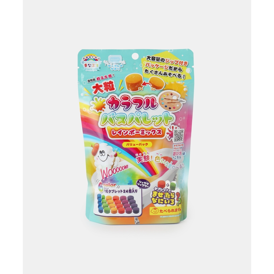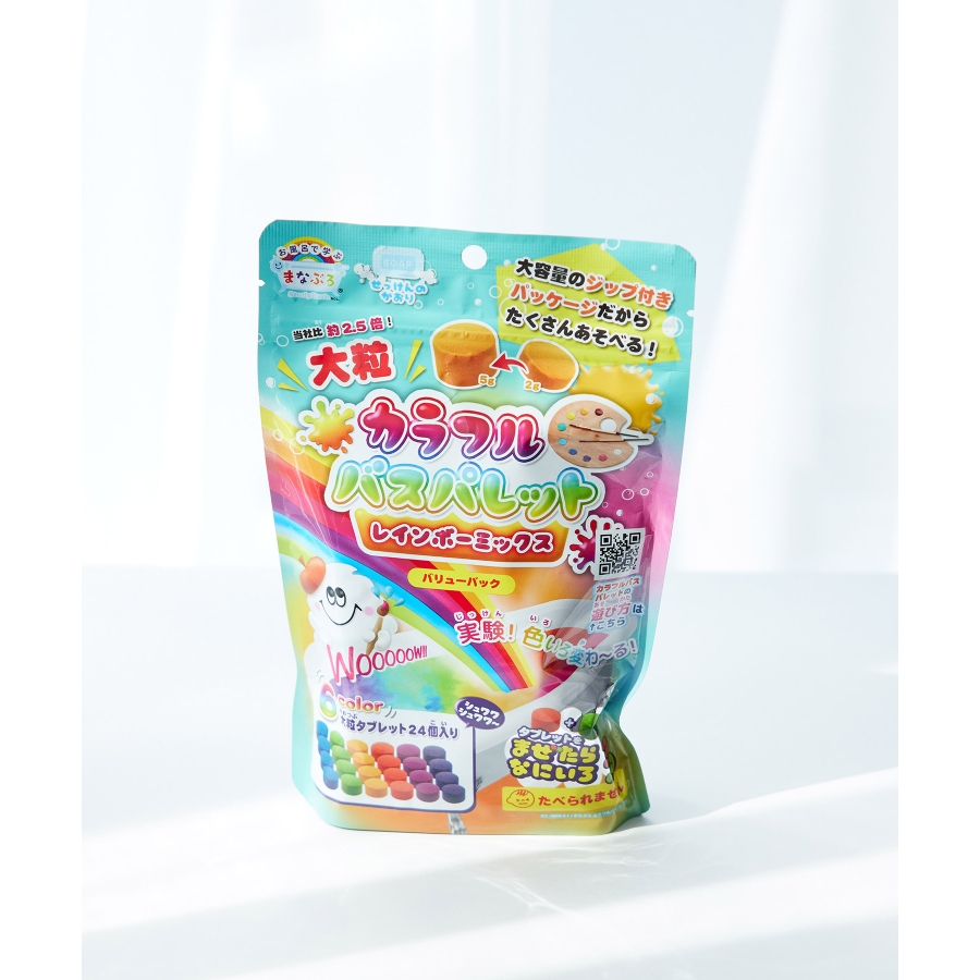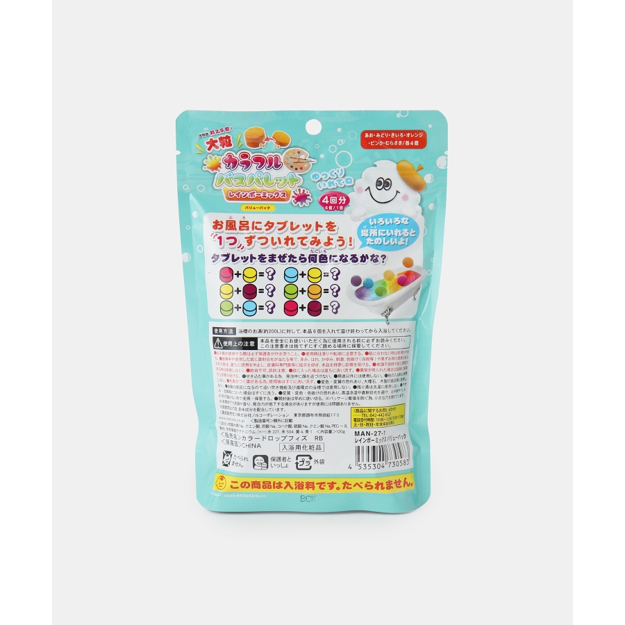 【デザイン・シルエット】 ・親子で楽しくバスタイムを満喫できる入浴剤。 ・6色もの色を揃えたカラフル且つ、大粒のお得タイプ。 ・好きな色を混ぜて、どんな色に変化するかといったことを楽しめるアイテム。 【カラー】 ・レインボーミックスの1色展開。 ----------------------------- メーカー品番:MAN2701 内容量:120g(6個/1回×4) ----------------------------- ※撮影時の光、お使いのモニター環境によって色の見え方が違う場合がございます。 : <ご使用方法> 浴槽のお湯(約200L)に対して、本品6個を入れて溶け終わってから入浴してください。 <成分> 炭酸水素Na、クエン酸、炭酸Na、コハク酸、硫酸Na、クエン酸Na、PEG-8、香料、安息香酸デナトニウム、[+/-]赤227、赤504、黄4、青1