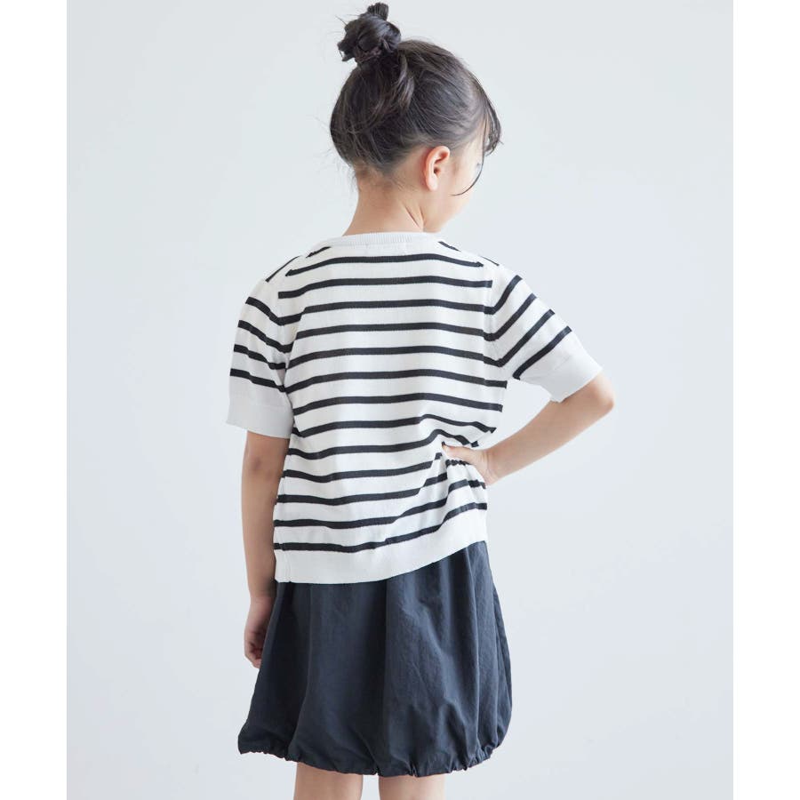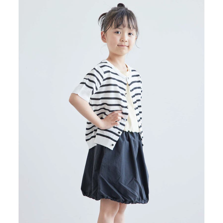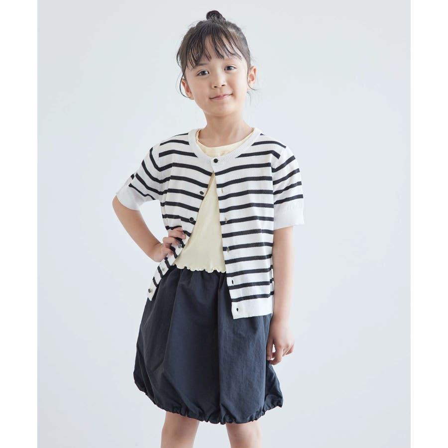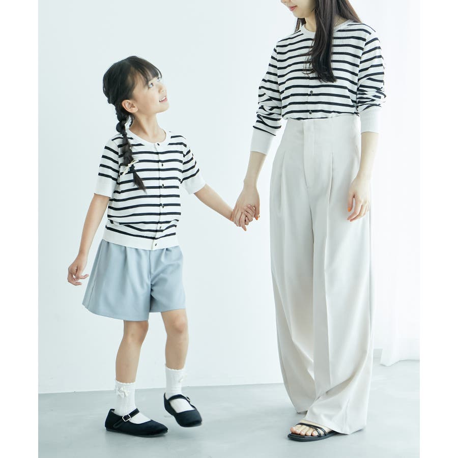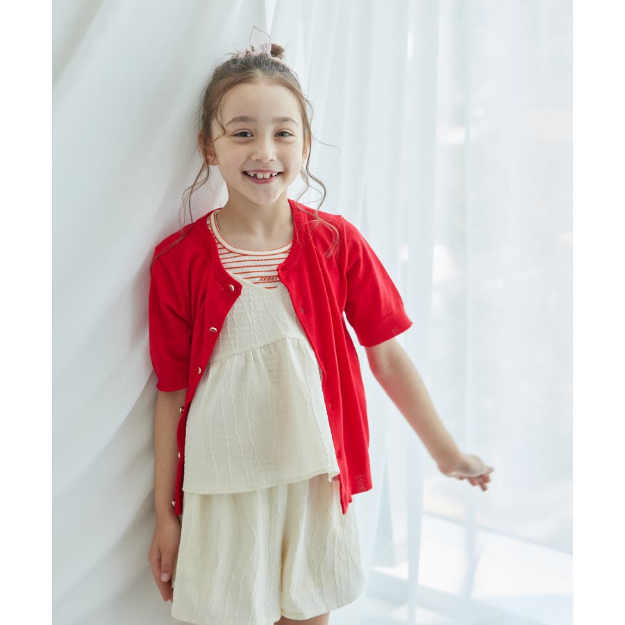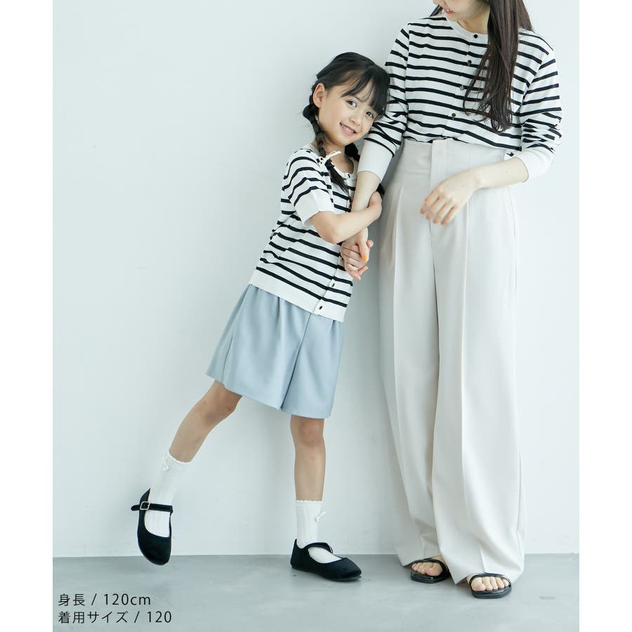 【デザイン・シルエット】 ・クラシックなムードを纏った、5分袖のクルーネックカーディガン。 ・すっきり着られるジャストサイズで、合わせるボトムを選ばないアイテム。 ・ディテールを省きミニマルに仕上げた、トレンド感に左右されない一枚。 ・ママとキッズがお揃いで着られる、人気の親子リングシリーズ。 【カラー】 ・オフホワイト、オフ×ブラックのボーダー、レッドの3色展開。 【スタイリングポイント】 ・ワンピースの羽織に最適。 ・フロントを閉じてプルオーバー風に着こなすのもおすすめ。 ・レッドはジーンズと相性抜群。 ・同シリーズで大人(品番:GDK14100)も展開しているので、お揃いでの着用もおすすめ。 ----------------------------- 裏地:なし 透け感:オフホワイト(15),ボーダー(17)の白部分はややあり 伸縮性:あり 生地感・厚さ:やや薄手 ポケット:なし 季節:春・秋 ----------------------------- ※撮影時の光、お使いのモニター環境によって色の見え方が違う場合がございます。 ※モデル身長、着用サイズは詳細画像をご確認ください。