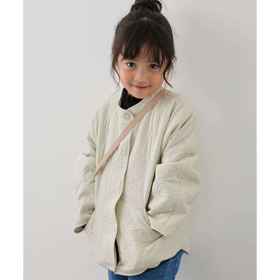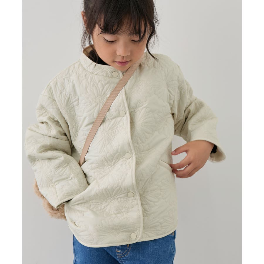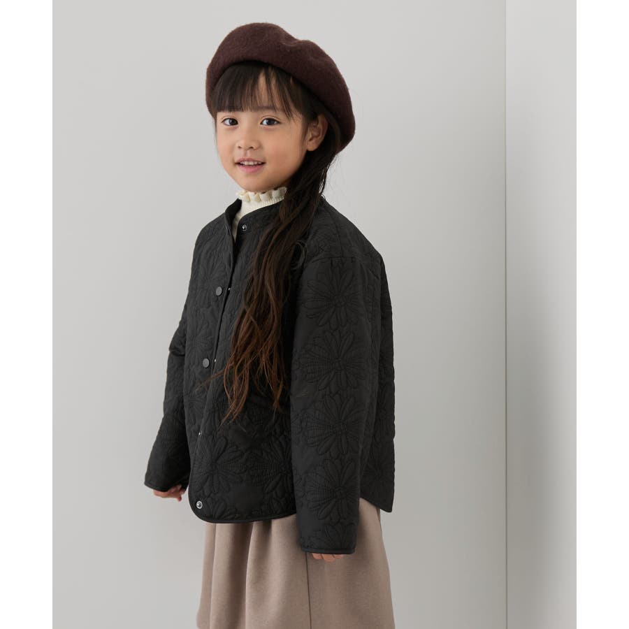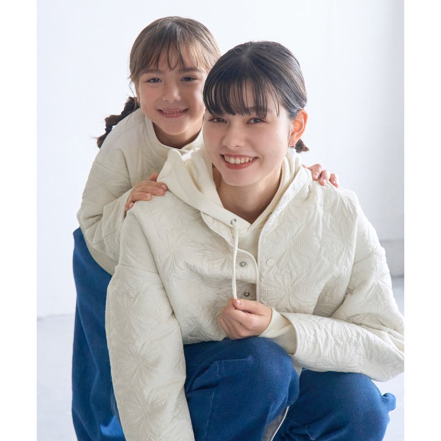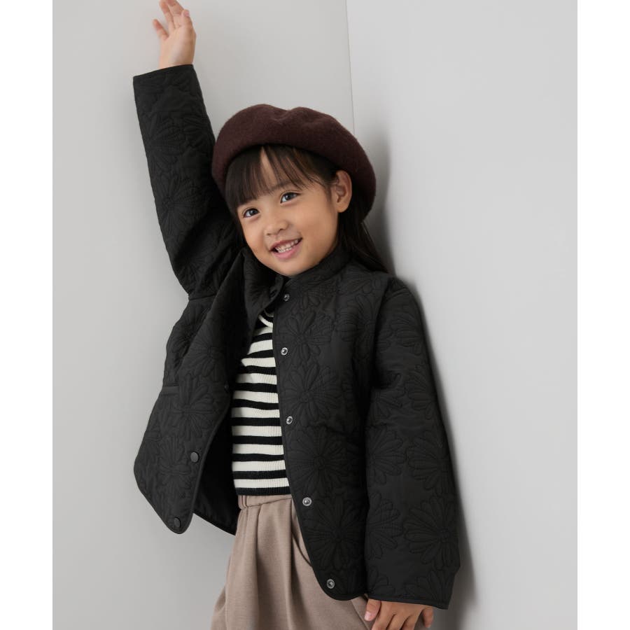 【デザイン・シルエット】 ・フラワー柄のキッズ用キルティングブルゾン。 ・ドロップショルダーと丸みのあるフォルムが可愛らしい一着。 ・首まわりがすっきりとしたコンパクトなスタンドネックと、柔らかなラウンドヘムが特徴。 ・フロントはボタン開閉。 【カラー】 ・ブラック、オフホワイトのモノトーンカラー2色展開。 【スタイリングポイント】 ・カジュアルなジーンズにも、おしゃれなおでかけワンピースにも合わせやすいデザイン。 ・コンパクトなネックで、フーディーの上にも重ねられる。 ・同シリーズで大人(品番:GSL54000)も展開しているので、親子お揃いもおすすめ。 ----------------------------- 裏地:あり 透け感:なし 伸縮性:なし 生地感・厚さ:普通 ポケット:あり 季節:秋・冬 ----------------------------- ※撮影時の光、お使いのモニター環境によって色の見え方が違う場合がございます。 ※110cmはWEBサイト限定展開。 ※モデル身長:114.5cm 着用サイズ:120