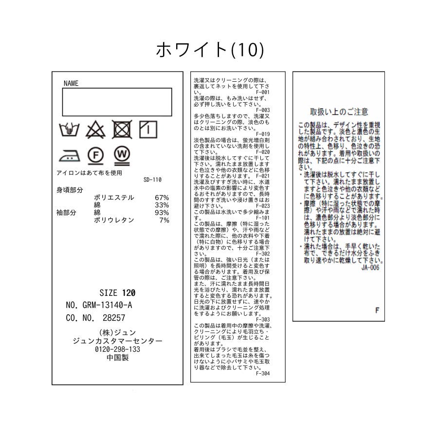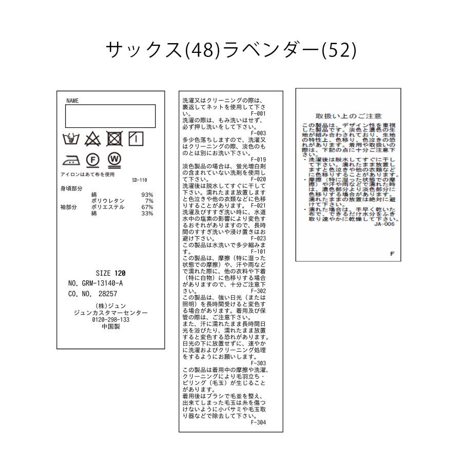 素材 | ホワイト(10):(身頃部分) ポリエステル 67% 綿 33% (袖部分) 綿 93% ポリウレタン 7%|サックス(48):(身頃部分) 綿 93% ポリウレタン 7% (袖部分) ポリエステル 67% 綿 33%|ラベンダー(52):(身頃部分) 綿 93% ポリウレタン 7% (袖部分) ポリエステル 67% 綿 33% |