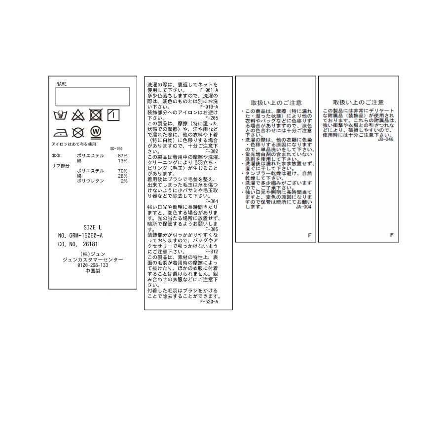| 素材 | ライトグレー(08):(本体)ポリエステル 87% 綿 13% (リブ部分)ポリエステル 70% 綿 28% ポリウレタン 2%|サックス(48):(本体)ポリエステル 87% 綿 13% (リブ部分)ポリエステル 70% 綿 28% ポリウレタン 2% |