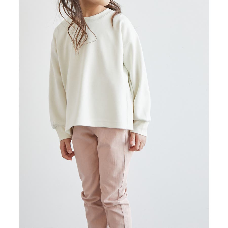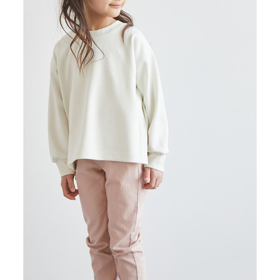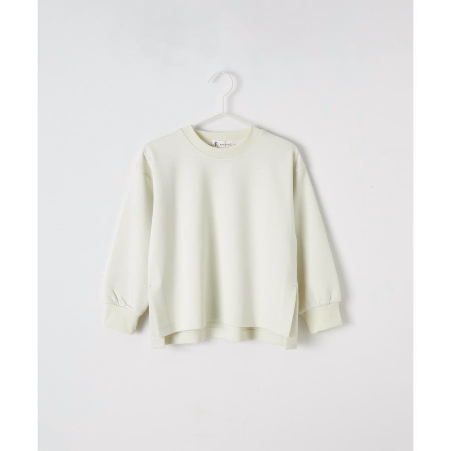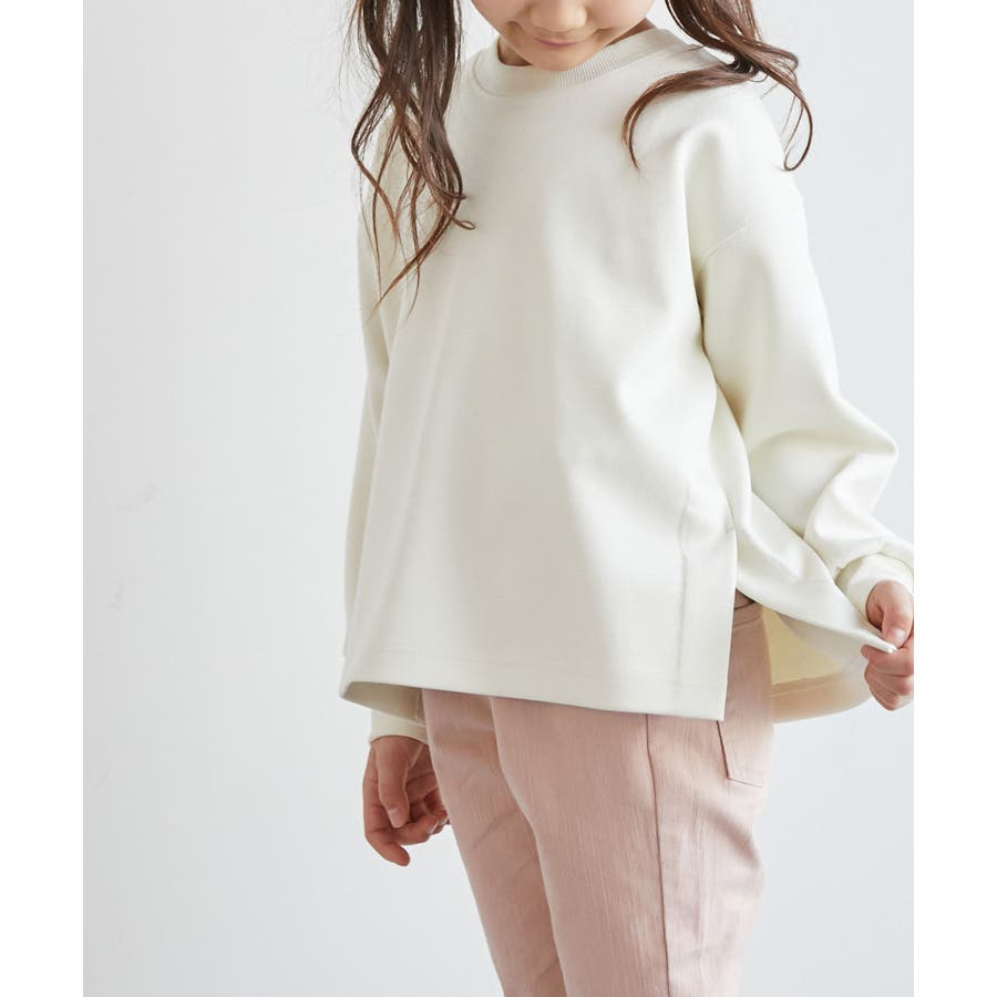 【素材感】 ・落ち感があり、ツヤのある素材 【デザイン・シルエット】 ・ママとおそろいで取り入れられる、人気の親子リンクシリーズ。 ・ふっくらとボリュームのあるクルーネックプルオーバー。 ・サイドスリット入り。 【カラー】 ・ブラック、アイボリーの2色展開。 【スタイリングポイント】 ・フリルスカートを合わせると好バランス。 ・スポーティーなスリムパンツ合わせもおすすめ。 ・同素材で大人(品番:GDM12130)も展開しているので、親子お揃いも一押し。 ----------------------------- 裏地:なし 透け感:なし 伸縮性:あり 生地感・厚さ:普通 季節:秋~春 ----------------------------- ※撮影時の光、お使いのモニター環境によって色の見え方が違う場合がございます。 ※モデル身長:118cm 着用サイズ:120
