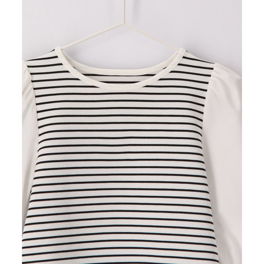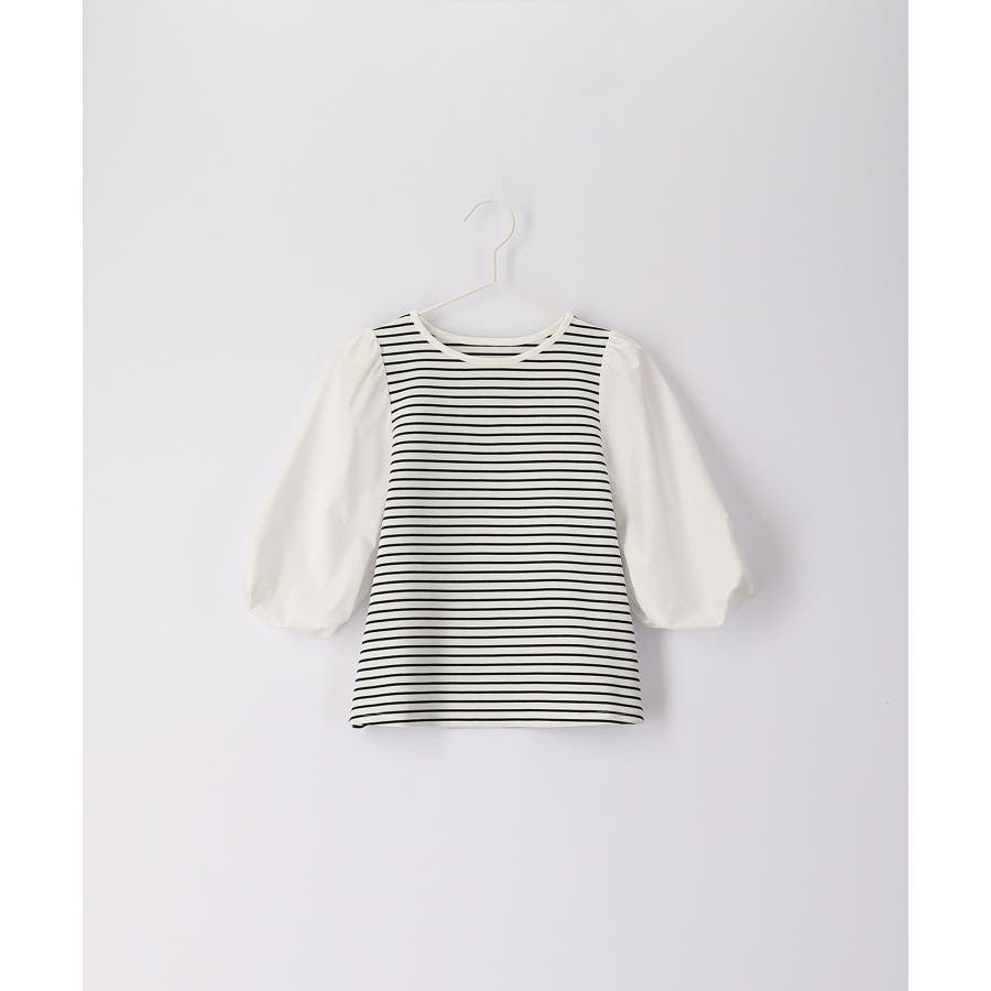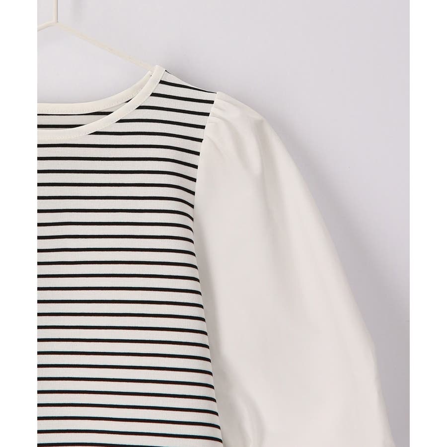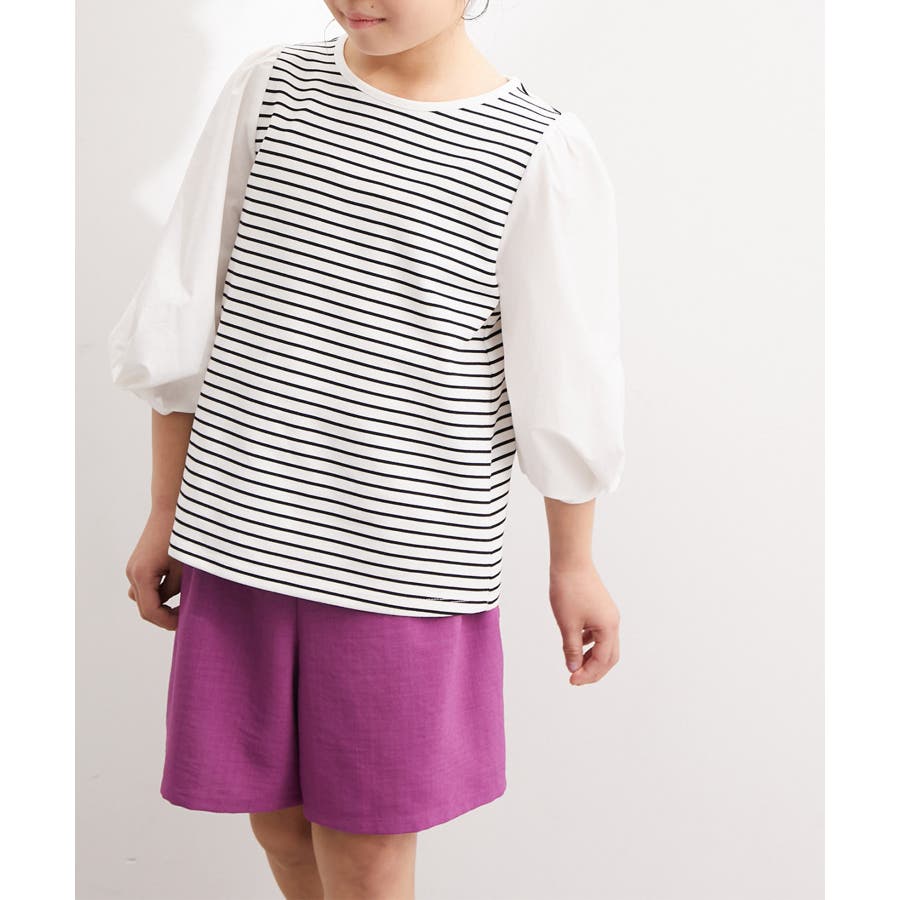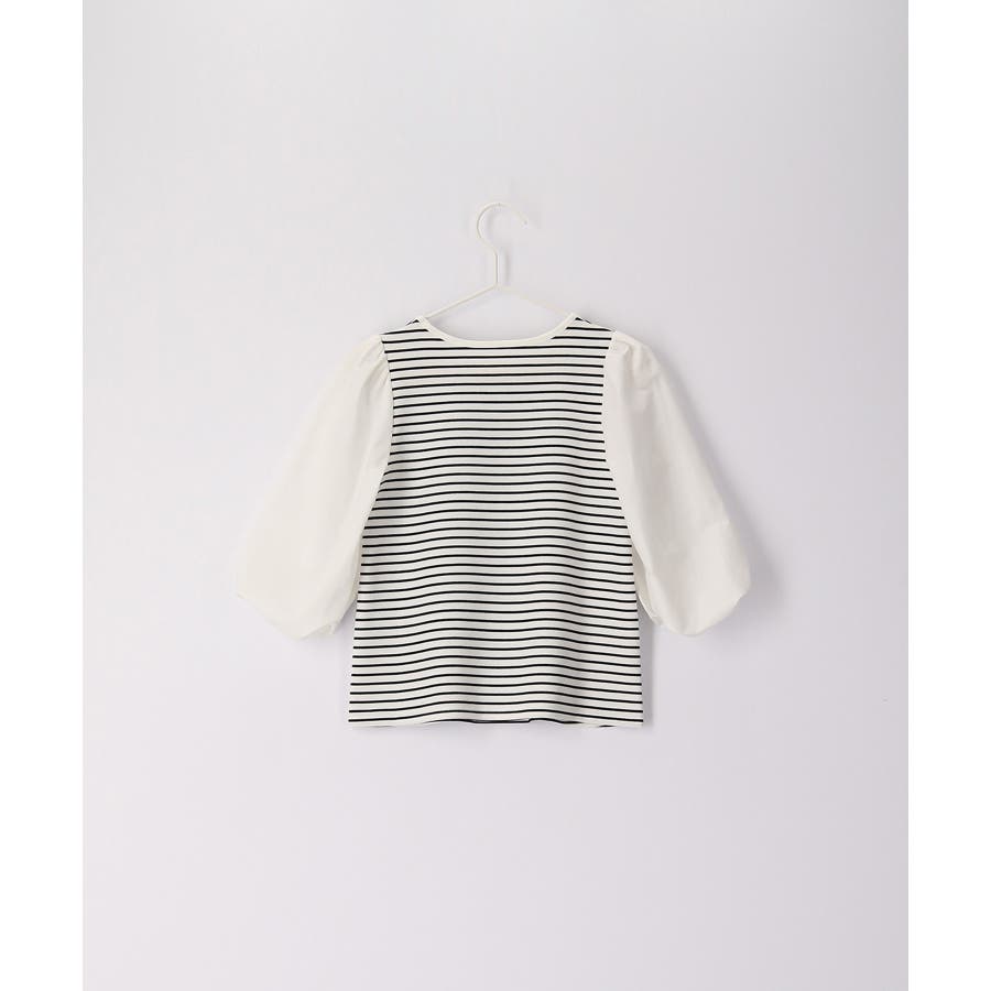 【デザイン・シルエット】 ・肉厚のポンチ素材と、軽やかな布帛を切り替えた異素材トップス。 ・カットソーの快適な着心地と、ブラウスのような上品さを併せ持った一枚。 【カラー】 ・カラーによって組成の混率が異なります。 ホワイト系(11):ボーダー (本体)ポリエステル 55% ナイロン 20% レーヨン 20% ポリウレタン 5% (袖部分)綿 55% ナイロン 40% ポリウレタン 5% ネイビー(40):無地 (本体) 綿 55% ナイロン 37% ポリウレタン 8% (袖部分) 綿 55% ナイロン 40% ポリウレタン 5% 【スタイリングポイント】 ・ジャンパースカートやオーバーオールとのレイヤードが一押し。 ・同シリーズで大人(品番:GDM13090)(品番:GDM23040)とDOG(品番:GII23020)も展開しているので、家族お揃いもおすすめ。 ----------------------------- 裏地:なし 透け感:身頃/ホワイト系(11)はややあり、ネイビー(40)はなし。袖部分/ホワイト系(11)はあり、ネイビー(40)はなし 伸縮性:あり 生地感・厚さ:普通 季節:春・秋 ----------------------------- ※撮影時の光、お使いのモニター環境によって色の見え方が違う場合がございます。 ※モデル身長:112cm 着用サイズ:120 ※DOGは一部店舗限定になります。