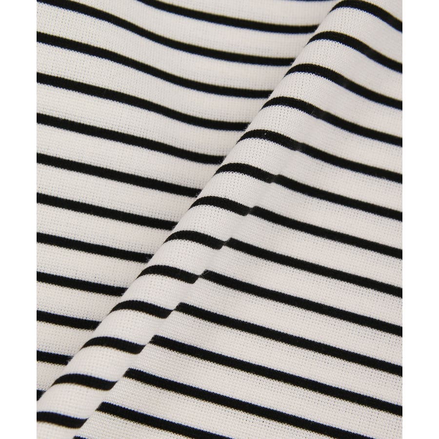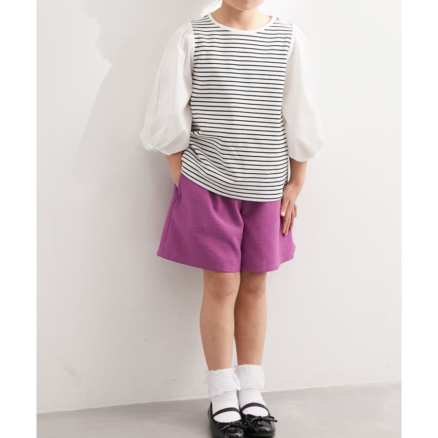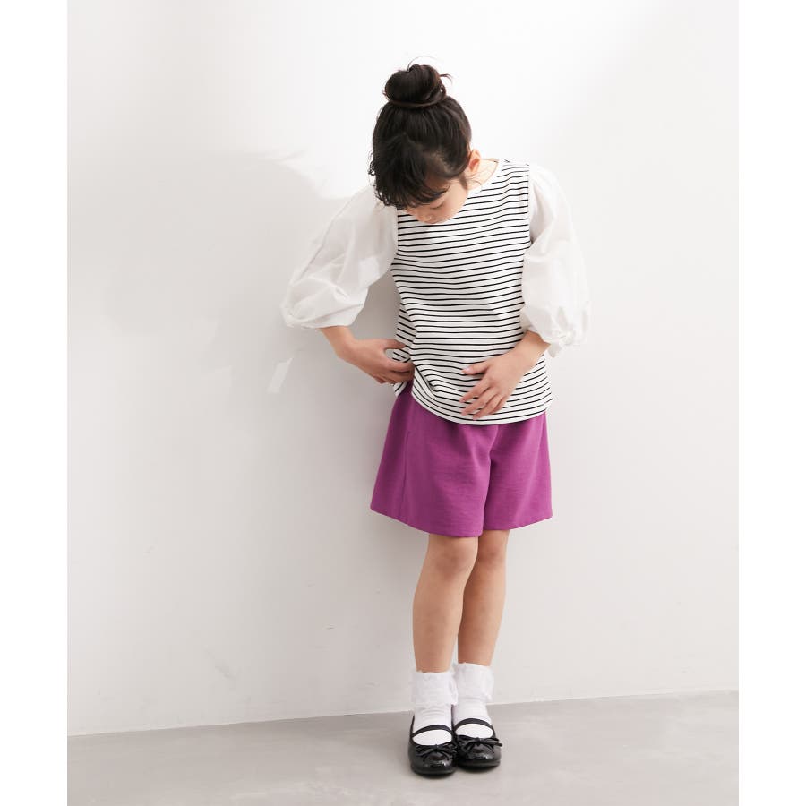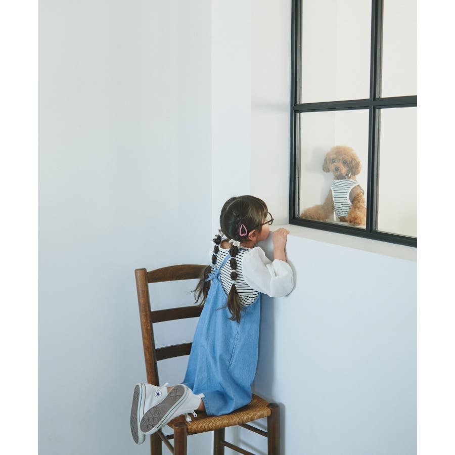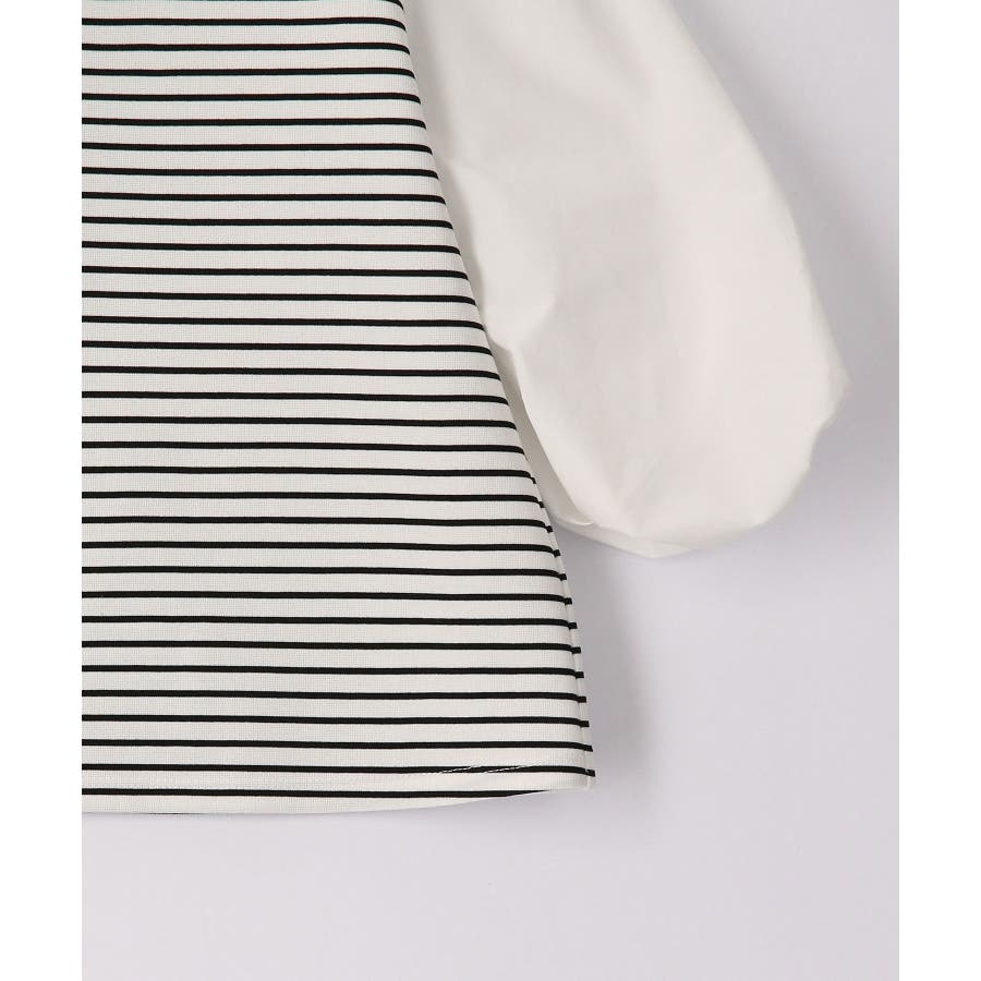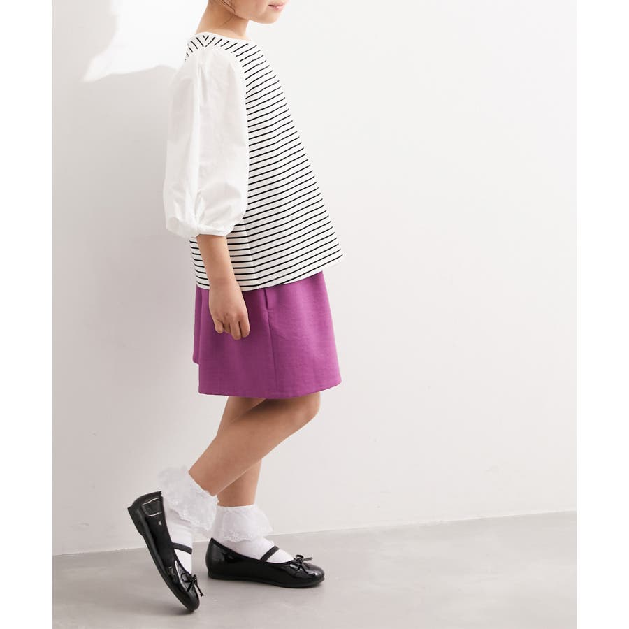 【デザイン・シルエット】 ・肉厚のポンチ素材と、軽やかな布帛を切り替えた異素材トップス。 ・カットソーの快適な着心地と、ブラウスのような上品さを併せ持った一枚。 【カラー】 ・カラーによって組成の混率が異なります。 ホワイト系(11):ボーダー (本体)ポリエステル 55% ナイロン 20% レーヨン 20% ポリウレタン 5% (袖部分)綿 55% ナイロン 40% ポリウレタン 5% ネイビー(40):無地 (本体) 綿 55% ナイロン 37% ポリウレタン 8% (袖部分) 綿 55% ナイロン 40% ポリウレタン 5% 【スタイリングポイント】 ・ジャンパースカートやオーバーオールとのレイヤードが一押し。 ・同シリーズで大人(品番:GDM13090)(品番:GDM23040)とDOG(品番:GII23020)も展開しているので、家族お揃いもおすすめ。 ----------------------------- 裏地:なし 透け感:身頃/ホワイト系(11)はややあり、ネイビー(40)はなし。袖部分/ホワイト系(11)はあり、ネイビー(40)はなし 伸縮性:あり 生地感・厚さ:普通 季節:春・秋 ----------------------------- ※撮影時の光、お使いのモニター環境によって色の見え方が違う場合がございます。 ※モデル身長:112cm 着用サイズ:120 ※DOGは一部店舗限定になります。
