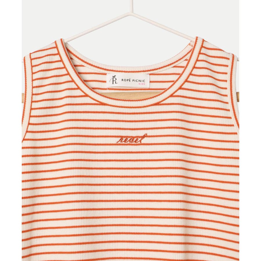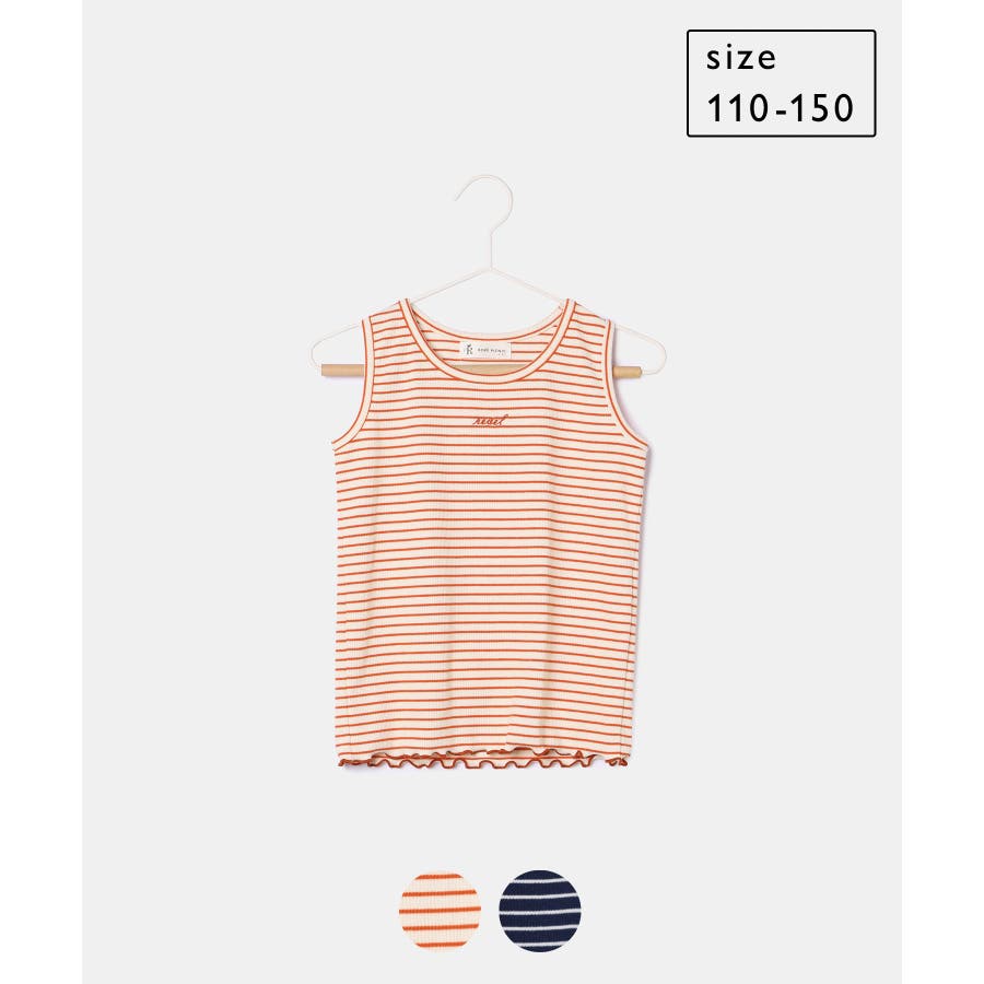 【デザイン・シルエット】 ・重ね着に便利な春らしいカラーリングのボーダー柄タンクトップ。 ・メロウラインの裾がガーリーなアクセント。 ・首回りやアームホールなど下着が見えないように調節した安心なサイズ感。 ・ママとキッズとがお揃いで着られる、ROPE' PICNIC人気の親子リンクシリーズ。 : <ロゴの意味> revel : 大いに楽しむという意 【カラー】 ・ネイビー、オレンジのキッズらしい2色をラインナップ。 【スタイリングポイント】 ・パーカやカーディガンのインナーに。 ・ジーンズやカーゴパンツ合わせがおすすめ。 ・夏には1枚でトップスとしても、長く着られるアイテム。 ----------------------------- 裏地:なし 透け感:なし 伸縮性:あり 生地感・厚さ:やや薄手 ポケット:なし 季節:春-秋 ----------------------------- ※撮影時の光、お使いのモニター環境によって色の見え方が違う場合がございます。 ※ネイビー(40):モデル身長:116.5cm 着用サイズ:120 ※オレンジ(71):モデル身長:117cm 着用サイズ:120