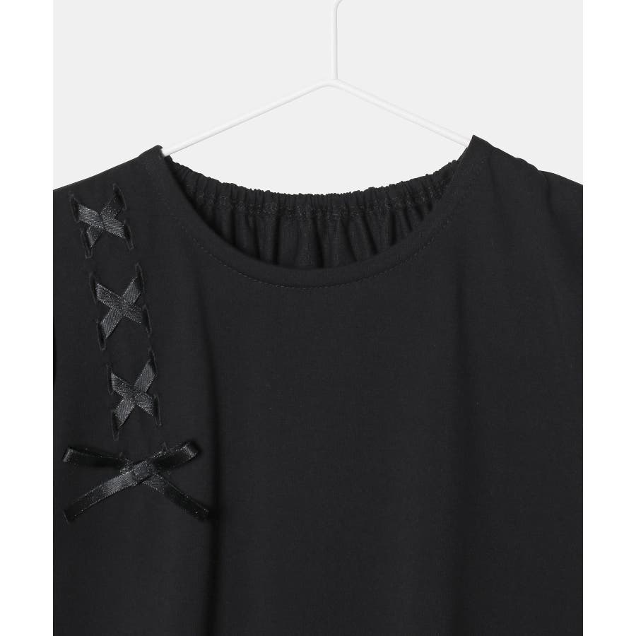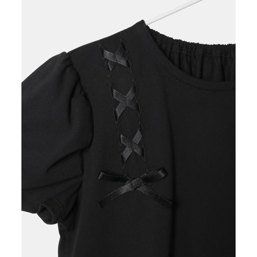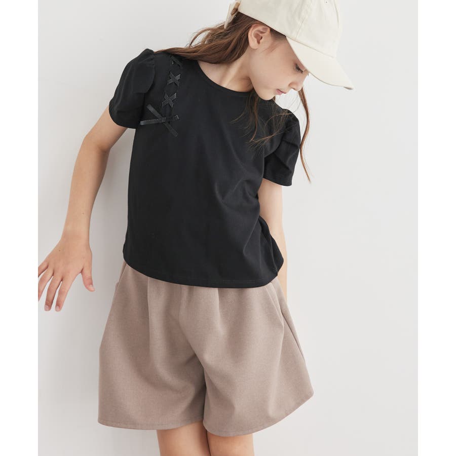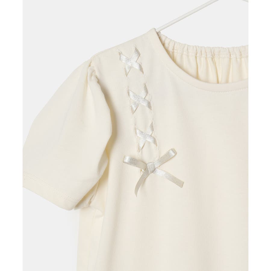 【素材感】 ・接触冷感付きの天竺素材を使用したトップス。 【デザイン・シルエット】 ・タックを入れた立体袖が愛らしい半袖カットソー。 ・右肩にレースアップディテールが施されたアシンメトリーデザイン。 ・身頃はストンと落ちるボックスシルエット。 【カラー】 ・ブラック、オフホワイトのモノクロカラーを2色展開。 ・レースアップのリボンは同色系のカラーリボンで、ワンポイントになるキラキラデザイン。 【スタイリングポイント】 ・ミニスカート、キュロットパンツ合わせならキュートに決まる。 ・ジーンズでラフに着こなしてもグッド。 ----------------------------- 裏地:なし 透け感:キナリ(16)はややあり 伸縮性:ややあり 生地感・厚さ:やや薄手 季節:夏 ----------------------------- ※撮影時の光、お使いのモニター環境によって色の見え方が違う場合がございます。 ※モデル身長:124cm 着用サイズ:120