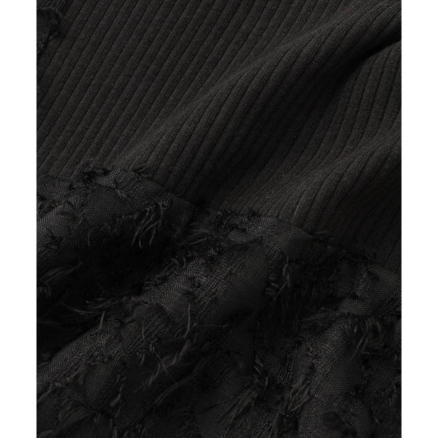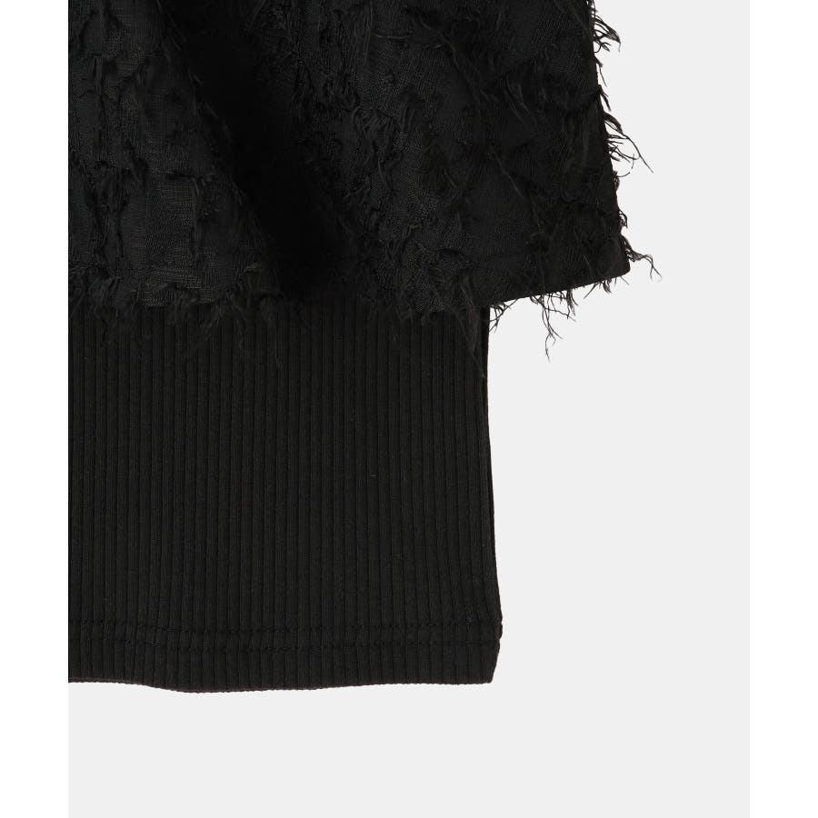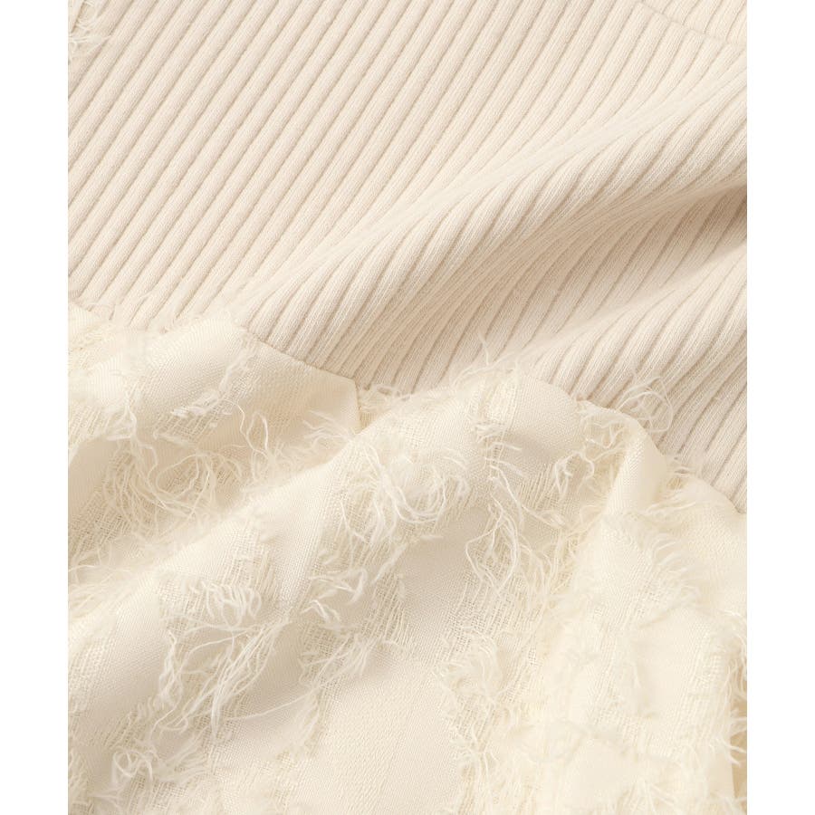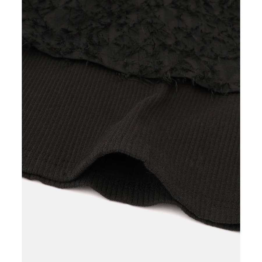 ・テレコカットソーとフェザー素材のビスチェがドッキングされたトップス。