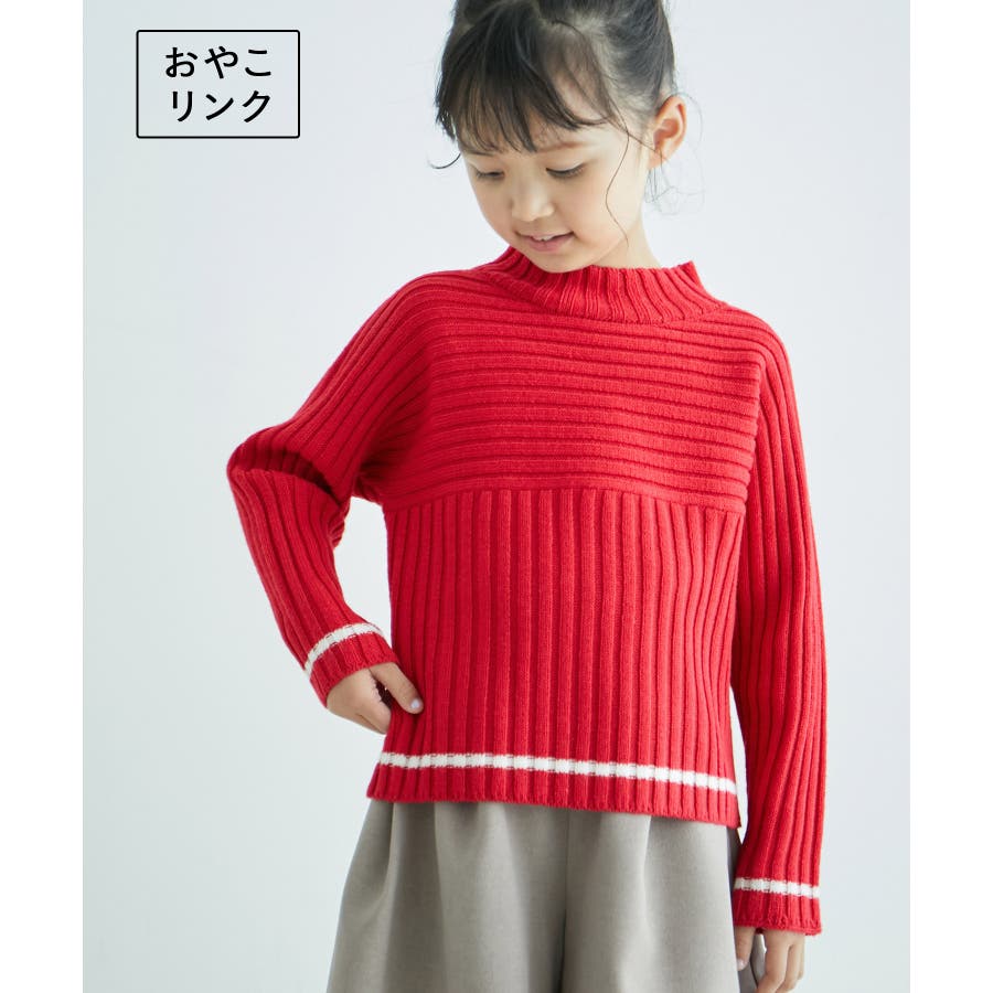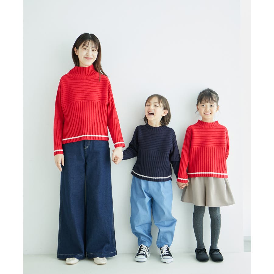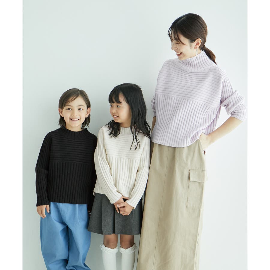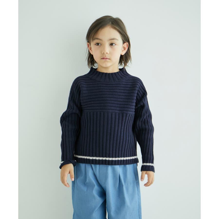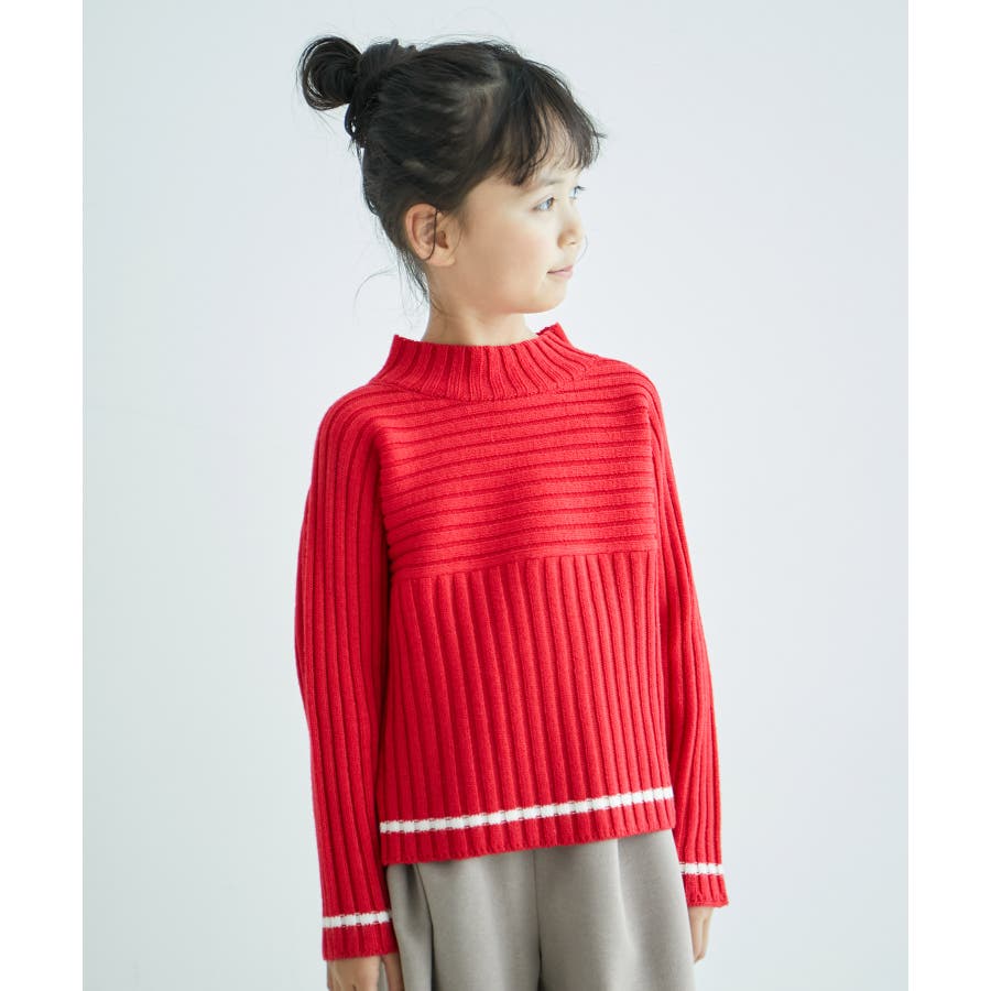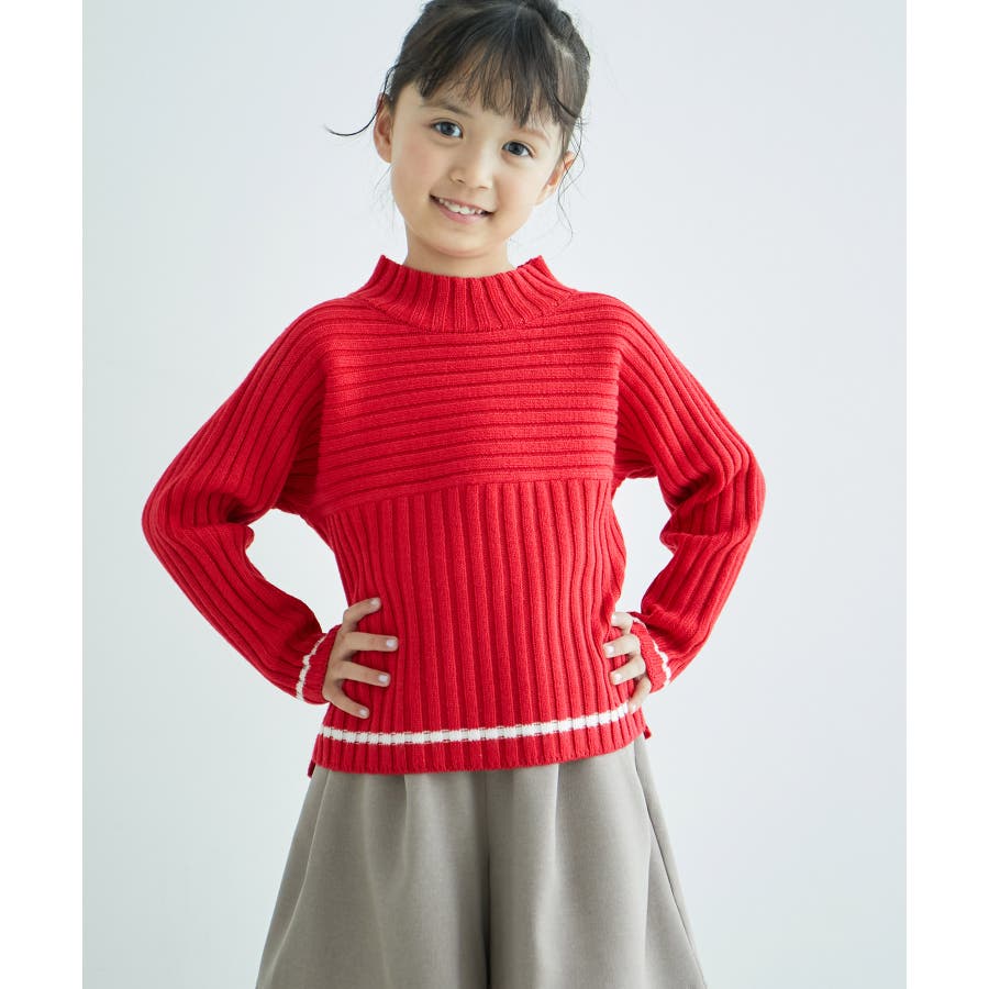 毎年人気のリブ切り替えニットプルオーバーが今年も登場! : 【素材感】 ・帯電防止・洗濯機OKの機能素材。 【デザイン・シルエット】 ・ダイナミックなワイドシルエットのハイネックプルオーバー。 ・身頃の切り替えで、リブ編みの方向を変えているのが特徴。 ・首もとゆったりでノンストレスに着られるアイテム。 ・前後差ヘムはサイドスリット入り。 【カラー】 ・カラーによって柄が異なります。 ブラック(01)キナリ(16):無地 ネイビー系(41):ネイビー×ホワイトのライン入り レッド系(61):レッド×ホワイトのライン入り 【スタイリングポイント】 ・柄物スカートや、モノトーンにはカラーパンツがお似合い。 ・レッドやホワイトはブルーのジーンズと好相性。 ・同シリーズで大人(品番:GDM54100)も展開しているので、親子お揃いもおすすめ。 ----------------------------- 裏地:なし 透け感:なし 伸縮性:ややあり 生地感・厚さ:やや厚手 ポケット:なし 季節:秋・冬 ----------------------------- ※撮影時の光、お使いのモニター環境によって色の見え方が違う場合がございます。 ※前回好評だったリブ切り替えニットプルオーバー(品番:GRM63000)と同型ですが、若干組成の混率が異なりますので、風合いは異なる場合がございます。 ※モデル身長、着用サイズは詳細画像をご確認ください。