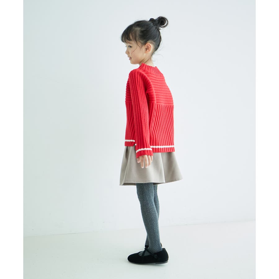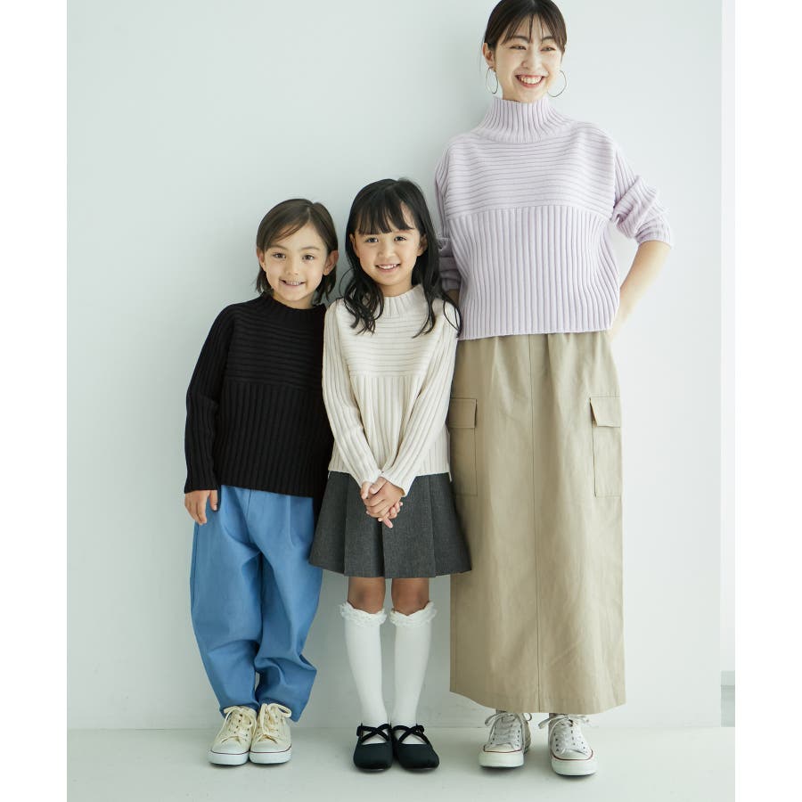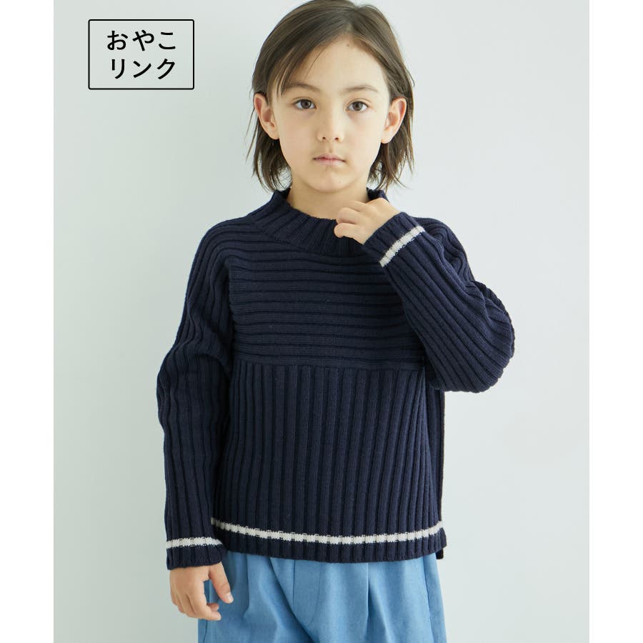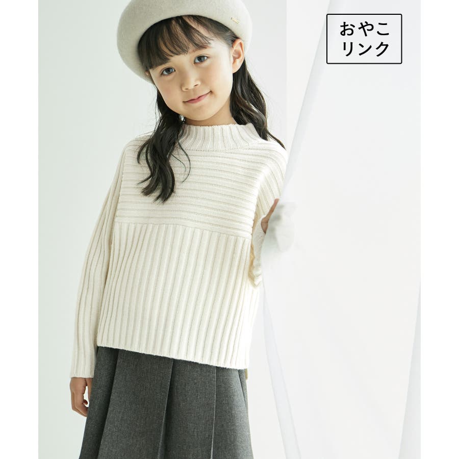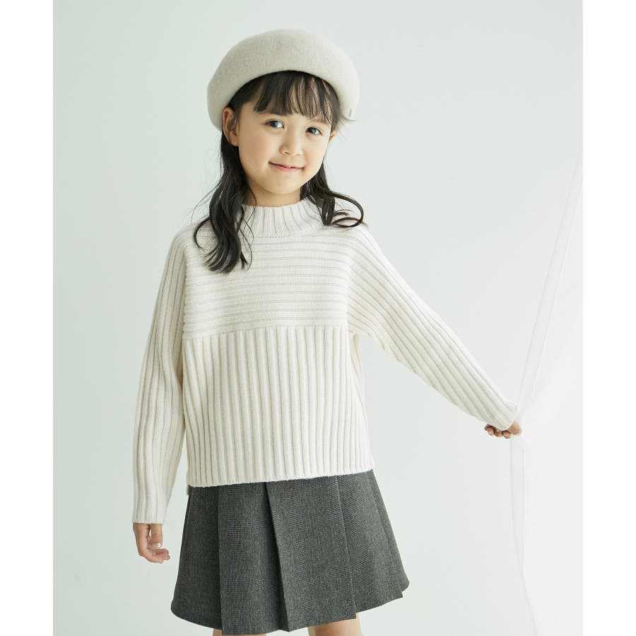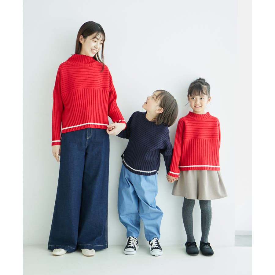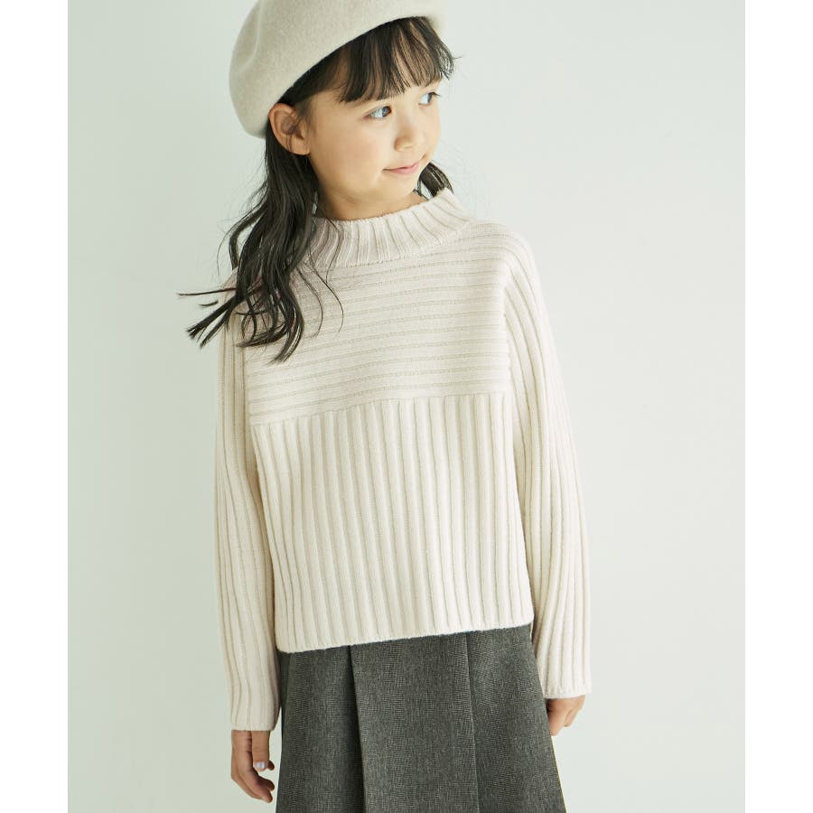 毎年人気のリブ切り替えニットプルオーバーが今年も登場! : 【素材感】 ・帯電防止・洗濯機OKの機能素材。 【デザイン・シルエット】 ・ダイナミックなワイドシルエットのハイネックプルオーバー。 ・身頃の切り替えで、リブ編みの方向を変えているのが特徴。 ・首もとゆったりでノンストレスに着られるアイテム。 ・前後差ヘムはサイドスリット入り。 【カラー】 ・カラーによって柄が異なります。 ブラック(01)キナリ(16):無地 ネイビー系(41):ネイビー×ホワイトのライン入り レッド系(61):レッド×ホワイトのライン入り 【スタイリングポイント】 ・柄物スカートや、モノトーンにはカラーパンツがお似合い。 ・レッドやホワイトはブルーのジーンズと好相性。 ・同シリーズで大人(品番:GDM54100)も展開しているので、親子お揃いもおすすめ。 ----------------------------- 裏地:なし 透け感:なし 伸縮性:ややあり 生地感・厚さ:やや厚手 ポケット:なし 季節:秋・冬 ----------------------------- ※撮影時の光、お使いのモニター環境によって色の見え方が違う場合がございます。 ※前回好評だったリブ切り替えニットプルオーバー(品番:GRM63000)と同型ですが、若干組成の混率が異なりますので、風合いは異なる場合がございます。 ※モデル身長、着用サイズは詳細画像をご確認ください。
