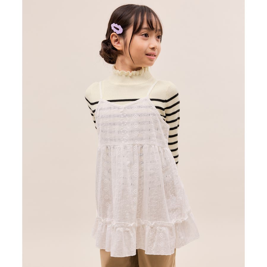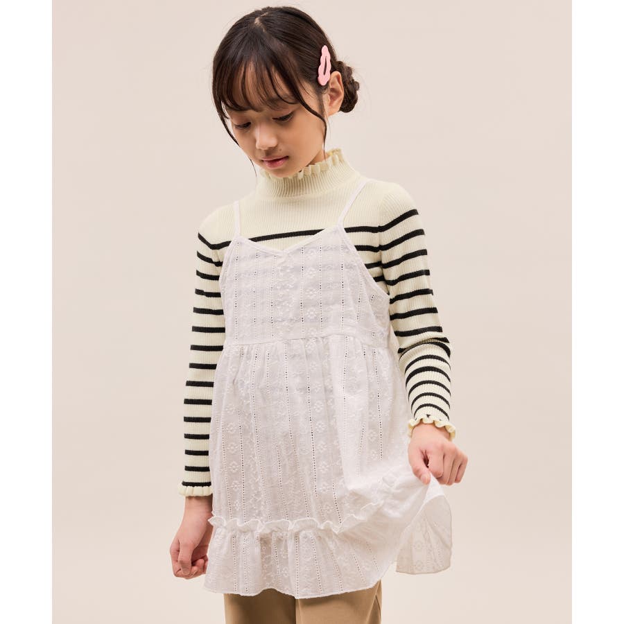・ジャンパースカートやサロペットのインナーとして、首元のフリルを覗かせる王道ガーリースタイル。