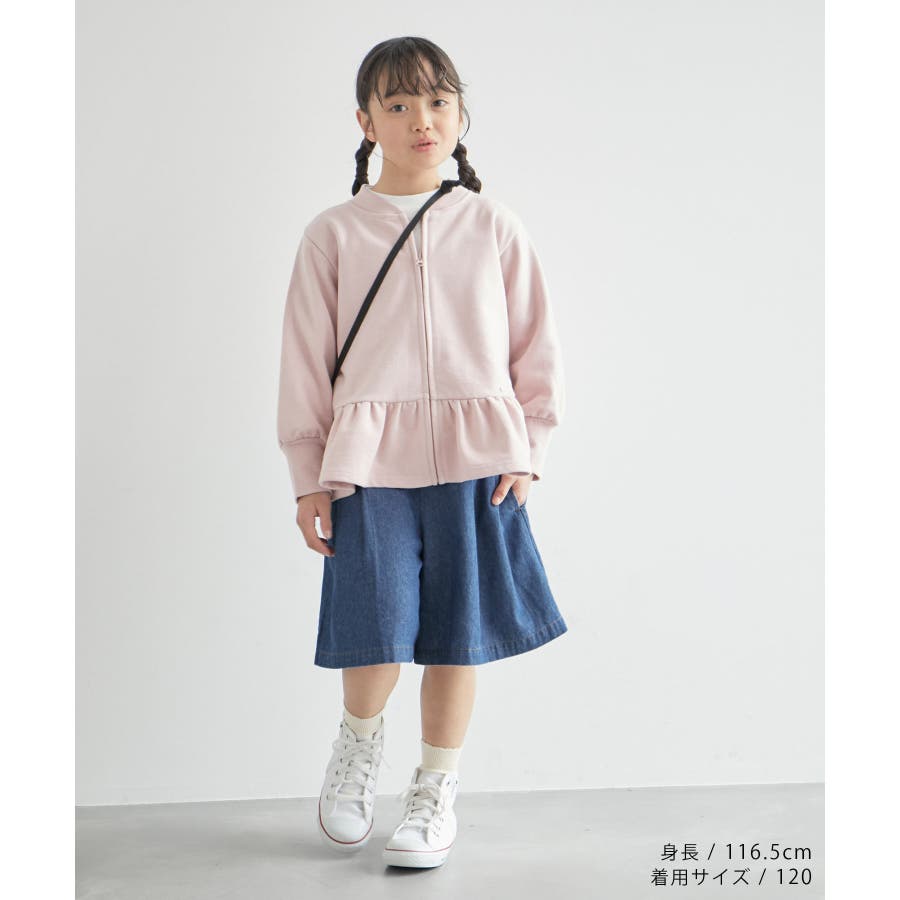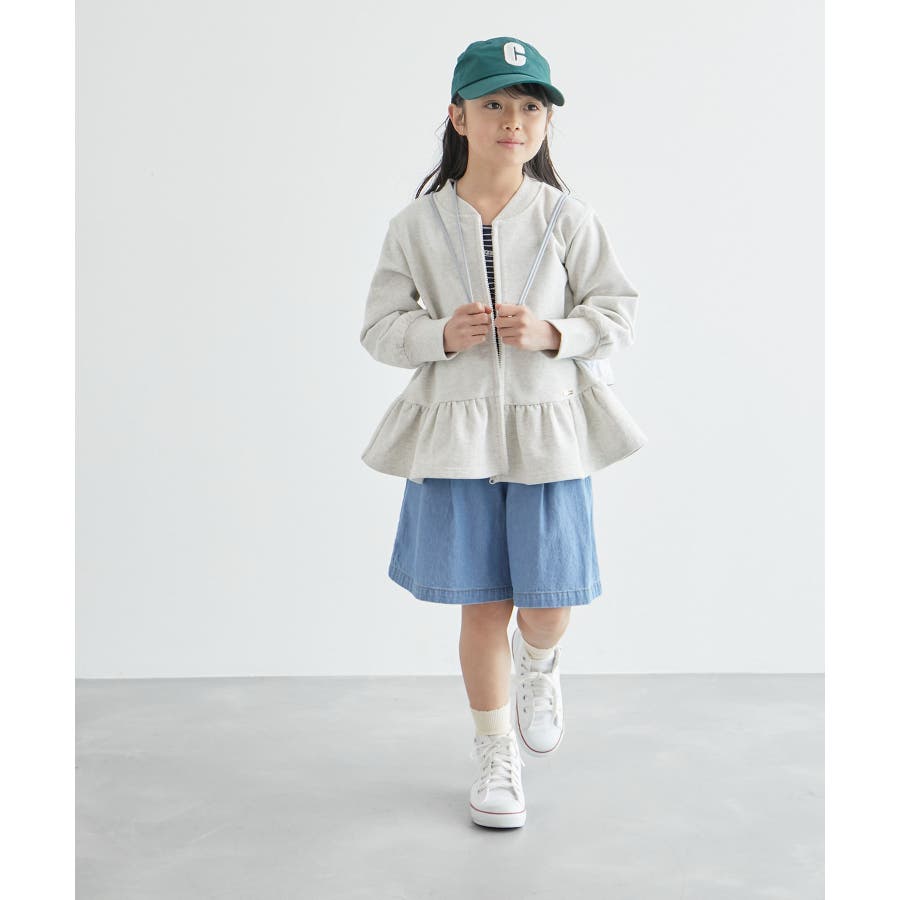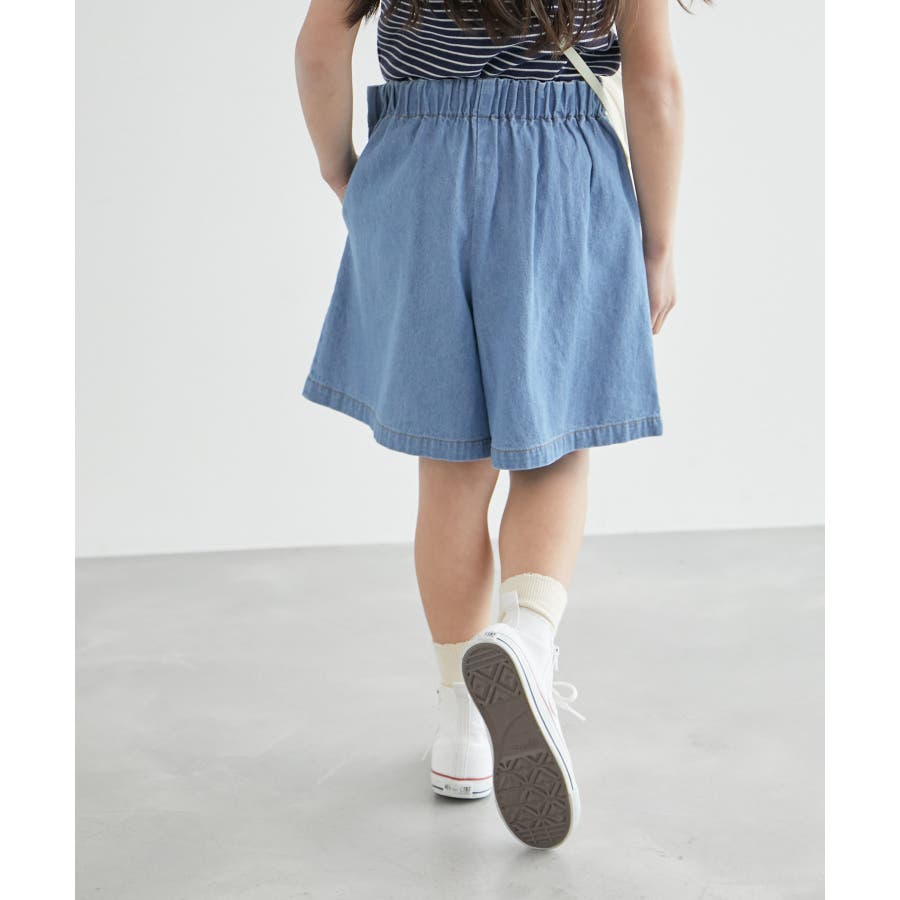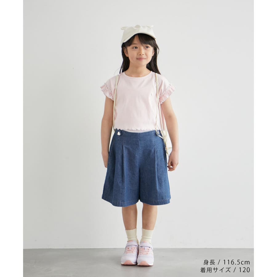 【デザイン・シルエット】 ・サイドベルトがポイントのキュロットスカート。 ・ベルトにはハートボタン付き。 ・後ろウエストはギャザー使いでラクチン。 ・内側のホールゴムでウエストの調整可能。 【カラー】 ・ネイビー、サックスブルーの2色展開。 【スタイリングポイント】 ・ポロシャツでスポーティーに、ブラウスでガーリーに着こなして。 ・ハイソックスを合わせるとキッズらしいコーディネートに。 ・トレンドのクロップド丈トップスとの合わせもおすすめ。 ----------------------------- 裏地:なし 透け感:なし 伸縮性:なし 生地感・厚さ:普通 ポケット:あり ウエスト:サイドから後ろゴム 季節:春夏 ----------------------------- ※撮影時の光、お使いのモニター環境によって色の見え方が違う場合がございます。 ※モデル身長:116.5cm 着用サイズ:120