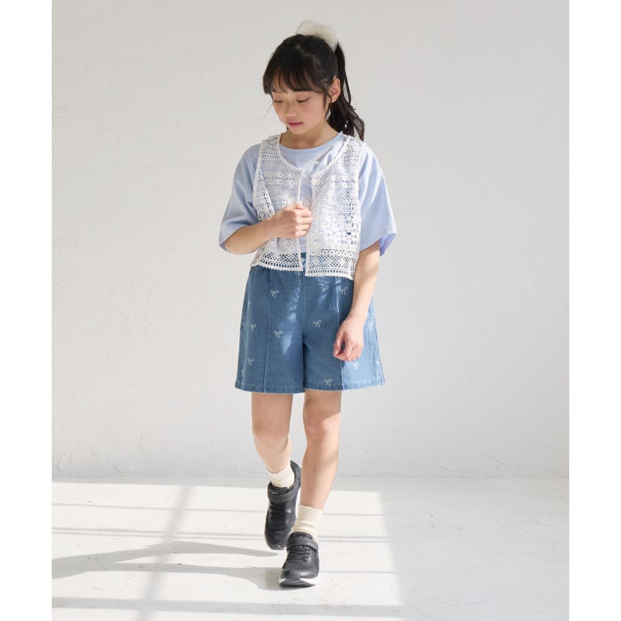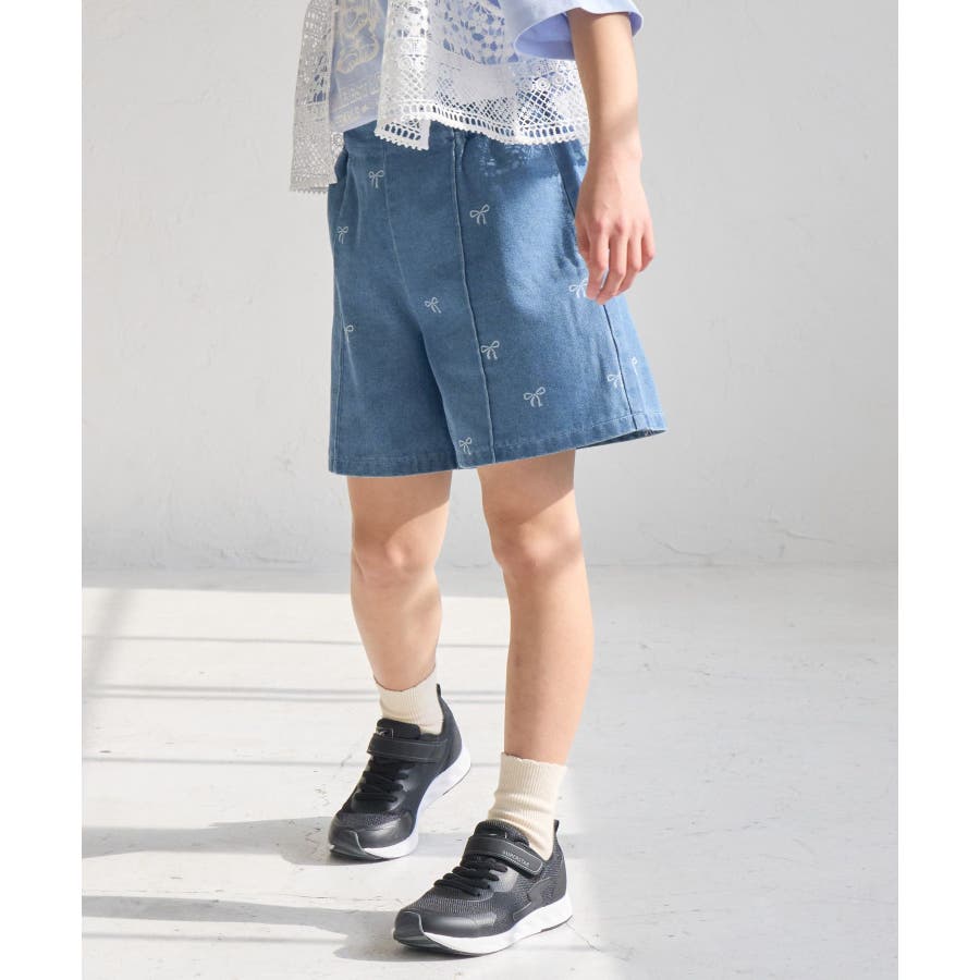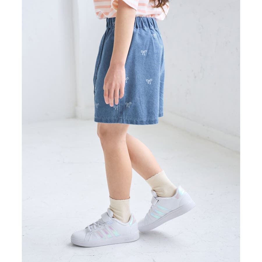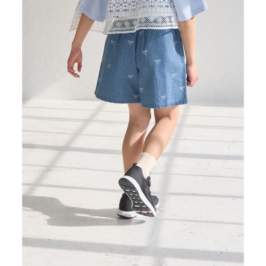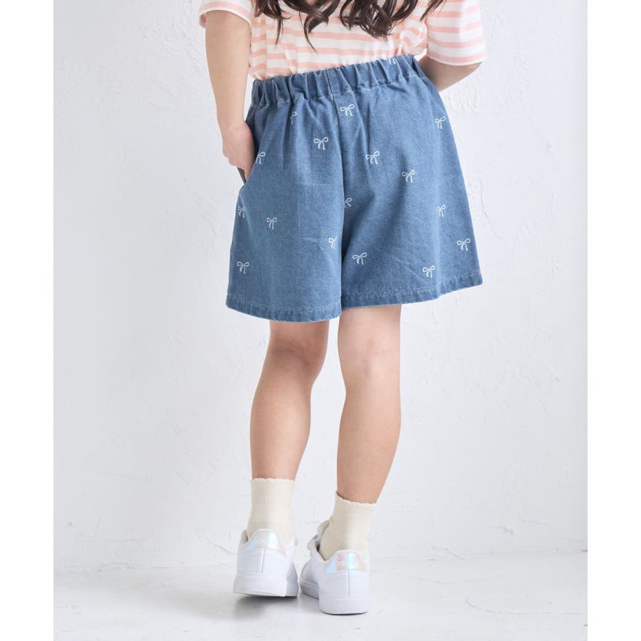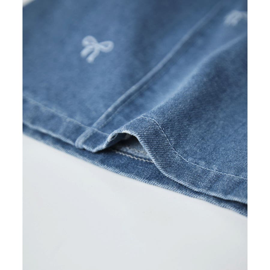 【素材感】 ・厚手すぎず、動きやすさのあるデニム素材。 【デザイン・シルエット】 ・バレエコアをイメージリボン柄がポイント。 ・フロントのピンタックが大人っぽく、すっきりとしたシルエットにこだわった1着。 【カラー】 ・ブラックデニムとブルーデニムの2色展開。 【スタイリングポイント】 ・すっきり見えのシルエットなので、ボリューム感のあるトップス合わせがおすすめ。 Sサイズ:95~115cm Mサイズ:115~135cm Lサイズ:135~155cm ----------------------------- 裏地:なし 透け感:なし 伸縮性:なし 生地感・厚さ:普通 ウエスト:後ろゴム、内側で調整可能 ポケット:あり 季節:春・夏・秋 ----------------------------- ※撮影時の光、お使いのモニター環境によって色の見え方が違う場合がございます。 ※モデル身長:122cm 着用サイズ:M