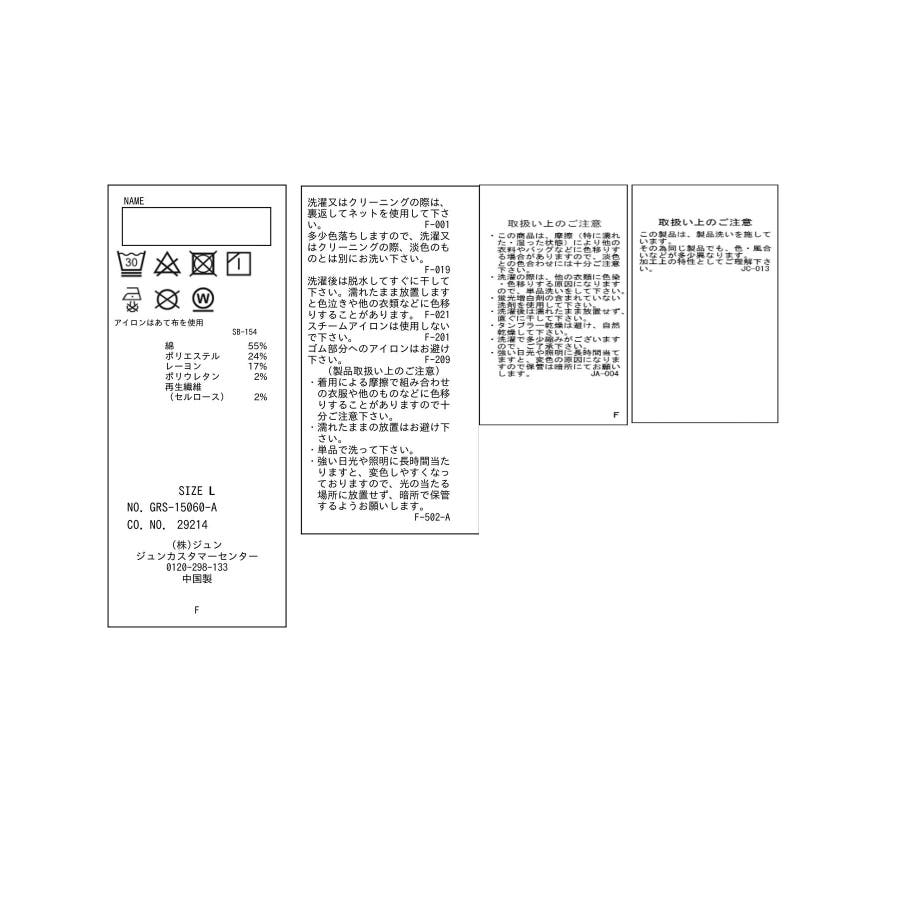 | 素材 | ブラック系(02):綿 55% ポリエステル 24% レーヨン 17% ポリウレタン 2% 再生繊維(セルロース) 2%|サックス(48):綿 55% ポリエステル 24% レーヨン 17% ポリウレタン 2% 再生繊維(セルロース) 2% |