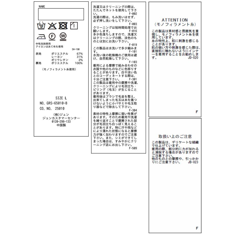 | 素材 | (表地) ポリエステル 67% レーヨン 31% ポリウレタン 2% (裏地) ポリエステル 100% |