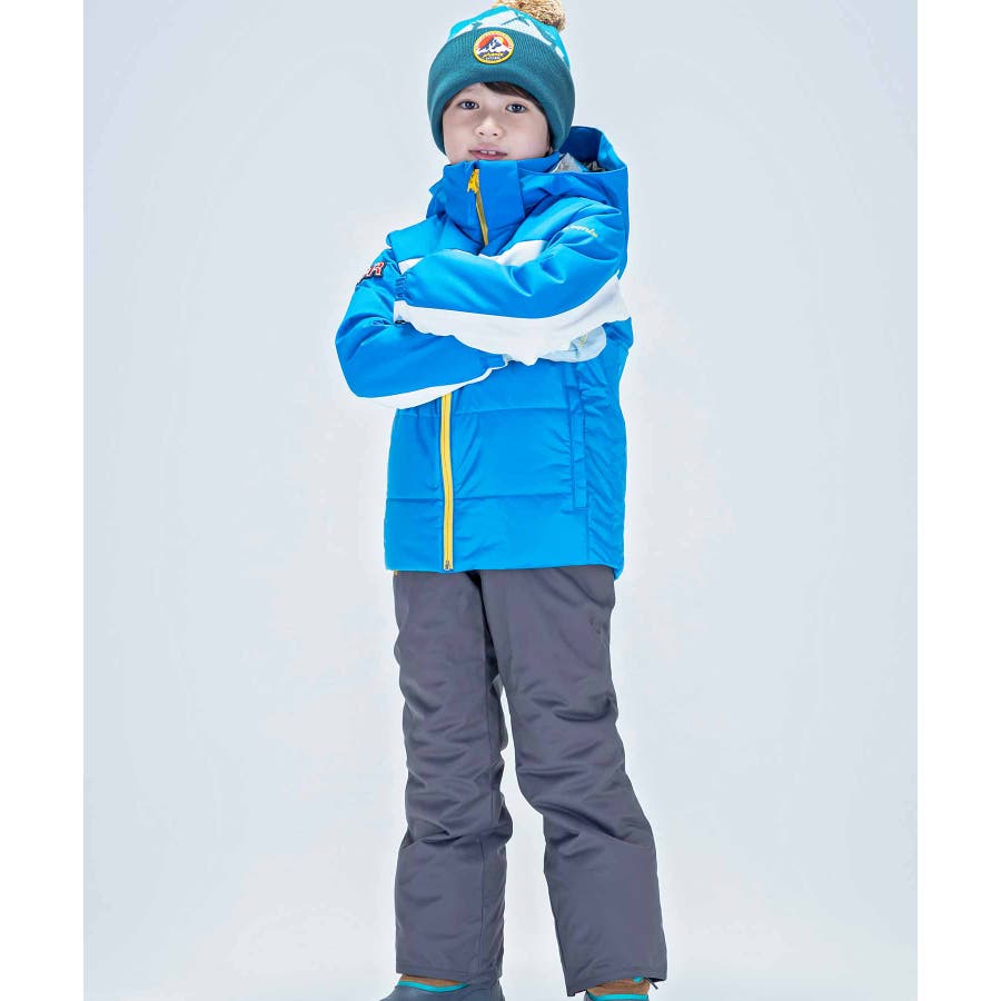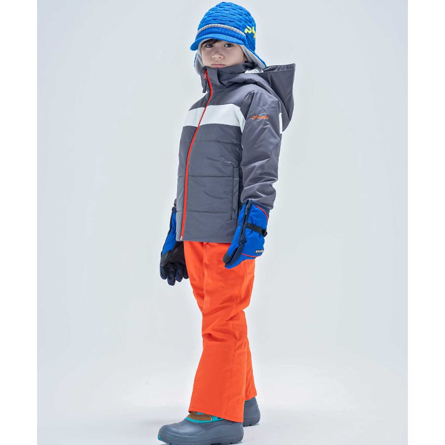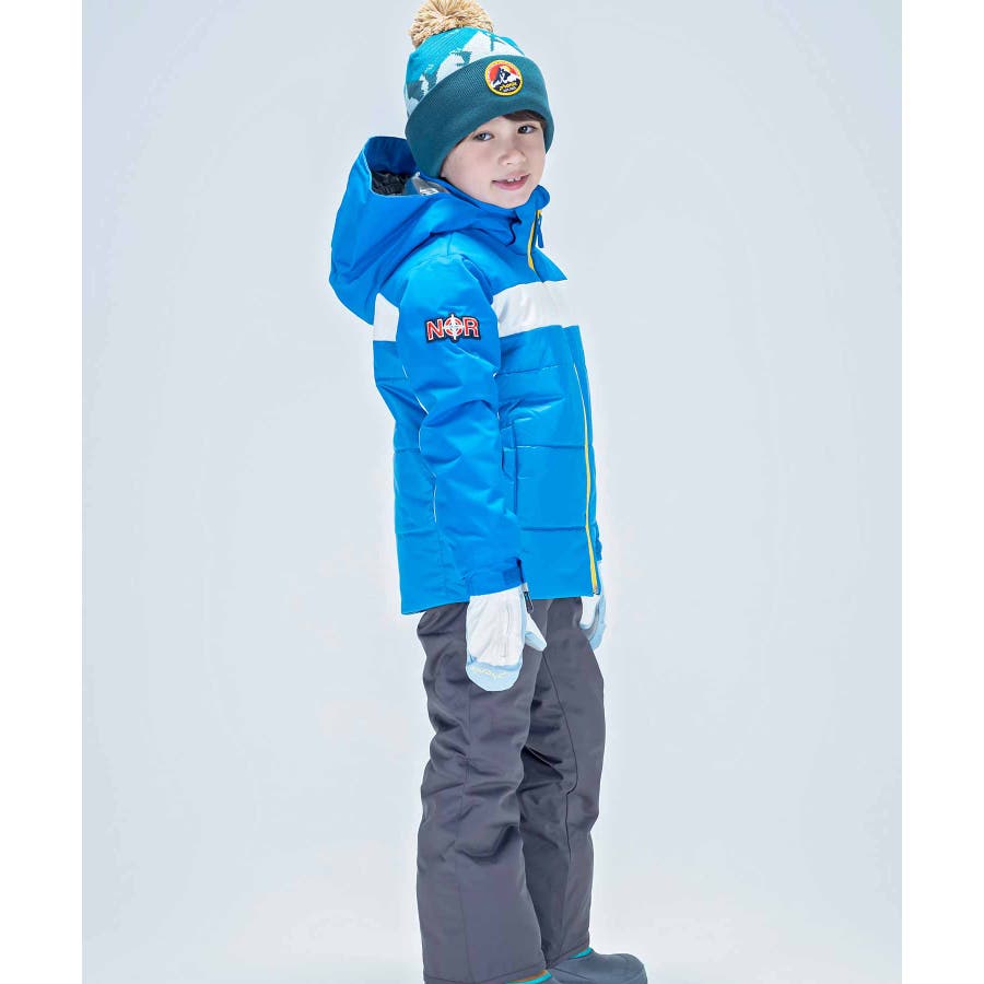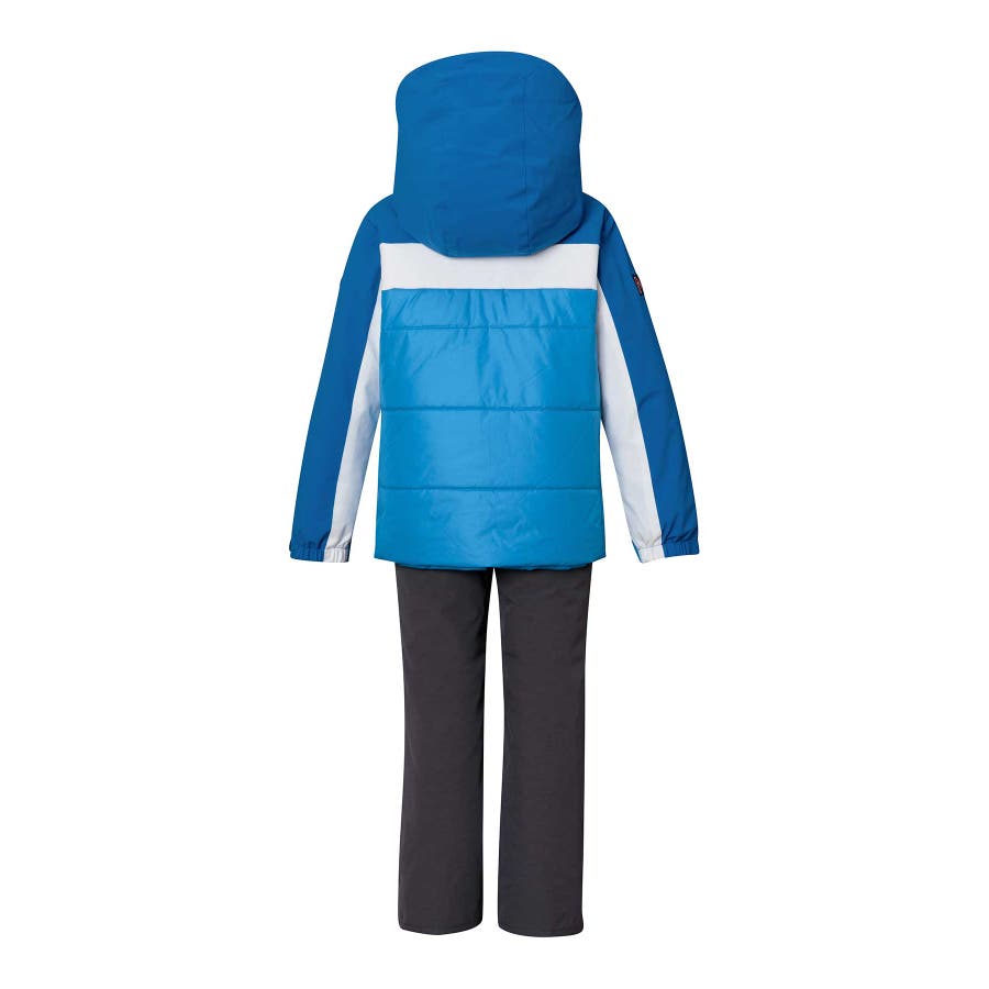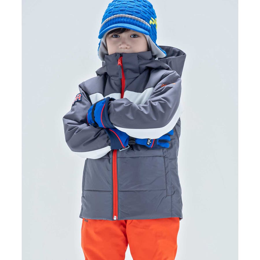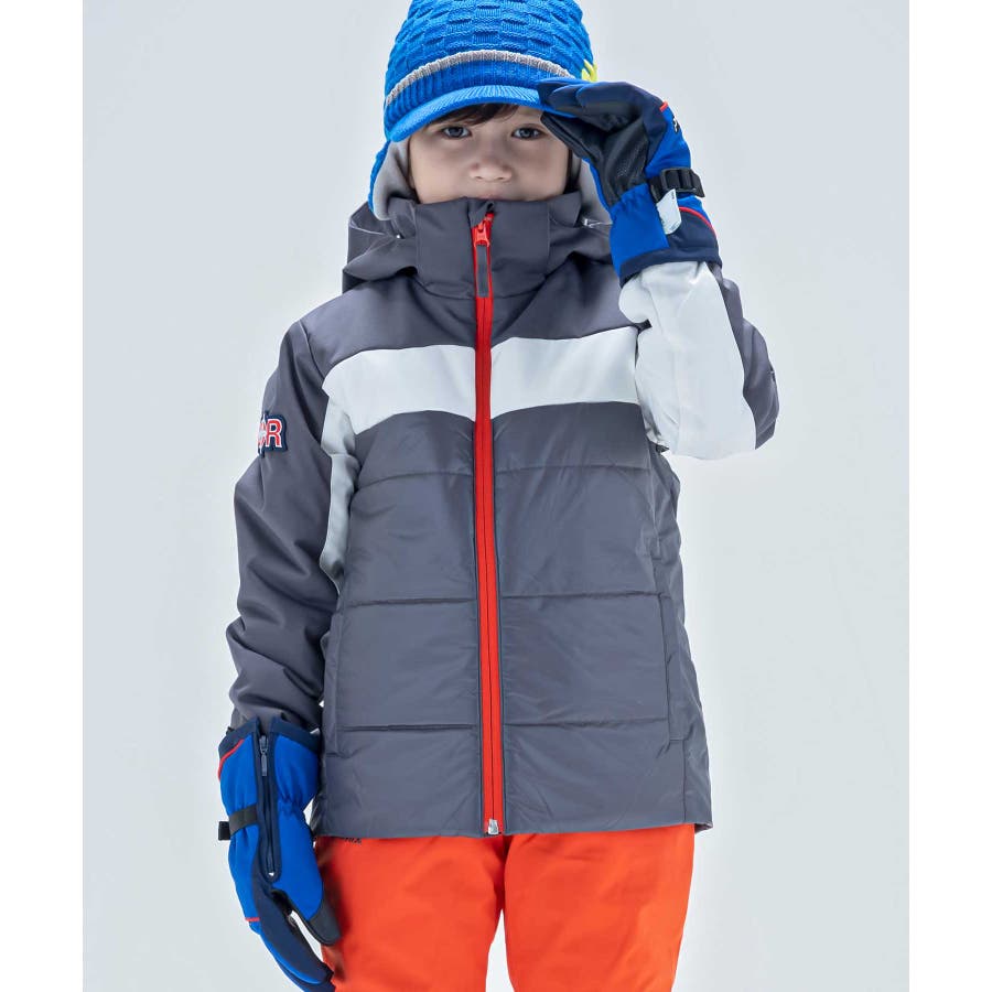 キルティングコンビネーションデザインのジュニア用の2ピースウェア。耐水圧10000mmの2WAYストレッチ生地を使用。袖丈、股下の長さが調整できるスクスク機能付き。