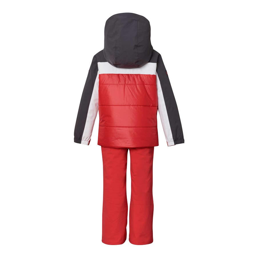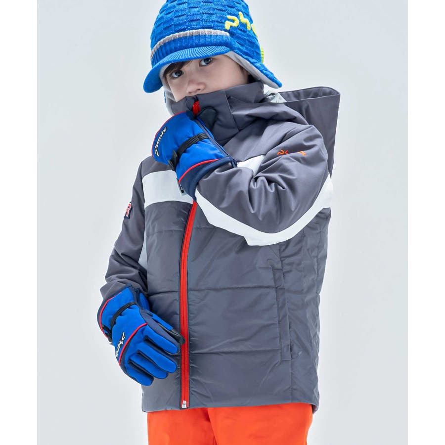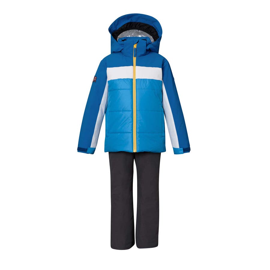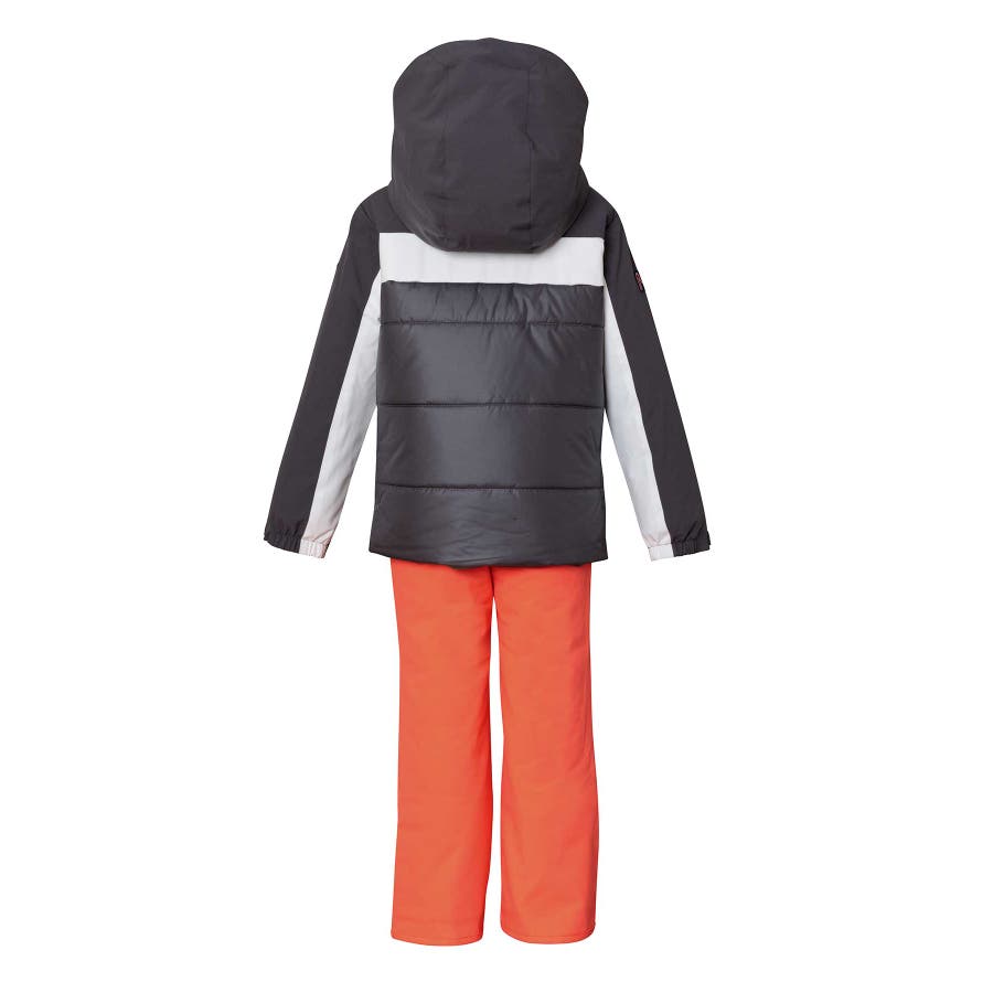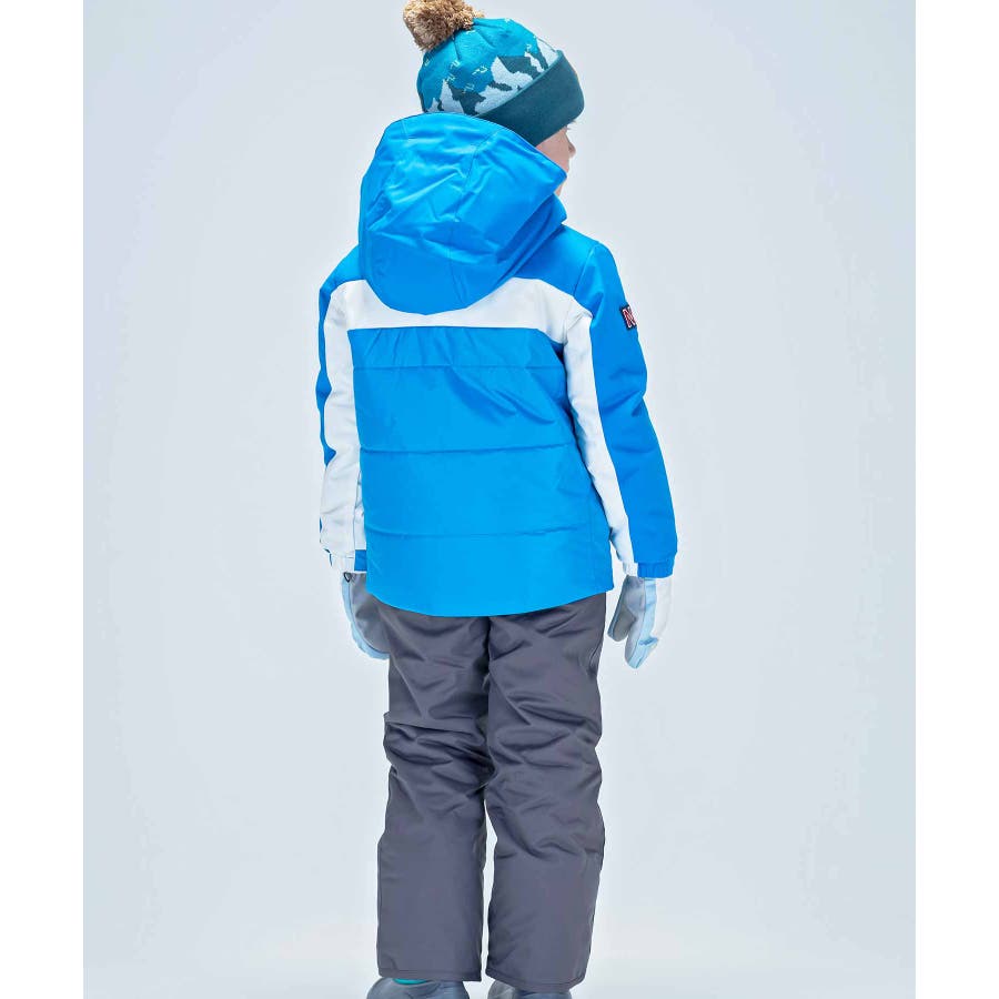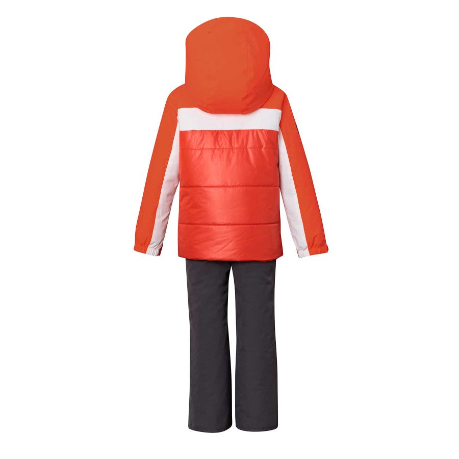キルティングコンビネーションデザインのジュニア用の2ピースウェア。耐水圧10000mmの2WAYストレッチ生地を使用。袖丈、股下の長さが調整できるスクスク機能付き。
