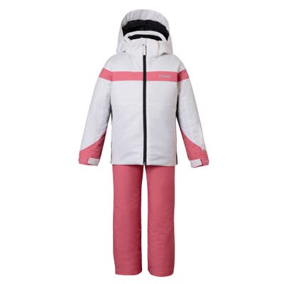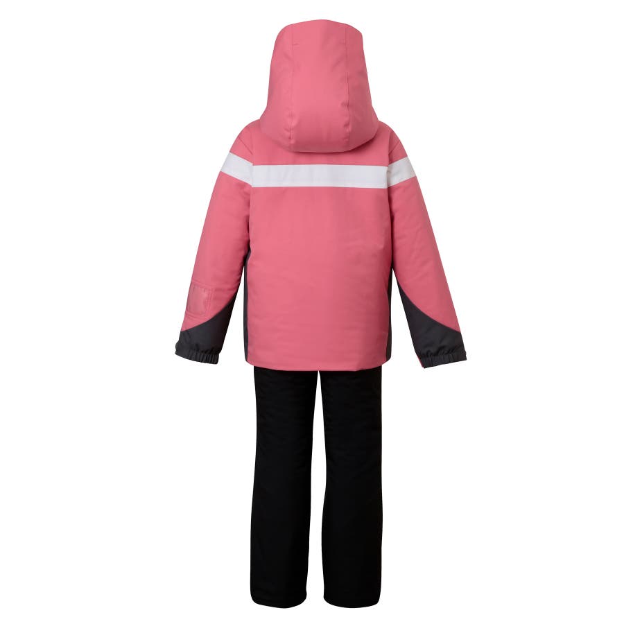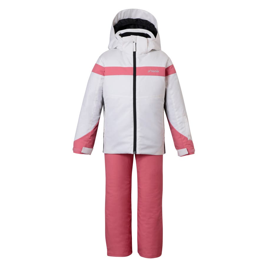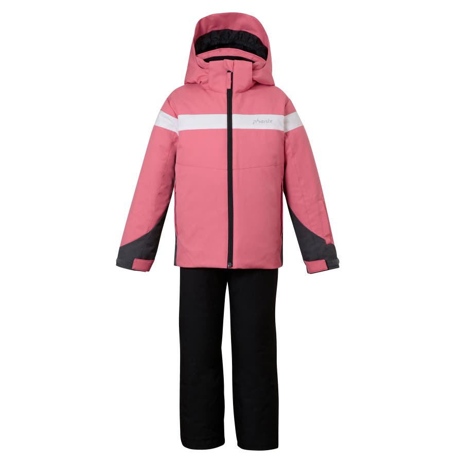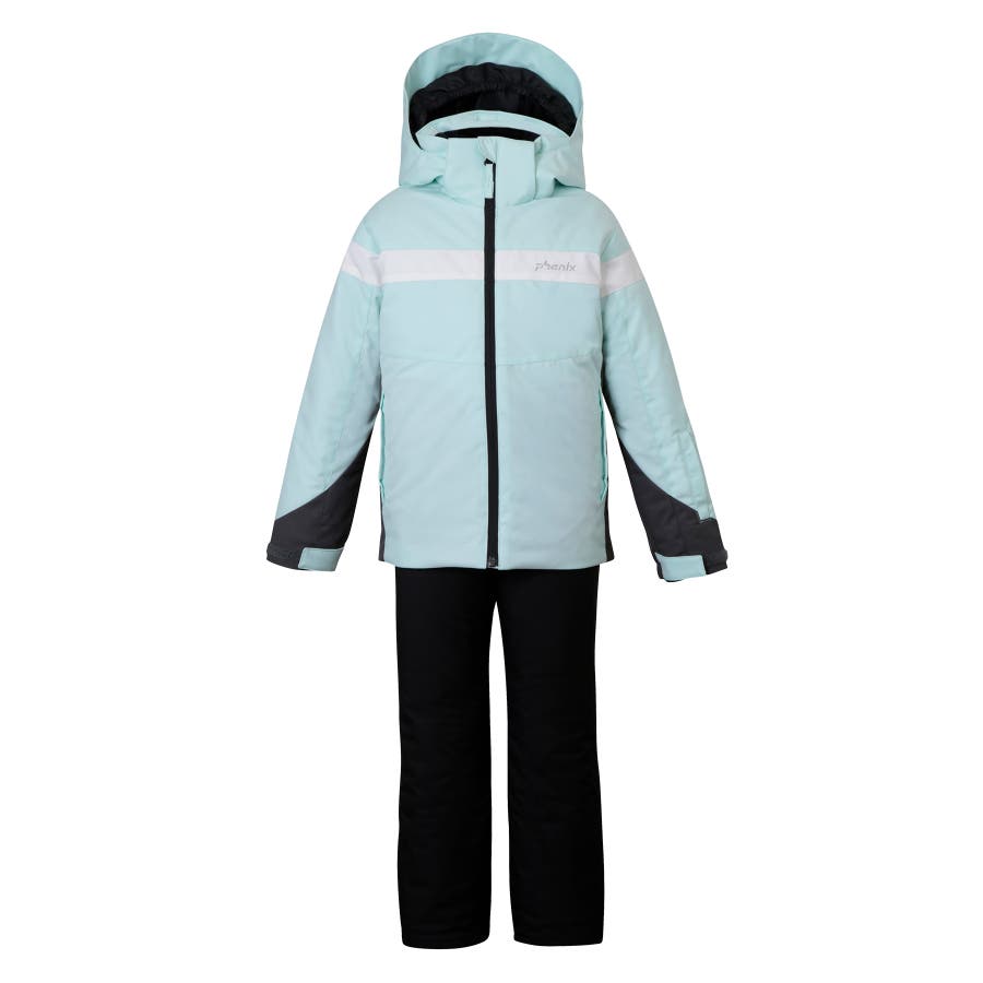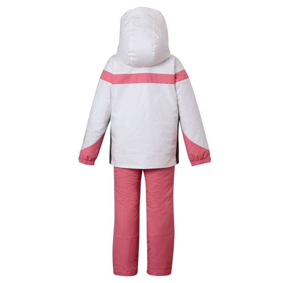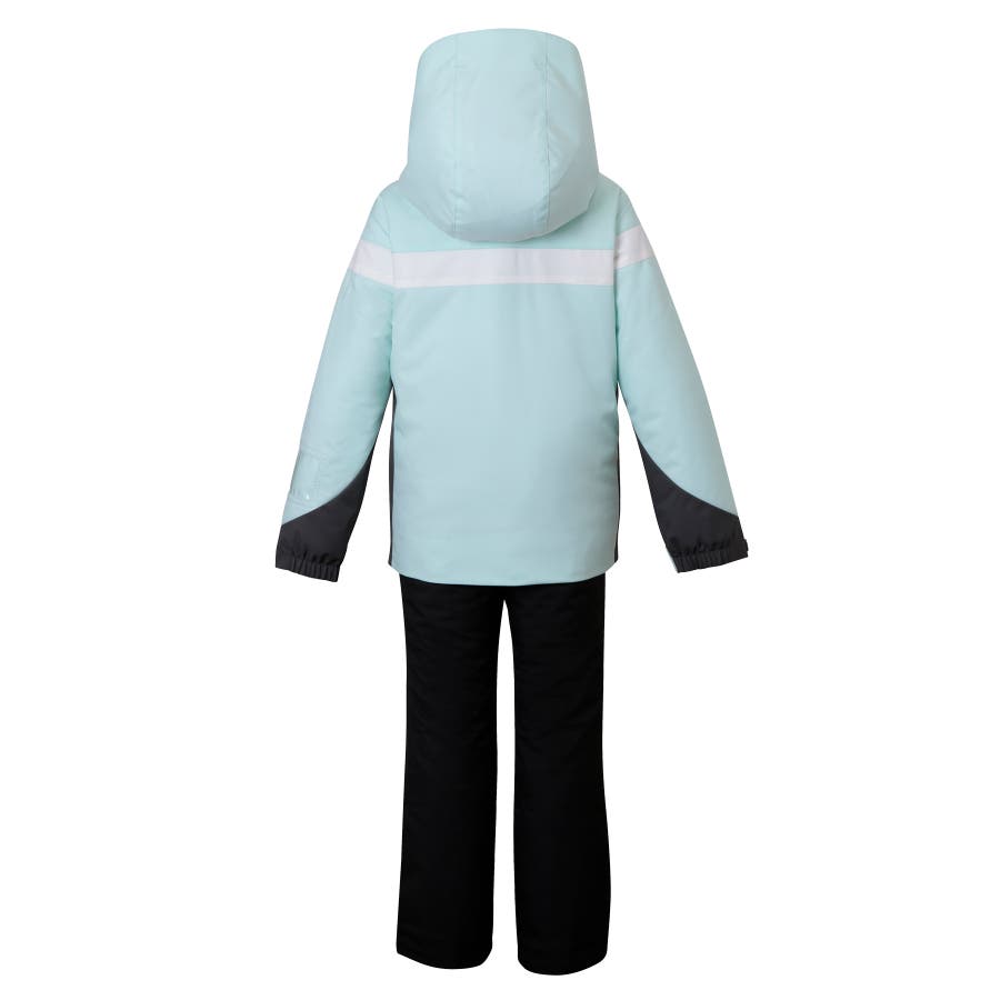 鮮やかなカラーブロック切り替えが特徴の子供用スキーウェア上下セット。