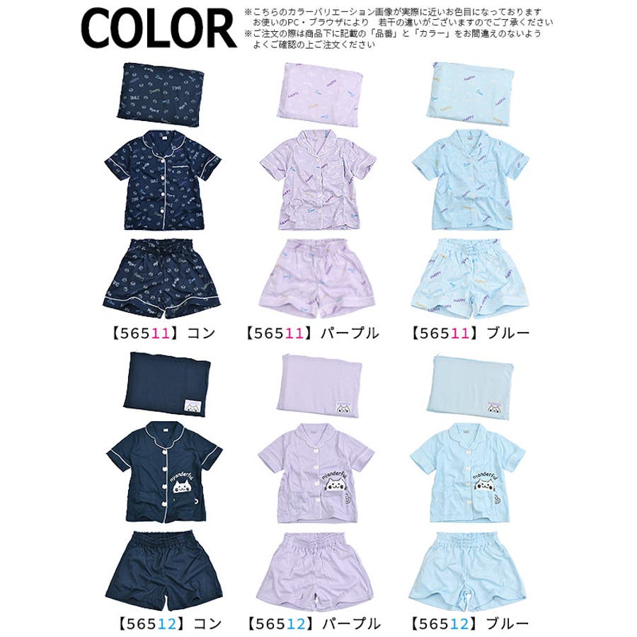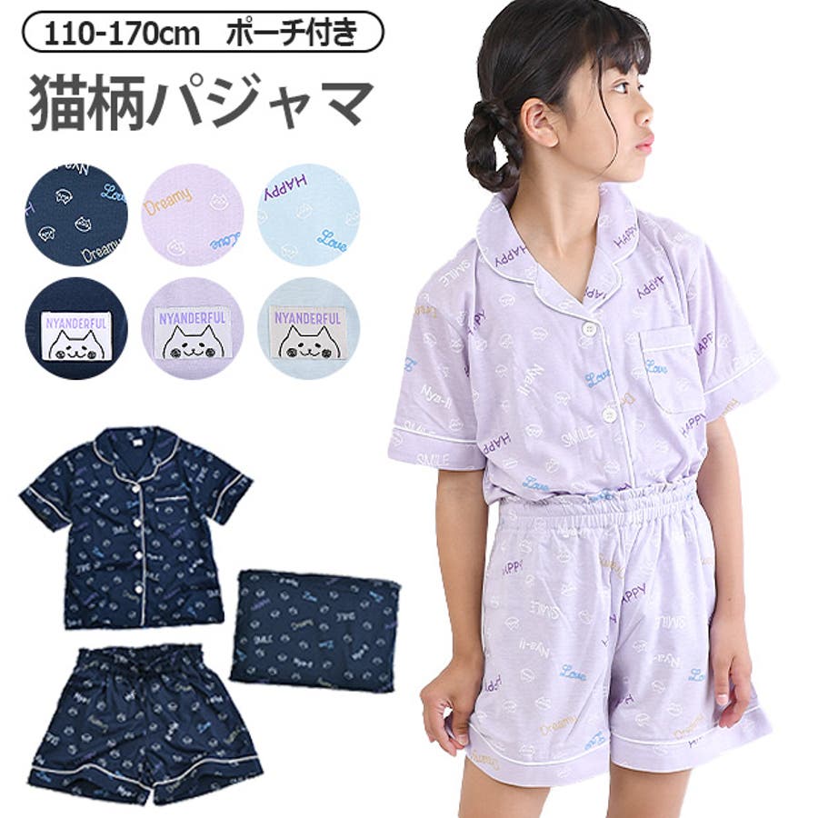 半袖パジャマ 3点セット 収納ポーチ付き 猫柄 パジャマ キッズ 前開き パジャマ キッズ 半袖 ボタン パジャマ 女の子 ルームウェア 上下セット かわいい 寝巻き 寝間着 パジャマ 旅行用 コンパクト ネコ 猫 ねこ nyanderful 子供服 コン パープル ブルー キッズ ジュニア 110cm 120cm 130cm 140cm 150cm 160cm 170cm