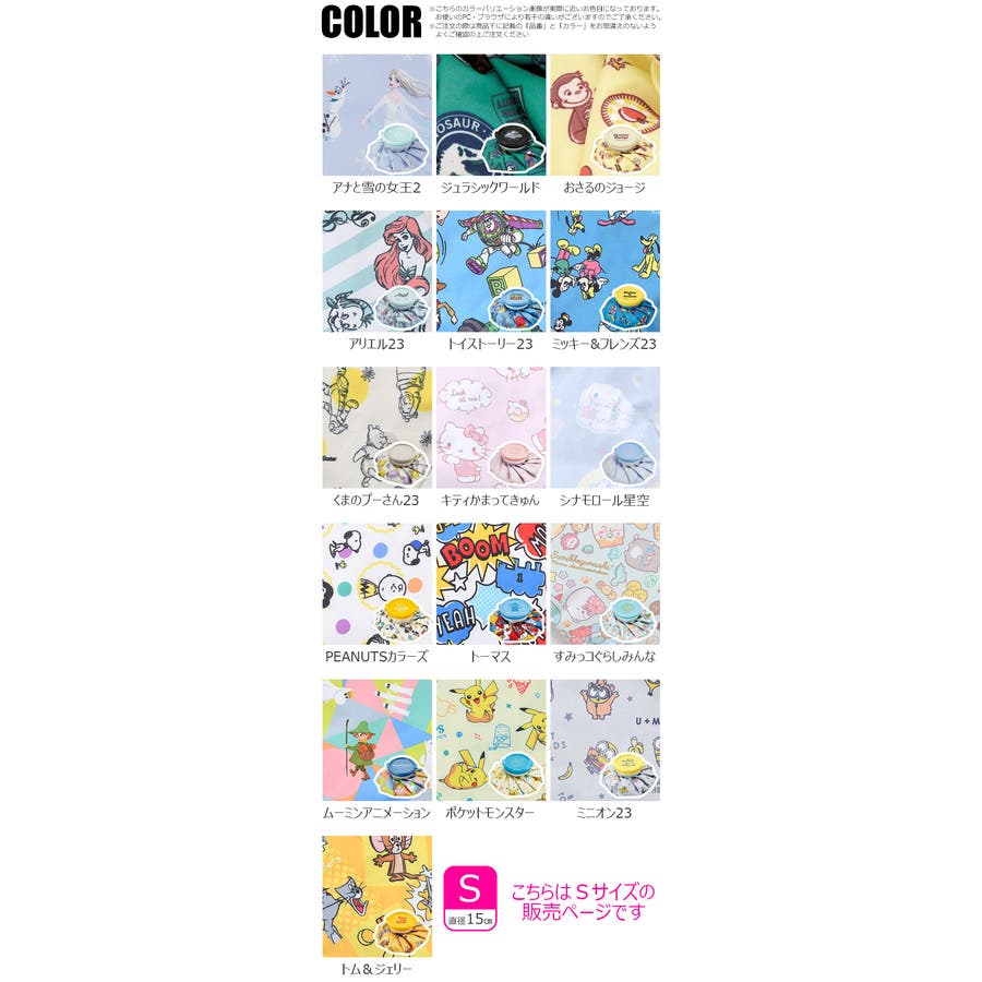 カラー | S4)634079・アリエル23 / S5)634086・トイストーリー23 / S6)634055・ミッキー&フレンズ23 / S7)634062・くまのプーさん23 / S8)639050・キティかまってきゅん / S9)639067・シナモロール星空 / S10)636493・PEANUTSカラーズ / S11)635243・トーマス / S12)639074・すみっコぐらしみんな / S13)647451・ム-ミンアニメ-ション / S14)584718・ポケットモンスター / S15)649127・ミニオン23 / S16)635410・トム&ジェリー / S1)676260・アナと雪の女王2 / S2)653780・ジュラシックワールド / S3)653827・おさるのジョージ |