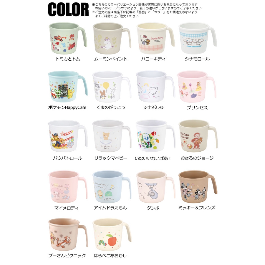 カラー | D1-666681・トミカとトム / D2-663154・ムーミンペイント / D3-676574・ハローキティ / D4-676826・シナモロール / D5-660528・ポケモンHappyCafe / D6-627972・くまのがっこう / D7-669576・シナぷしゅ / D8-657276・プリンセス / D9-662690・パウパトロール / D10-618277・リラックマベビー / D11-616334・いないいないばあ! / D12-616389・おさるのジョージ / D13-618345・マイメロディ / D14-618437・アイムドラえもん / D15-614781・ダンボ / D16-615009・ミッキー&フレンズ / D17-615184・プーさんピクニック / D18-627378・はらぺこあおむし |